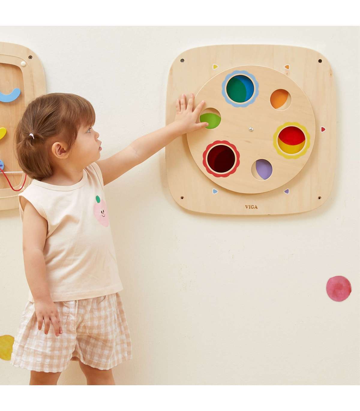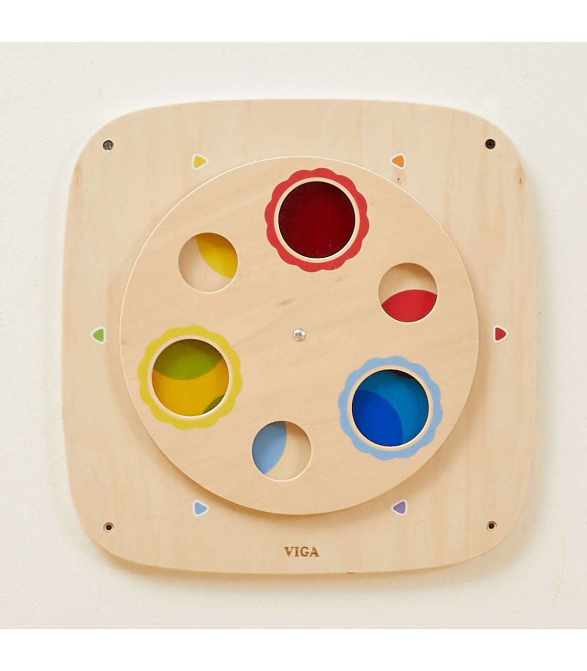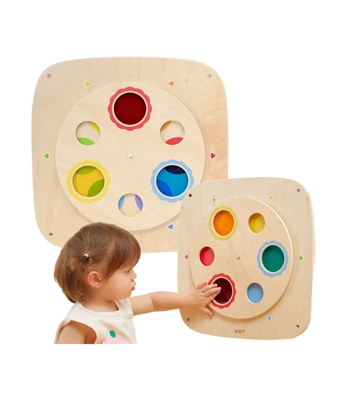 Откройте волшебный мир цветов с этой интерактивной деревянной доской от VIGA! Эта обучающая игрушка создана, чтобы в веселой и практичной форме научить детей теории цвета и причинно-следственным связям. Благодаря вращающейся верхней панели ребёнок может экспериментировать со смешиванием цветов, создавая новые оттенки. Панель прочная, безопасная и легко крепится на стену, что позволяет экономить место на полу. Это идеальное дополнение к детской комнате, детскому саду или игровому уголку.