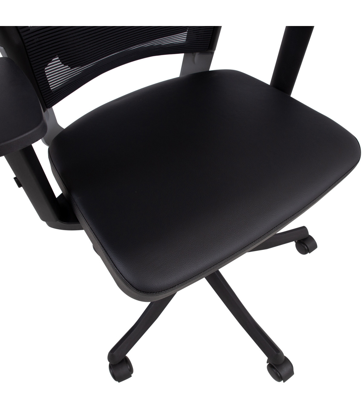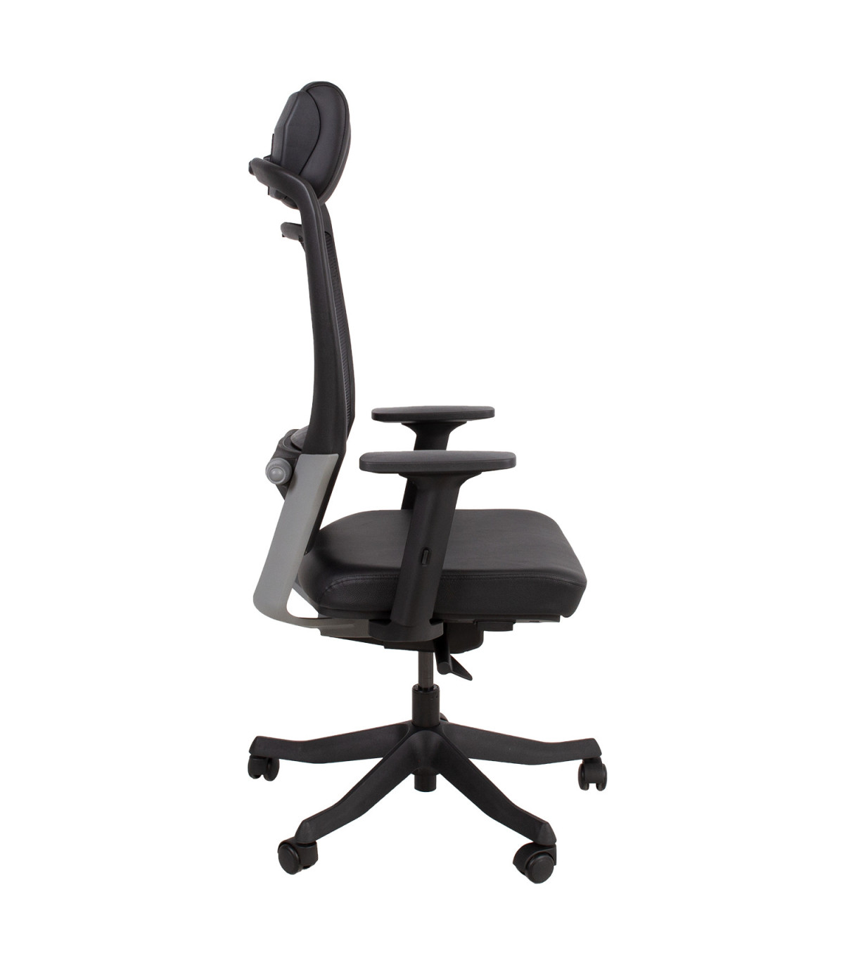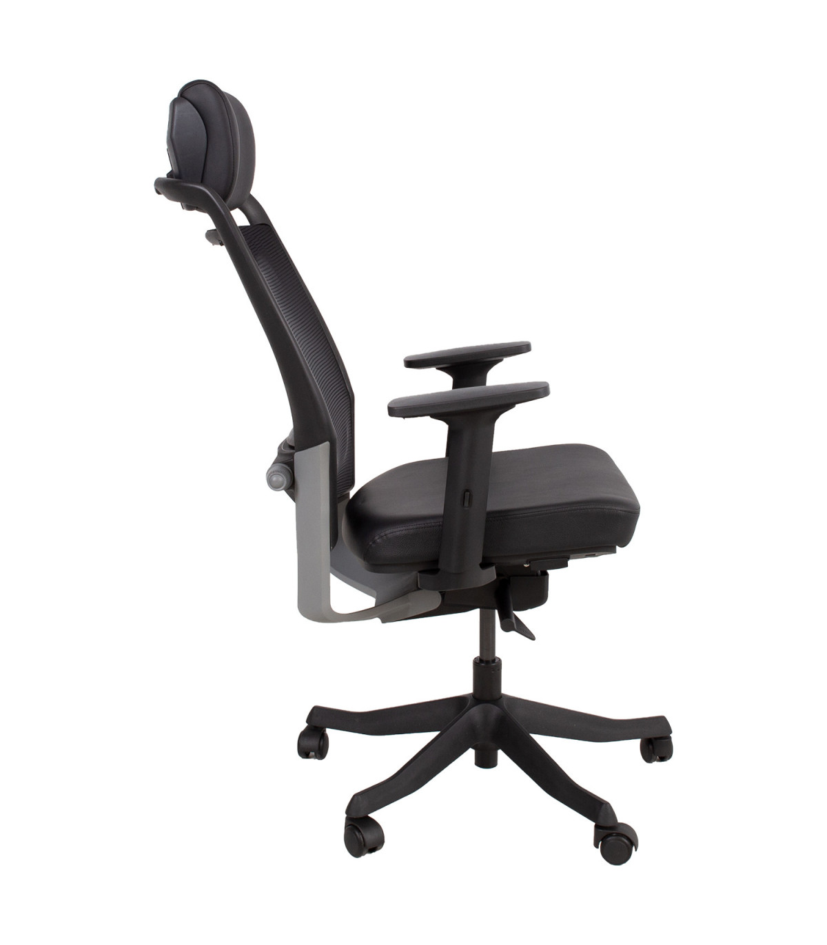 Рабочий стул FULKRUM 62x70xH97-107см, черная кожа. Материал чехла сиденья: кожа. Спинка покрыта сеткой из полиэстера, что обеспечивает хорошую вентиляцию. Цвет оправы: чёрный / серебристый. Механизмы и регулировки: автоматический синхронизированный механизм наклона-натяжения самонастраивает наклонное усилие в соответствии с весом пользователя. Регулируемая поясничная поддержка. Пневматическая регулировка высоты сиденья. Регулируемые в трех направлениях черные пластиковые подлокотники: регулировка высоты 20-30 см, регулировка глубины и угла наклона. Регулируемая высота подголовника. Чёрная 5-контактная пластиковая основа D70см, 50 мм пластиковые колесики. Размеры: высота 114-129см, высота сиденья 41-57см, глубина сиденья 41-48см, ширина сиденья 48см. Максимальная грузоподъемность 120 кг.