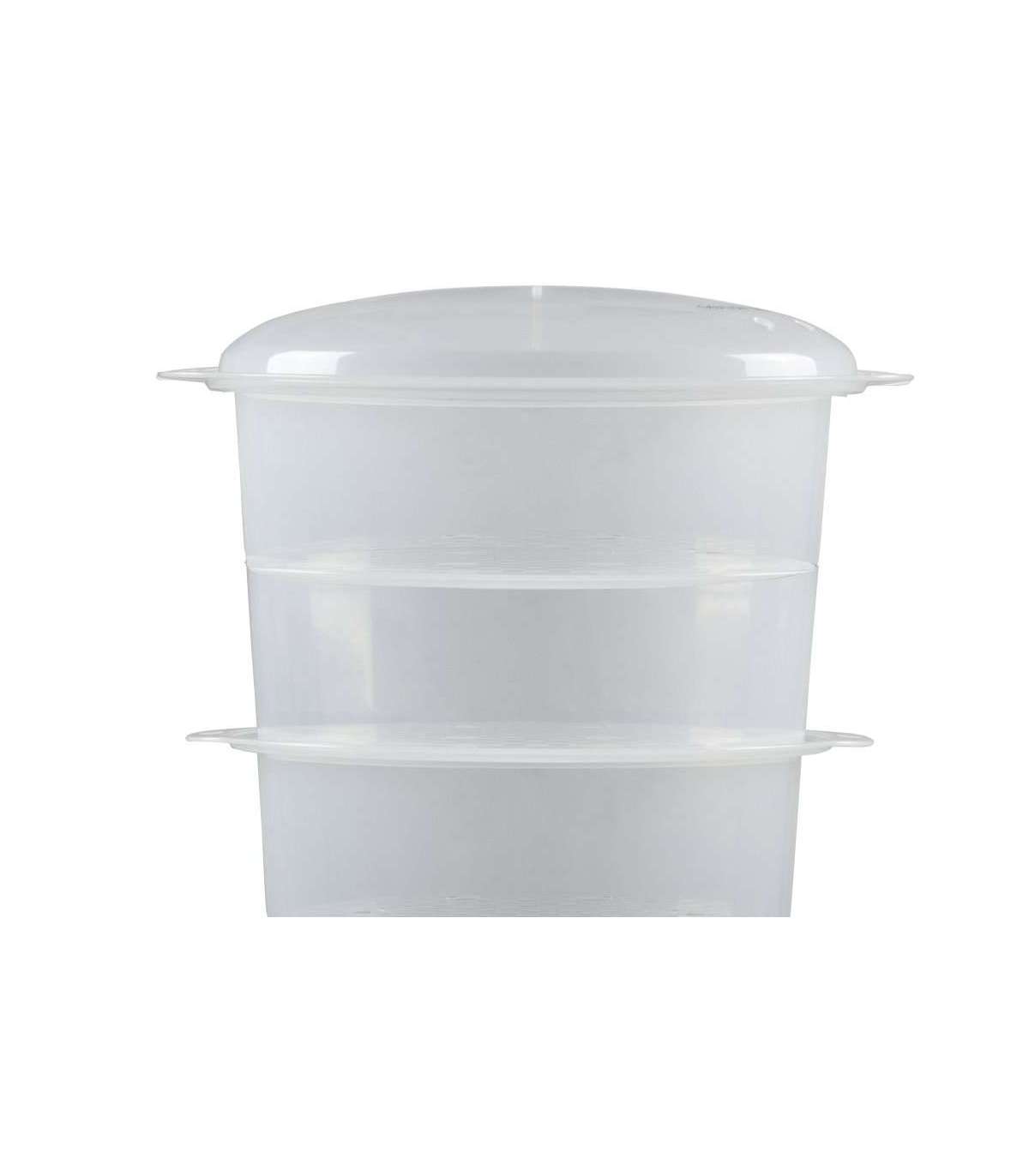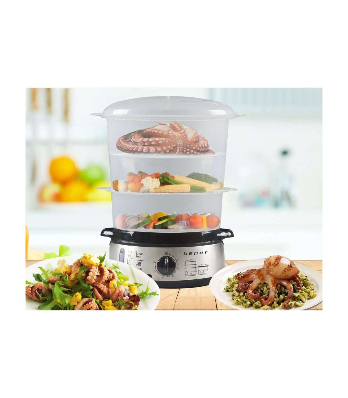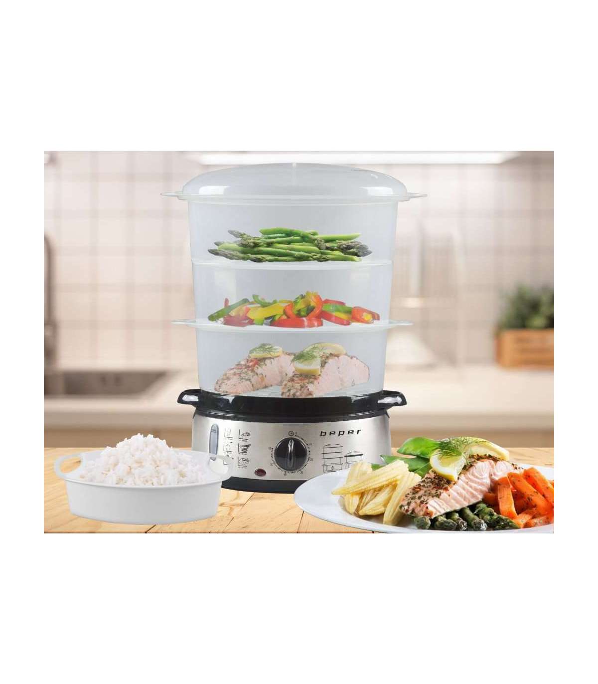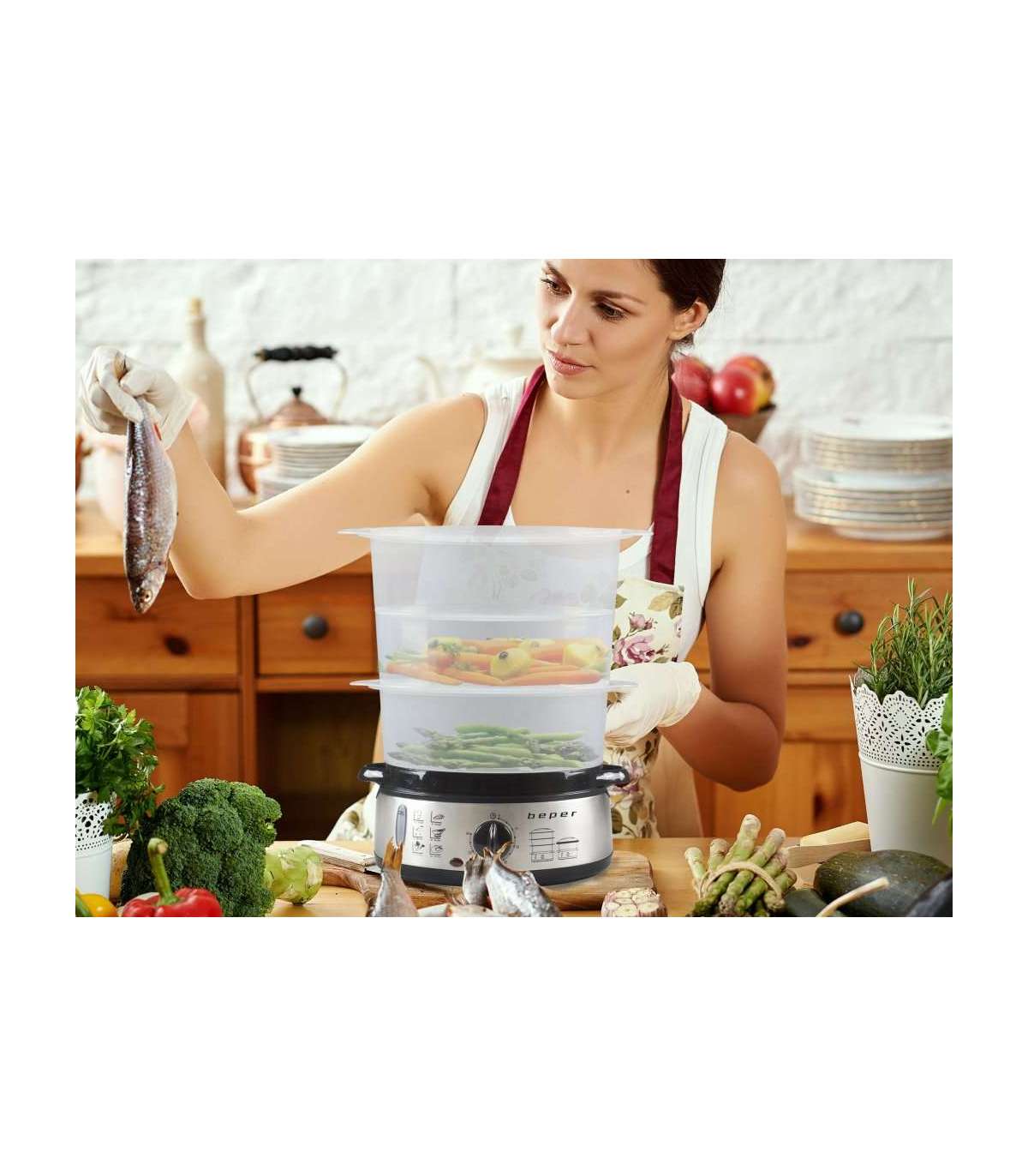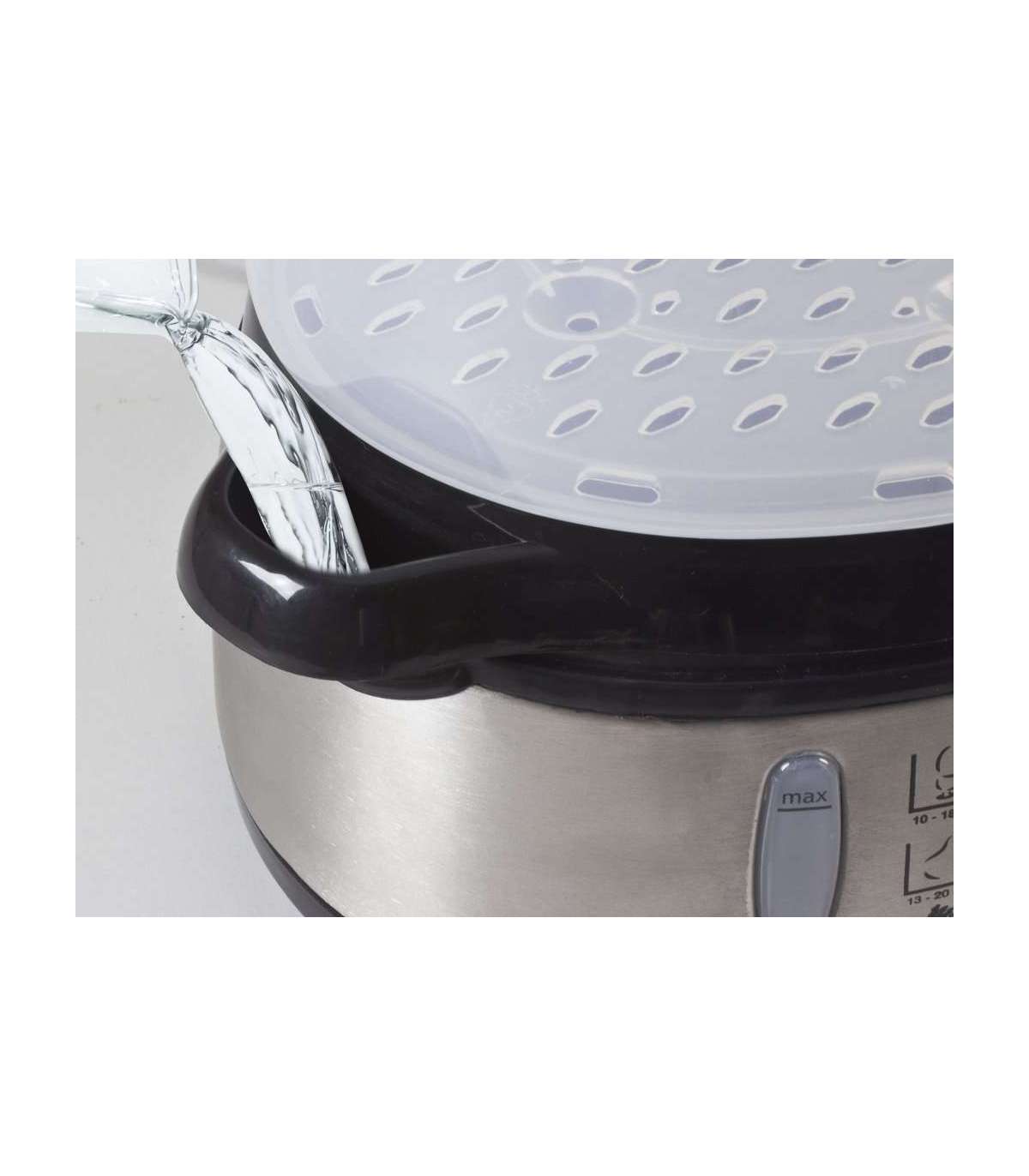 Teraskonstruktsiooniga aurupliit ja 3 läbipaistvast BPA-vabast plastikust kaussi kogumahutavusega 9L. 1L paak veetaseme indikaatoriga ja lisamise võimalusega isegi toiduvalmistamise ajal. Vedeliku kogumisalus sangadega. Töötuli ja 60-minutilise taimeriga nupp. Automaatne väljalülitus, kui vesi saab otsa. Kaasas riisi keedunõu. Lihtne puhastada ja hoiustada tänu ruumisäästlikele kaussidele.