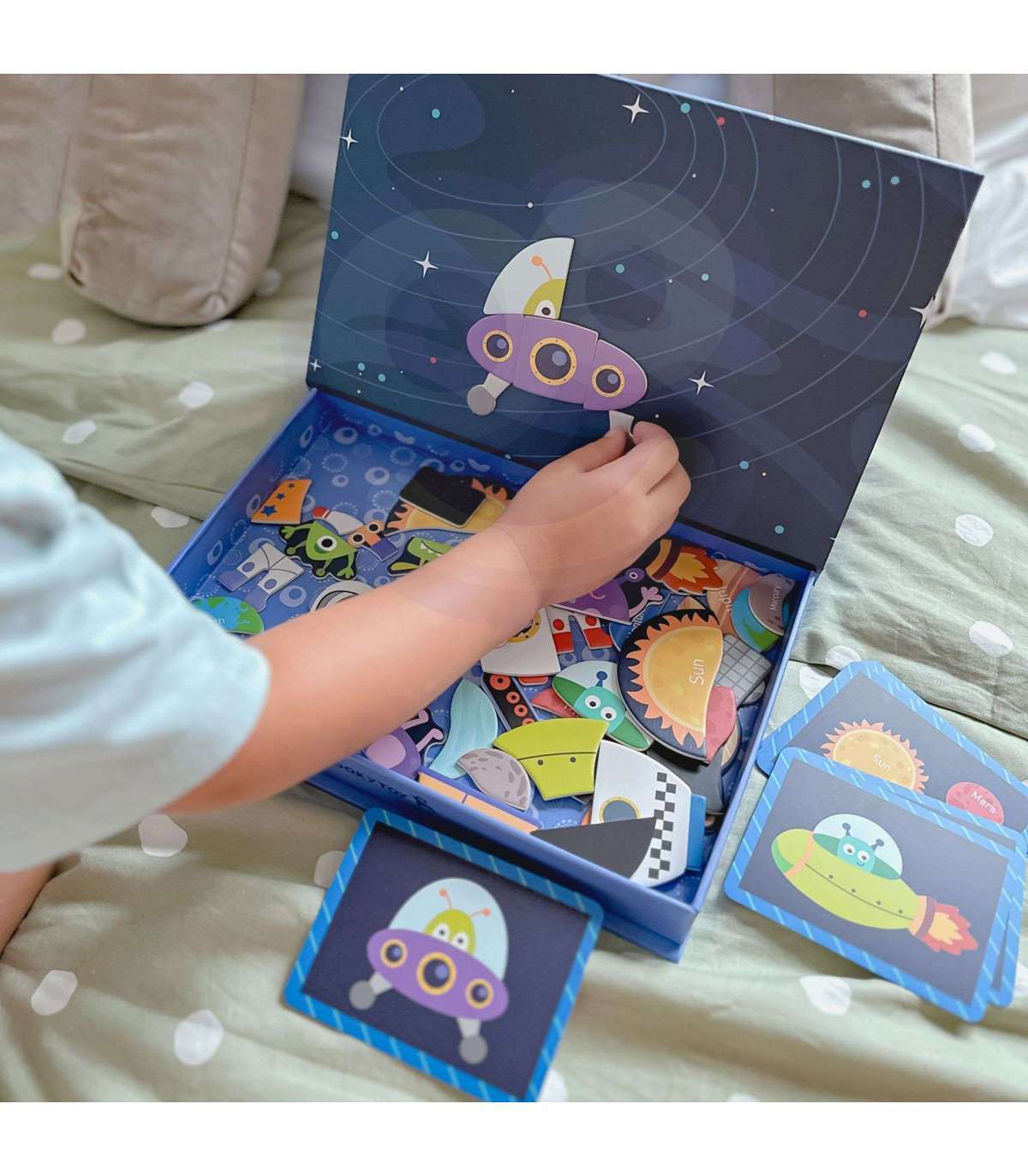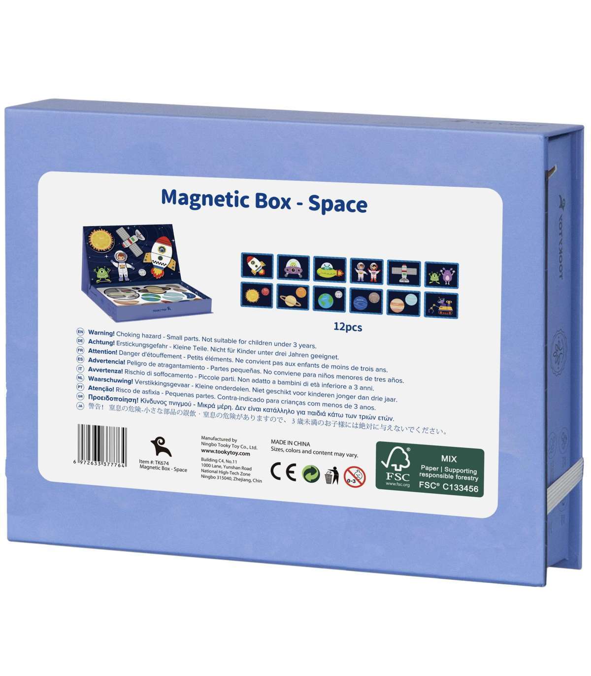 Układanka magnetyczna marki TOOKY TOY to wyjątkowa zabawka, która przeniesie dzieci w fascynujący świat kosmicznych przygód. Bogaty zestaw magnetycznych elementów pozwala na dowolne układanie rakiety, astronauty, planet i innych elementów na planszy, lub układać elementy zgodnie z dołączonymi 12 planszami. Solidne, kolorowe elementy oraz praktyczne zamykane pudełko sprawiają, że zabawka świetnie sprawdza się w domu i w podróży.