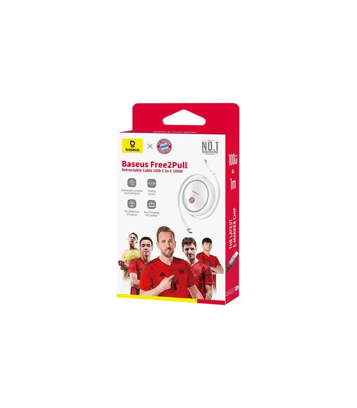 The Baseus Free2Pull USB-C to USB-C cable offers adjustable length in four ranges: 35 cm, 60 cm, 83 cm and 100 cm. Thanks to the built-in mechanism, it works smoothly and reliably, adjusting to your needs. At the same time, it is very lightweight, and when collapsed, it takes up little space for convenient carrying. The product is compatible with most devices equipped with a USB-C port. In addition, the Bayern Munich logo gives it a sporty touch, which any fan of this legendary club is sure to appreciate.