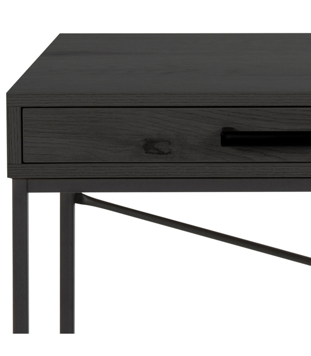 Письменный стол SEAFORD 110x45xH75см, черный. Письменный стол - необходимое дополнение к любому дому, позволяющее удобнее использовать компьютер или создать практичное пространство домашнего офиса. У письменного стола есть ящик. Столешница изготовлена из МДФ, меламина. Цвет черный ясень. Каркас выполнен из черного металла. Размеры изделия 110x45xH75см.