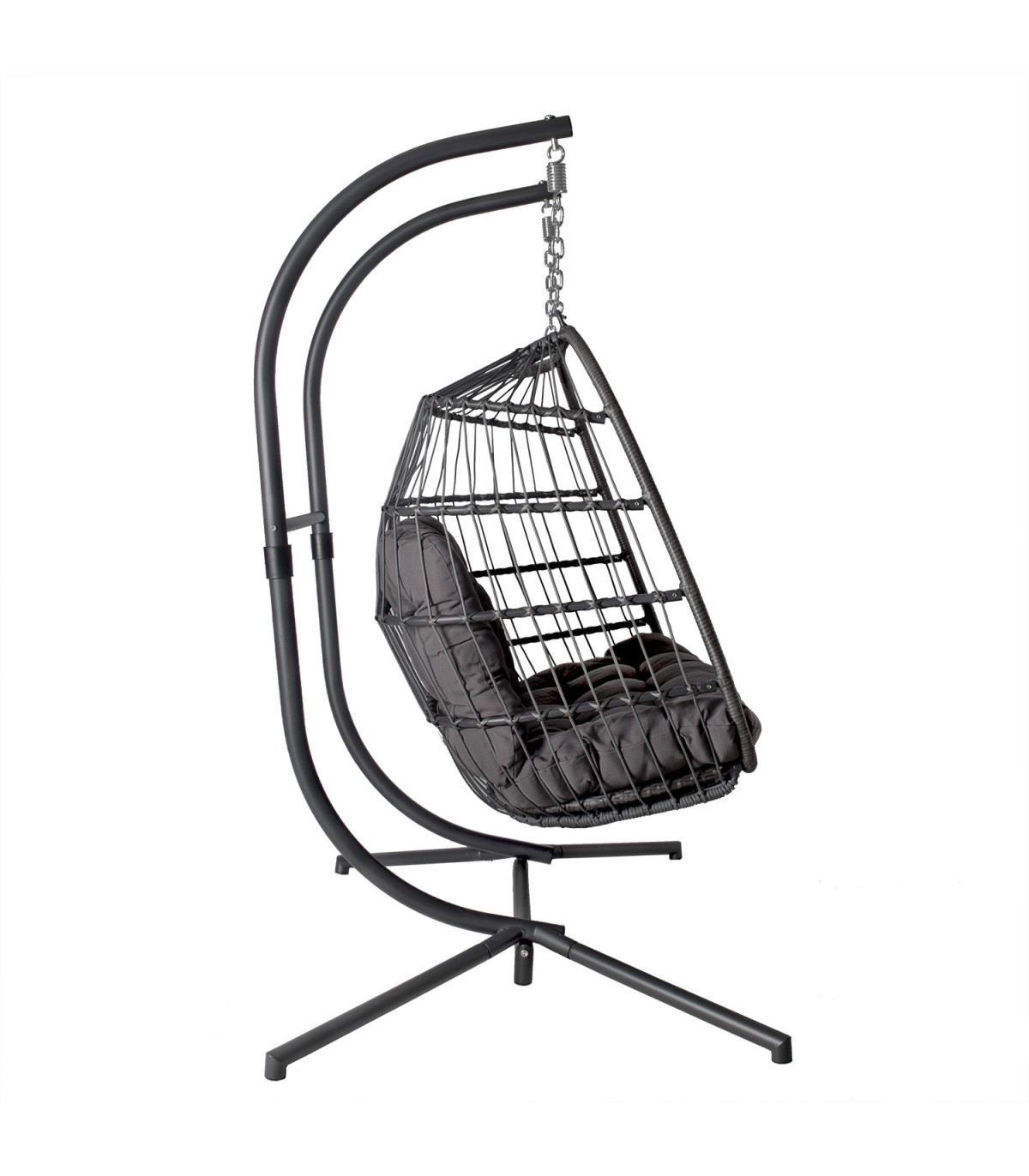 Подвесное кресло YOYO 2-местный c подушками, 152x107xH198см, ножка: чёрная стальная труба, сиденье: плетение из пластика. Сиденье: плетение из пластика на алюминиевой раме, цвет: серый. Подушки входят в комплект, цвет: тёмно-серый. Дополнительная информация: предельный вес 240кг.