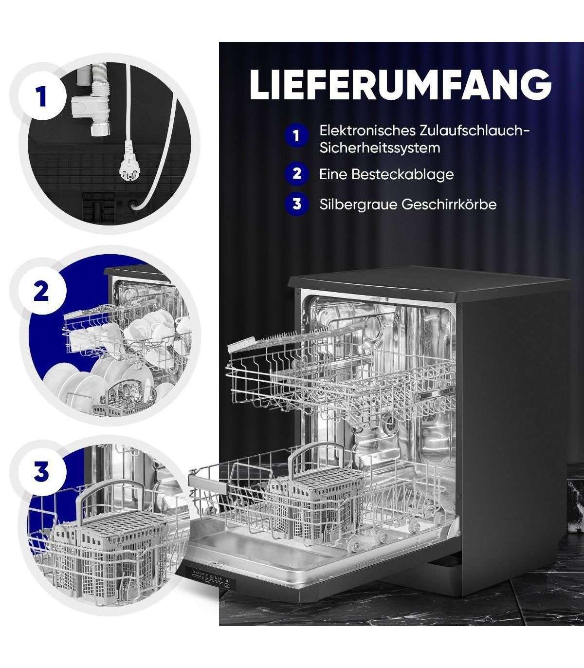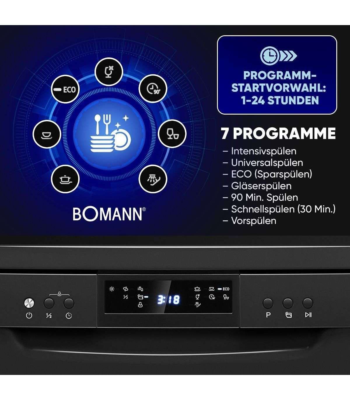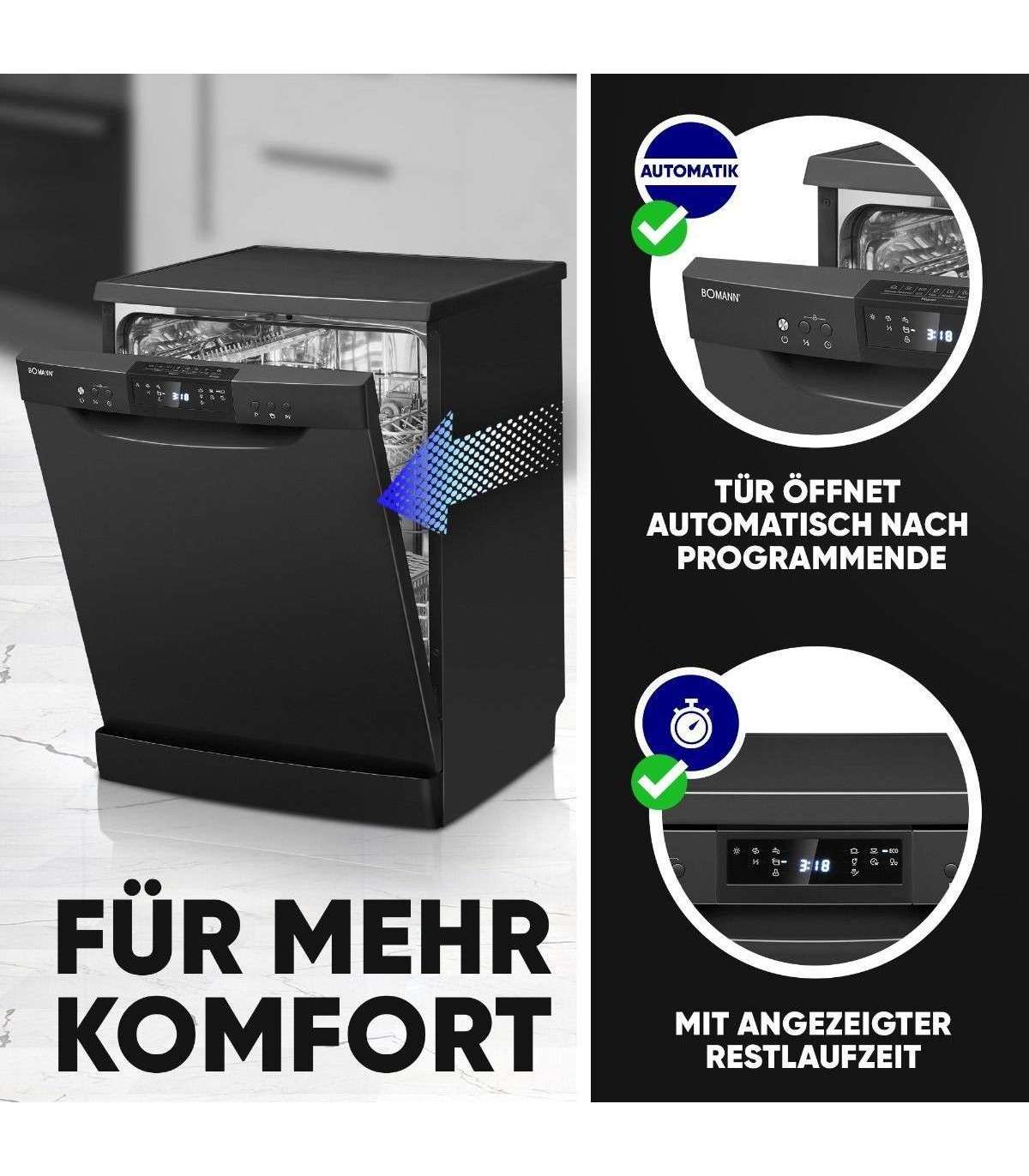 The 60 cm freestanding dishwasher from Bomann impresses with many practical functions such as the remaining running time indicator, the salt and rinse aid shortage indicator, and the automatic door opening function after the end of the program. With an operating noise of just 47 dB, it is also particularly quiet and does not disturb your everyday life.