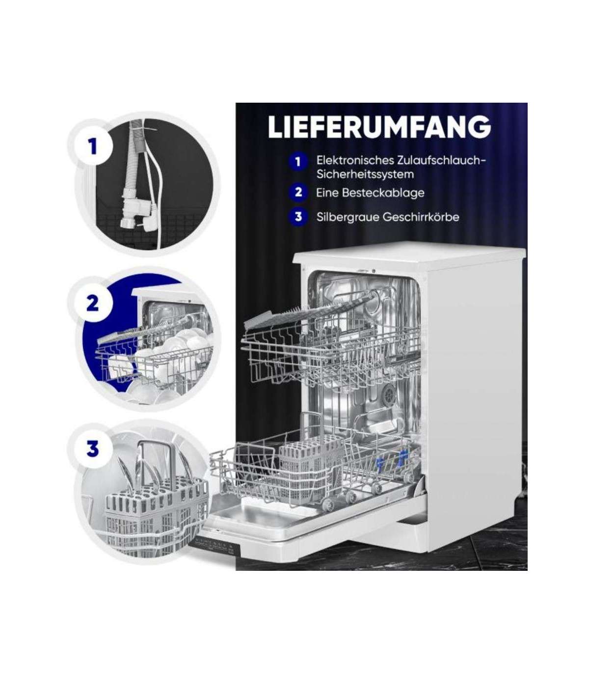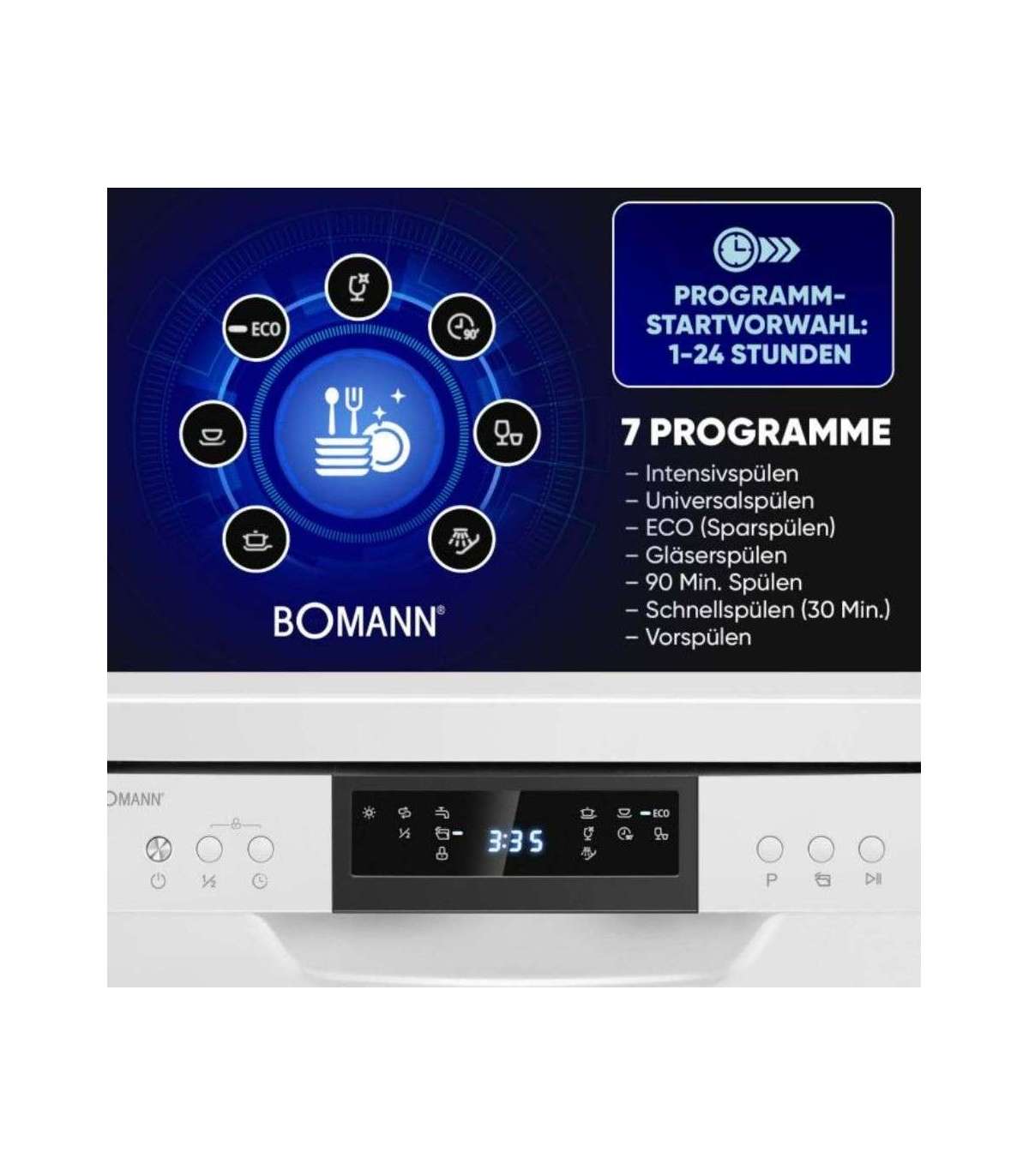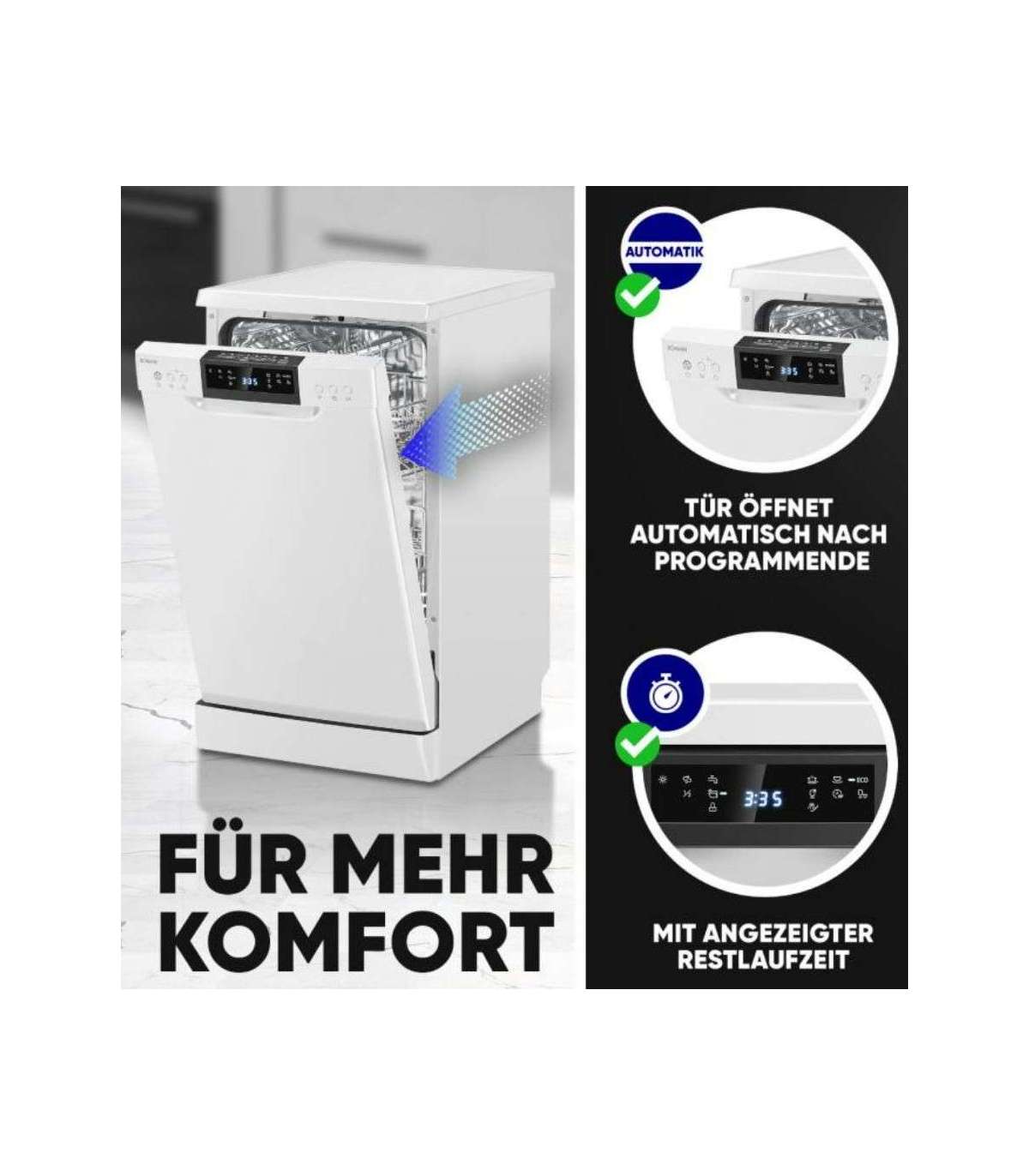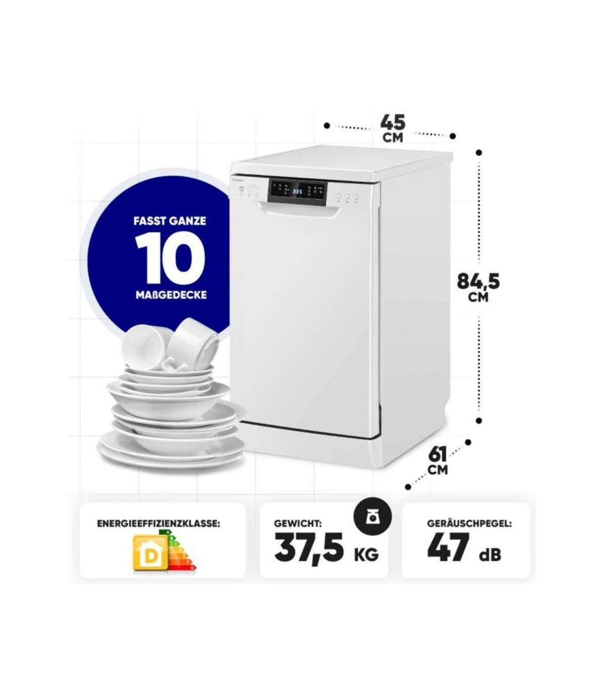 The 45 cm freestanding dishwasher from Bomann impresses not only with its technical specifications, but also with its practical functions such as the remaining running time indicator, the salt and rinse aid shortage indicator, and the automatic door opening function after the end of the program. With an operating noise of just 47 dB, it is also particularly quiet and does not disturb your everyday life.