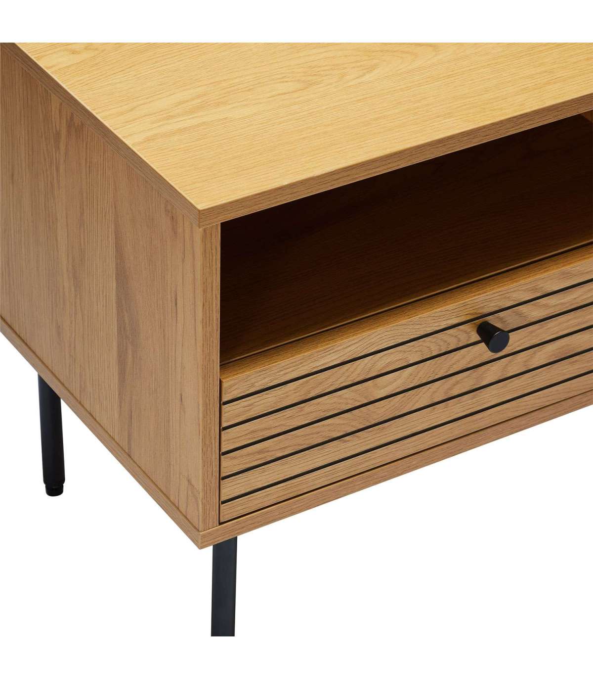 Öökapp LINE sahtli ja riiuliga 50x40xH50cm. Öökapp on valmistatud tammedekooriga melamiinplaadist. Efektse reljeefse pinnaga triibuline sahtli esipaneel on valmistatud mustast MDF plaadist, mida kaunistavad tammevärvi kitsad liistud. Öökapi metallist jalad on viimistletud musta pulbervärviga.