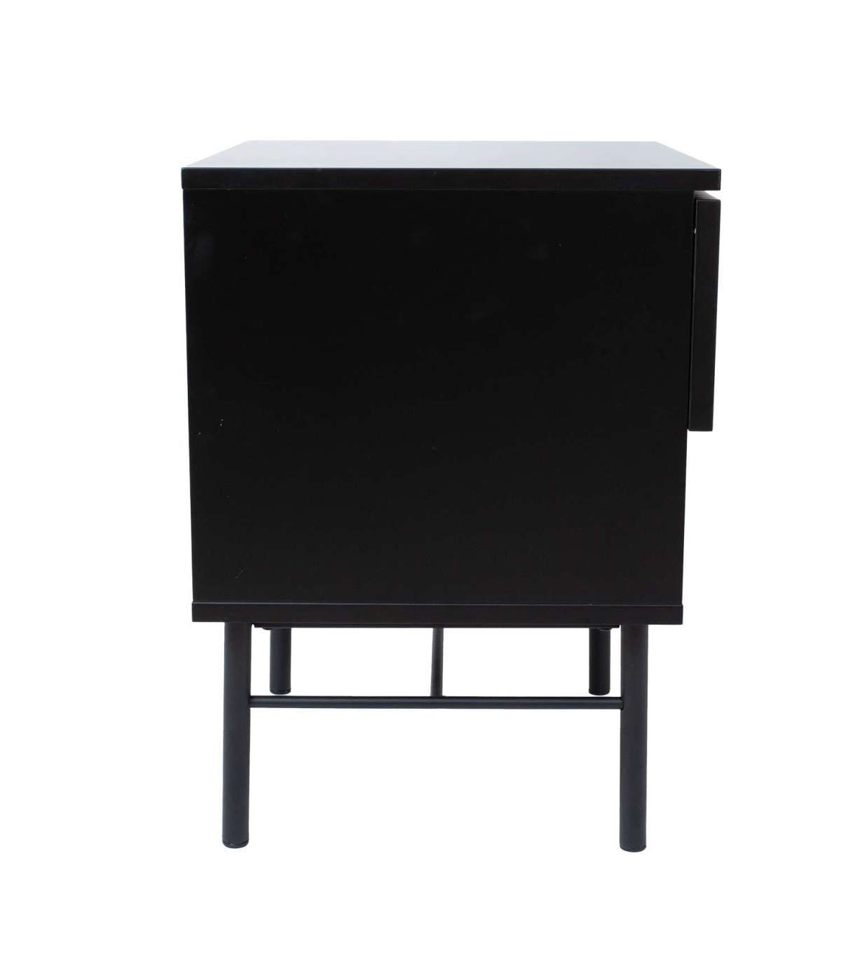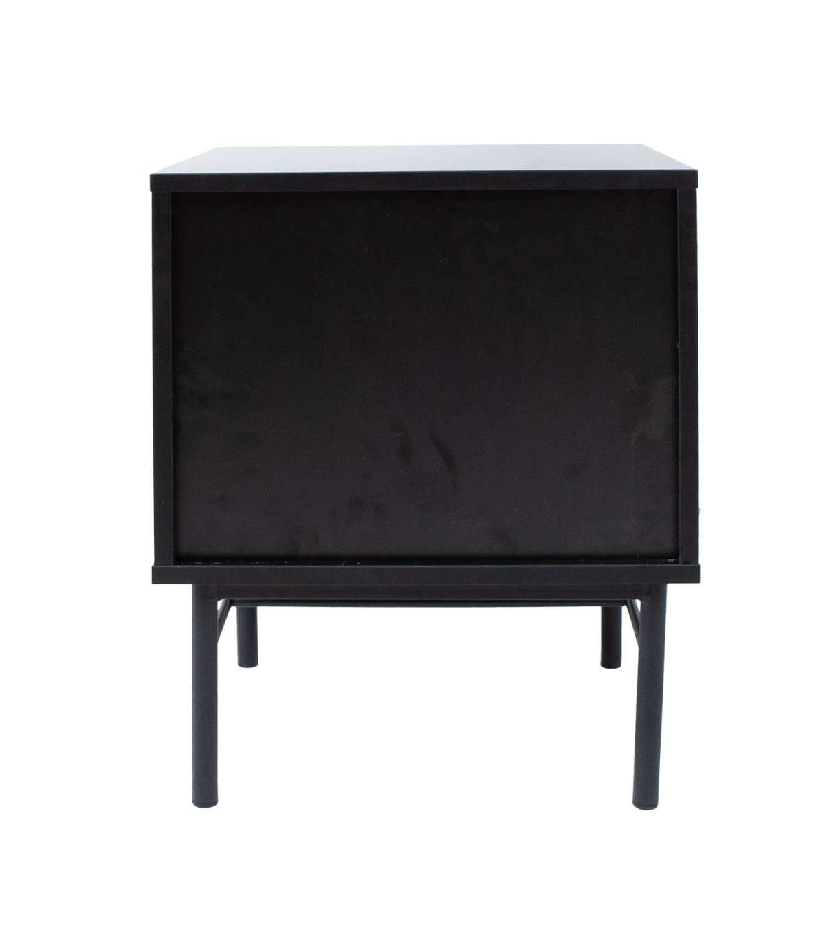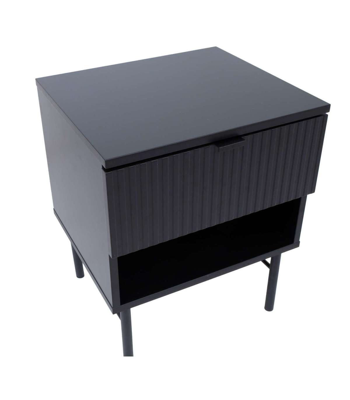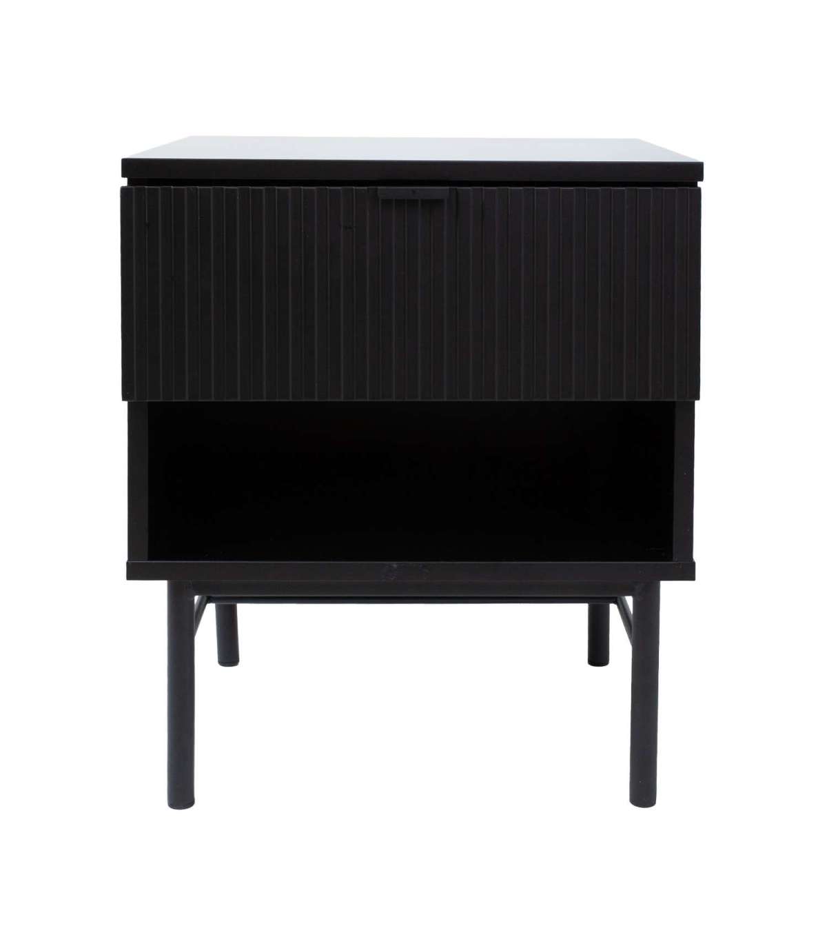 Öökapp SEQUENCE sahtli ja avatud riiuliga 45x40xH55cm, must. Öökapi korpus on valmistatud mööbliplaadist. Kapil on reljeefse pinnaga triibuline sahtli esipaneel ja must metallist käepide. Sahtel liigub metallsiinidel. Öökapp on viimistletud vastupidava polüuretaanvärviga. Öökapi metallist alusraam on viimistletud musta pulbervärviga.