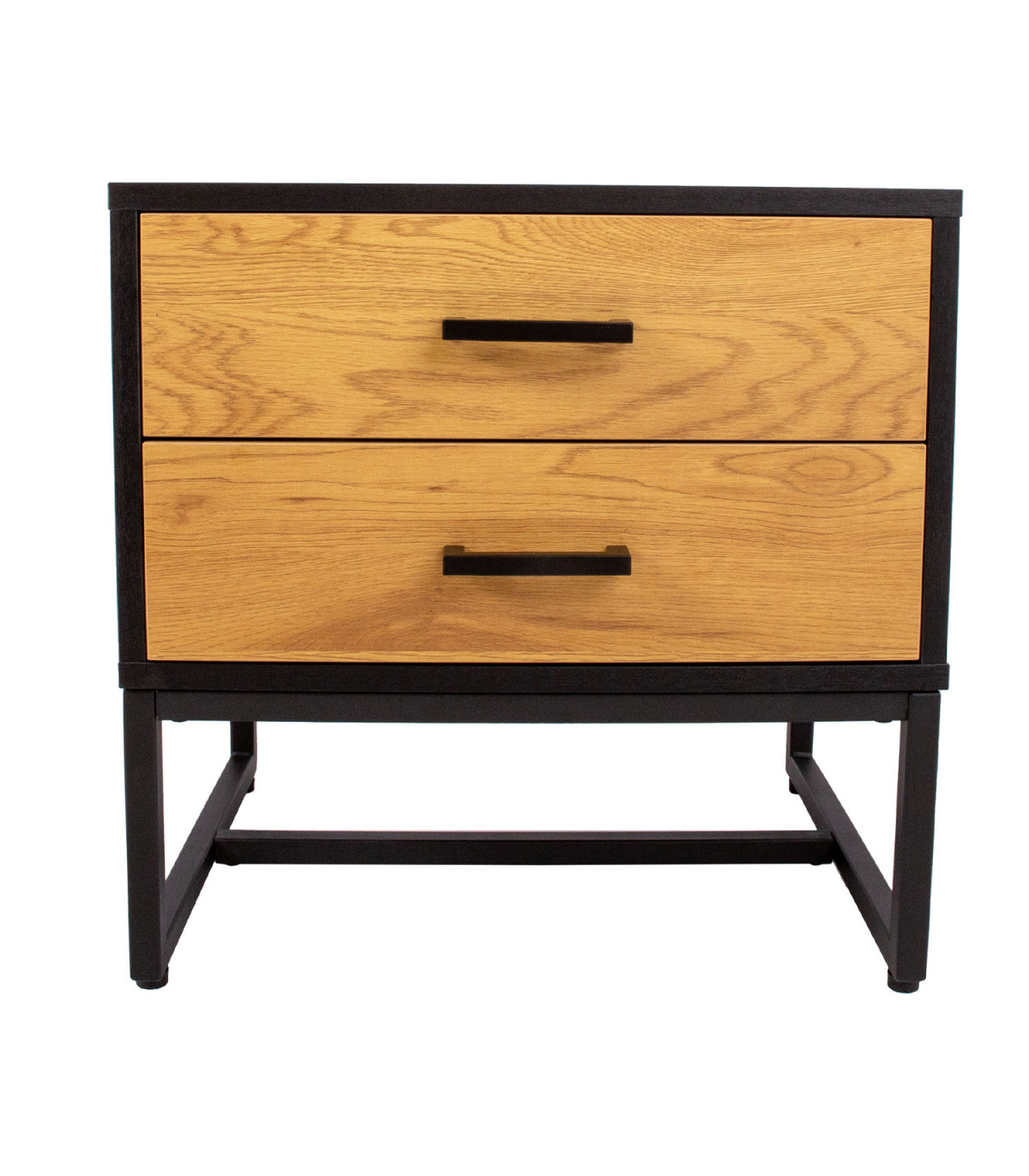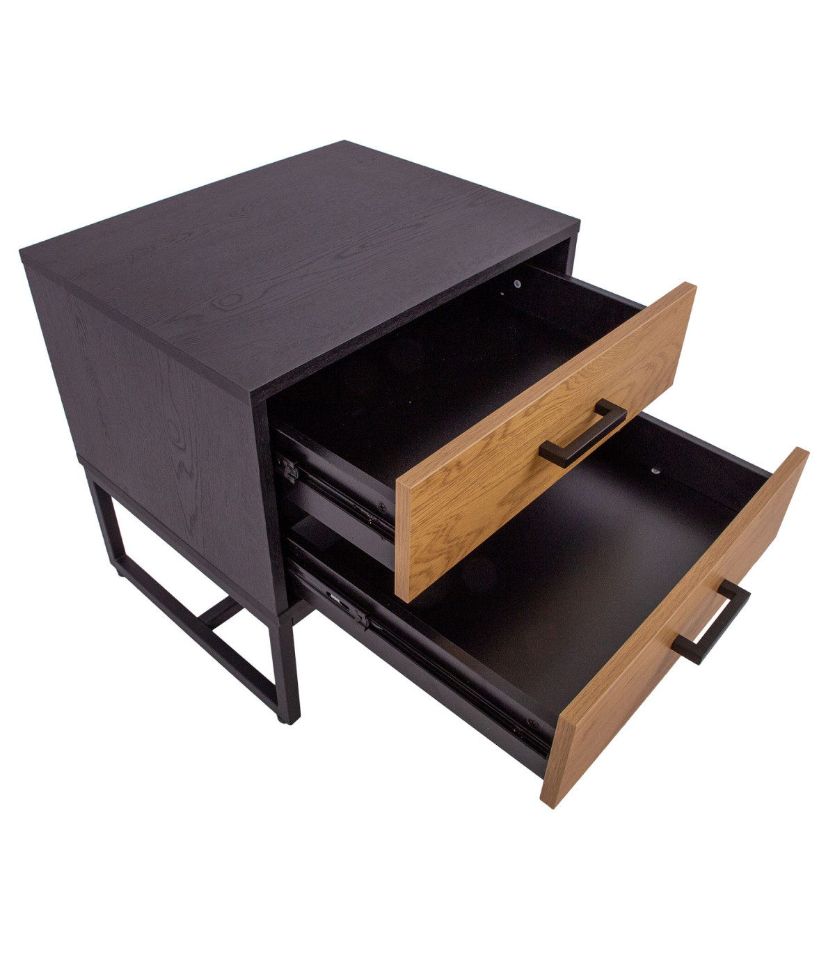 Прикроватная тумба AMSTERDAM 50x40xH50cм. Материал: меламиновая плита, цвет: дуб/черный. Основание из черного металла. Плавно закрывающийся ящик. Черные алюминиевые ручки.