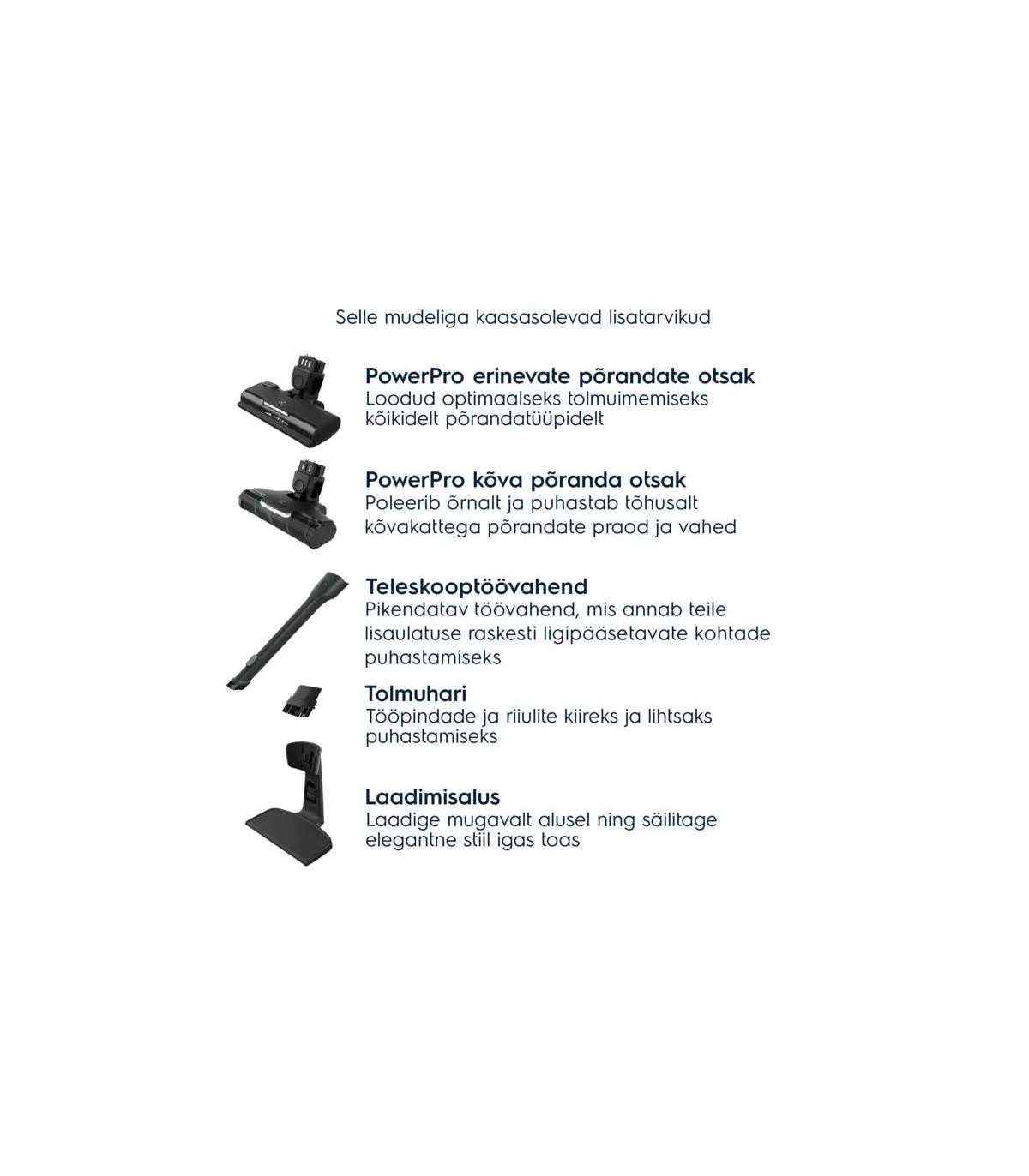 Electroluxi seeria 500 juhtmeta tolmuimeja tagab hõlpsa juurdepääsu kompaktsele käsitolmuimejale ja seadme küljes hoitavatele tarvikutele, võimaldades teil põrandat puhastades võtta hetkega ette raskesti ligipääsetavate kohtade puhastamise ja asuda siis uuesti põranda kallale. Tihendatud otsikusüsteem tekitab kiirema õhuvoolu, mis eemaldab tolmu vaevata ka kõige kitsamatest kohtadest, kogudes pragudest tolmu seitse korda tõhusamalt. PowerPro Hard Floor otsik tagab eriti tõhusa tolmueemalduse kõvapõrandatelt, kusjuures tänu otsiku ehitusele eemaldatakse ka pragudest kuni 100% tolmust. Teljeline tsüklontehnoloogia tagab kompromissitu töö kogu koristamise ajal, isegi kui tolmuanum saab täis: täitumisel säilib maksimumvõimsust kasutades 99% algsest puhastusjõudlusest. Hermeetiline otsikusüsteem tekitab tugevalt imeva õhuvoolu. Paindlik ja funktsionaalne disain pakub koristustööl mugavust, ergonoomilisust ja head manööverdatavust. Filtreerimissüsteem eemaldab kuni 99% suurematest kui 1 µm tolmuosakestes, et tagada õhu maksimaalne puhtus. LED-tuled DustSpotter™: LED-tuledega otsik DustSpotter™ aitab näha ka kõige väikesemat puru või tolmu hämarates nurkades. Funktsioon Brush Roll Clean võimaldab lihtsalt rullikult karvu lahti lõigata. Vabanege rullikule takerdunud loomakarvadest või juustest neid puudutamata. Vajutage lihtsalt jalaga harjarulliku puhastamise nuppu ja lõikurnuga lõikab harjarullikule takerdunud juuksed lahti.
