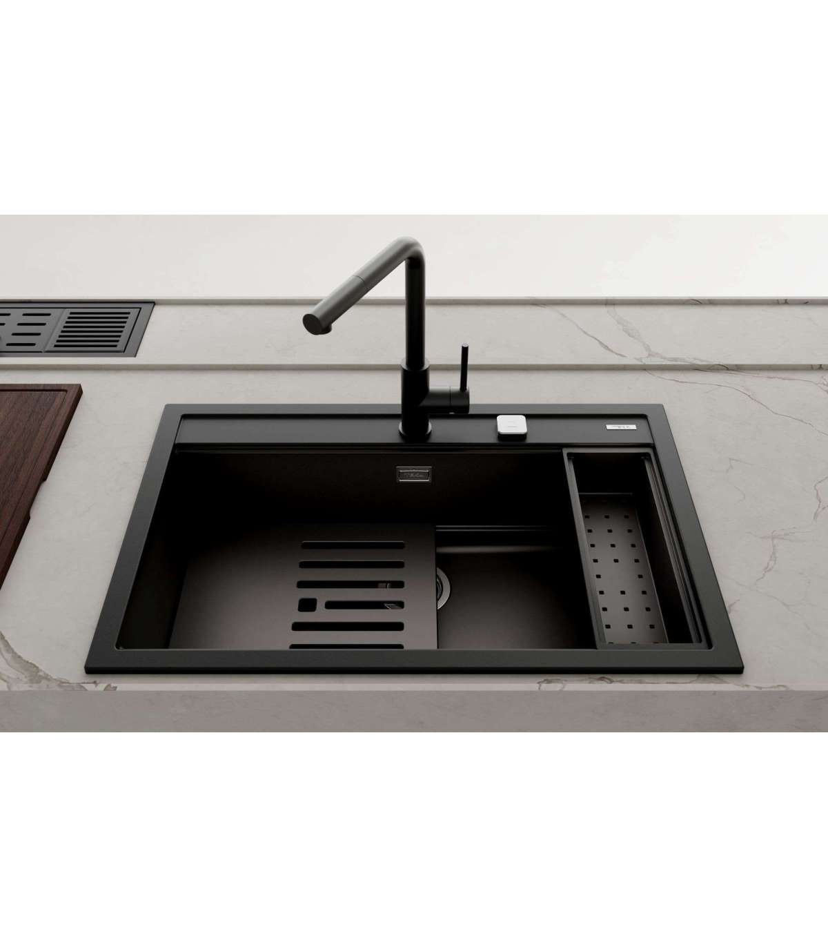 The Nova sink combines purity, functionality, and pure aesthetics. With two integrated surfaces and smart accessories (colander, cutting board with drainage grooves), it makes cooking and cleaning pleasantly easy.