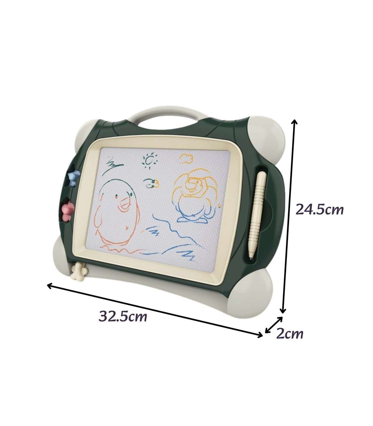 Znikopis Tablica Magnetyczna daje możliwość kreatywnej zabawy na długi czas! Tablica zachęca do pisania i rysowania. Rysowanie pozwoli wyciszyć i uspokoić się Twojemu dziecku. Znikopis pozwala na tworzenie nieskończonej ilość obrazków – wystarczy przejechać specjalnym suwakiem, a rysunek zniknie i można rysować od nowa! Zestaw zawiera wygodny magiczny długopis oraz 2 stempelki, które urozmaicą dzieło. Tablica posiada wygodny uchwyt, dzięki czemu dziecko może zabrać ją wszędzie. Znikopis rozwinie u dziecka zdolności manualne, wyobraźnie, kreatywność oraz pomoże w rozwinięciu artystycznej strony dziecka!