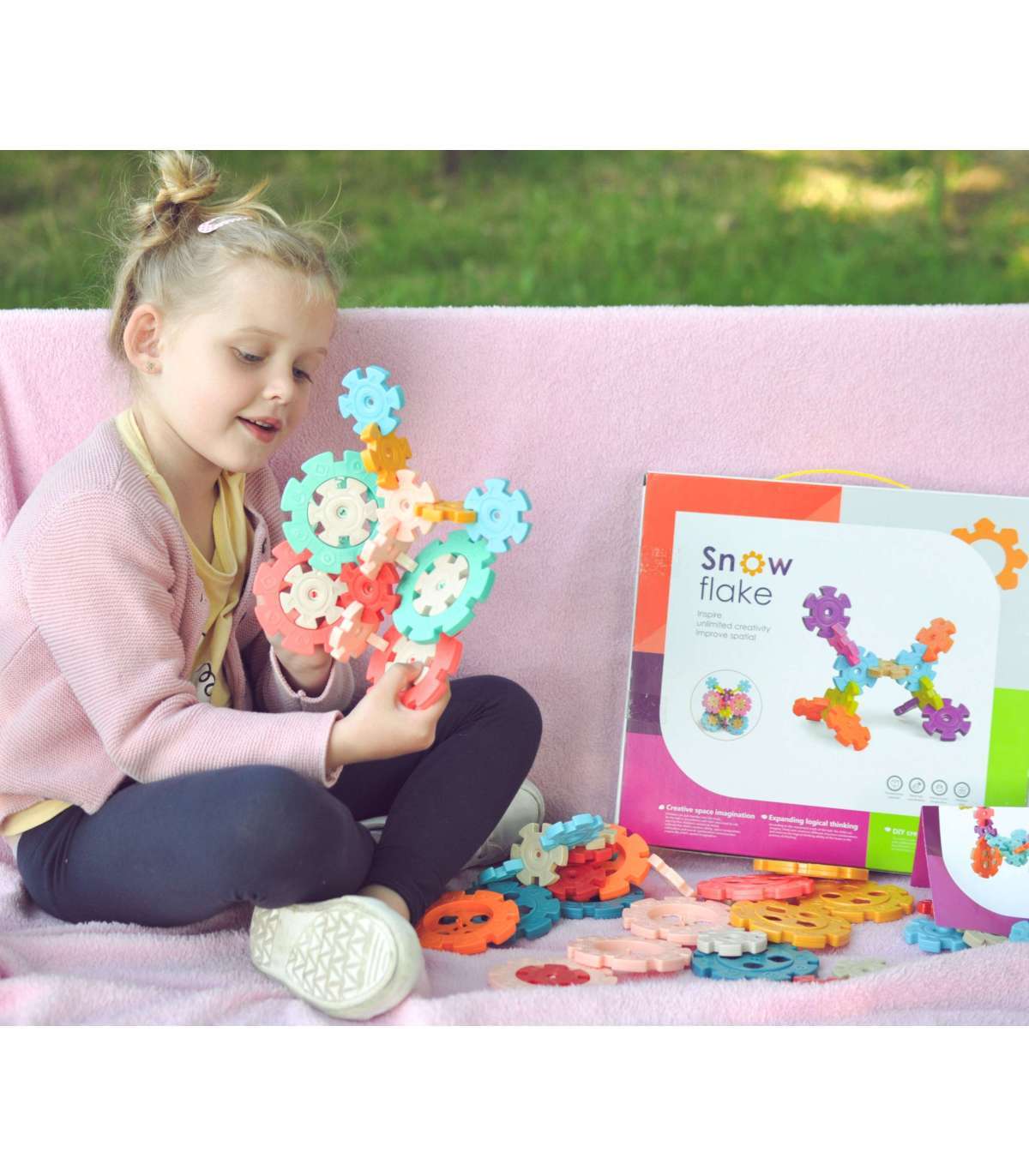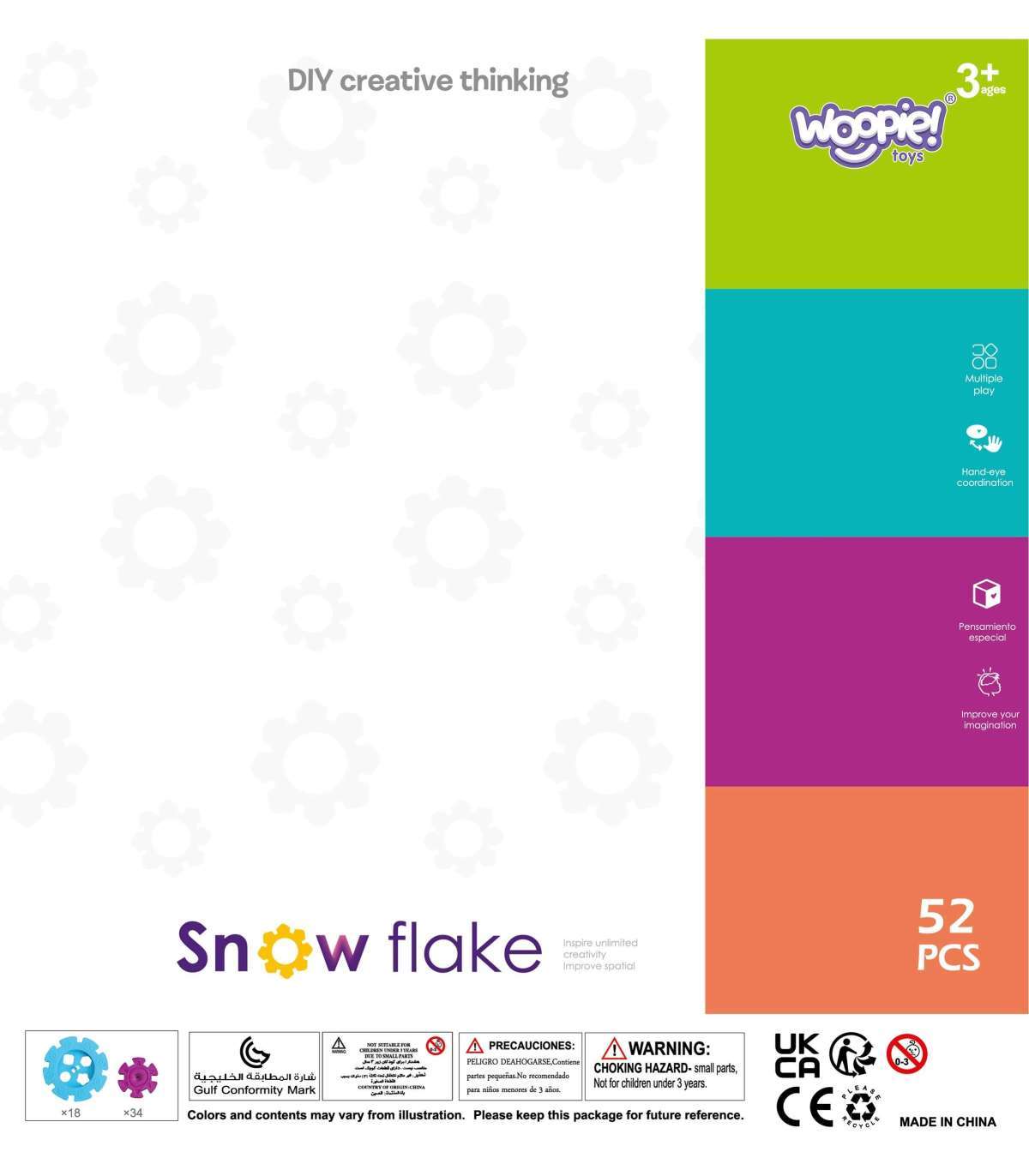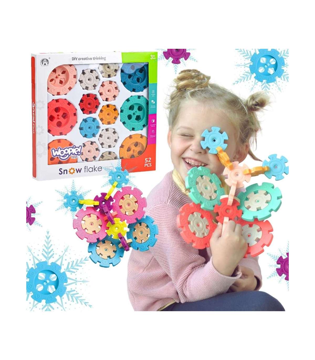 Klocki Konstrukcyjne Wafle od marki WOOPIE zwrócą uwagę i zafascynują Twoje dziecko. Kolorowe elementy przypominają wyglądem płatki śniegu. Klocki w bardzo łatwy sposób łączą się ze sobą, a ze względu na swoją budowę i sposób łączenia można z nich tworzyć ciekawe trójwymiarowe konstrukcje. Zastosowane otwory w śnieżynkach pozwalają na łączenie ich pod skosem, a nie tylko prostopadle. Zestaw zawiera 52 elementy: w tym 18 dużych i 34 małych klocków. Samo budowanie konstrukcji rozwinie u dziecka logiczne myślenie, wyobraźnie, kreatywność oraz pomoże skoncentrować się podczas tworzenia. Przez układanie klocków dziecko poznaje kształty i kolory oraz ćwiczy zdolności manualne tzw. motorykę małą.