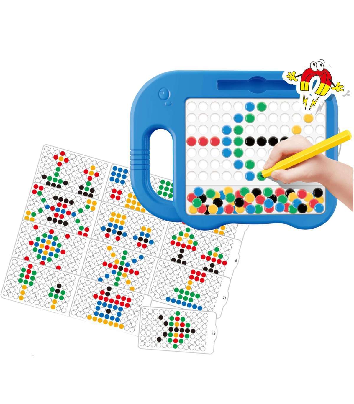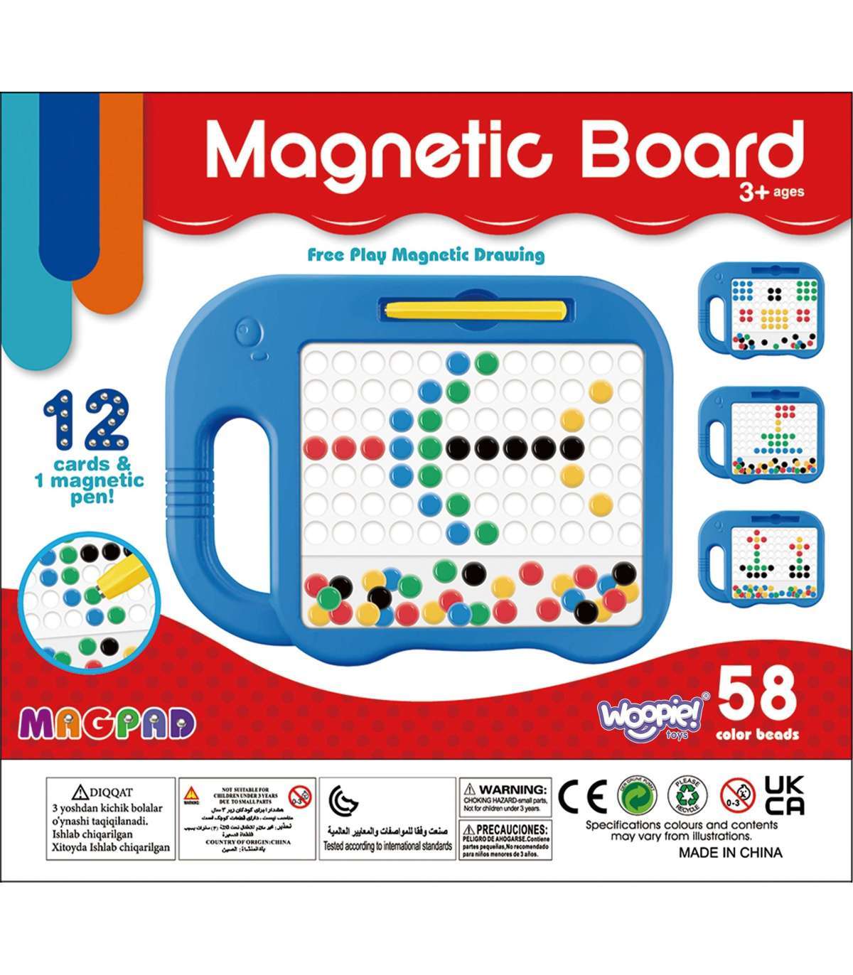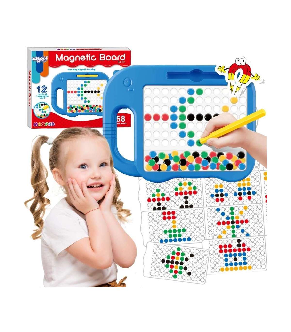 Magnetyczna tablica MagPad od marki Woopie otwiera przed Twoim dzieckiem drzwi do świata kreatywności i edukacji. Dzięki tej wyjątkowej tablicy Twoje dziecko ma okazję tworzyć niepowtarzalne wzory i mozaiki. Ograniczeniem jest jedynie wyobraźnia i kreatywność - maluch może swobodnie układać wzory według własnych pomysłów. Zabawa polega na przesuwaniu magnetycznego rysika po tablicy w celu przyciągania kolorowych kulek i tworzenia z nich wzorów – zarówno z gotowych kart, jak i według własnej wyobraźni. To nie tylko rozrywka, ale także cenne wsparcie w rozwoju motoryki i logicznego myślenia. Tablica zawiera aż 58 kolorowych kuleczek (po 12 z 4 kolorów oraz 10 czarnych) oraz 12 dwustronnych kart ze wzorami Wszystko to w poręcznej formie z wygodnym uchwytem i miejscem na rysik!