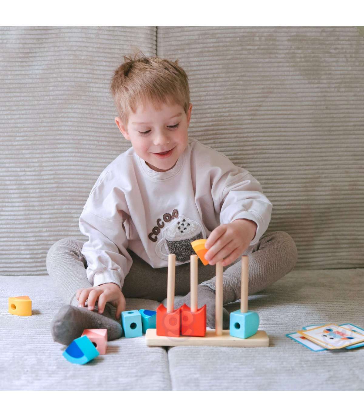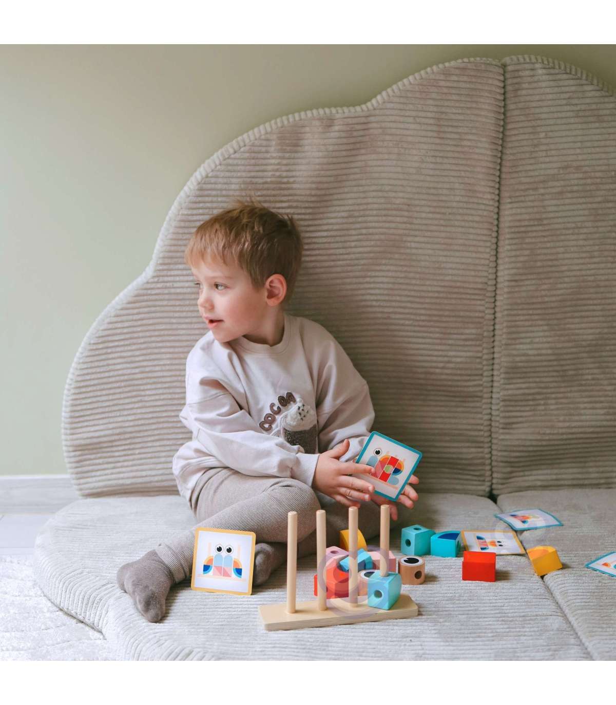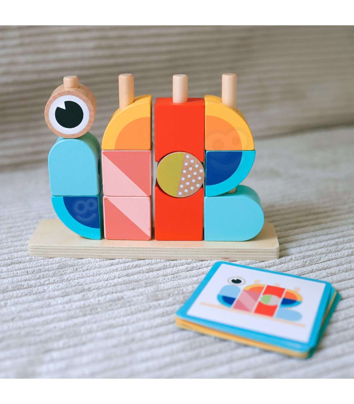 - - zestaw zawiera 18 elementów: drewnianą podstawkę do układania, 12 klocków oraz 5 dwustronnych kart z wzorami