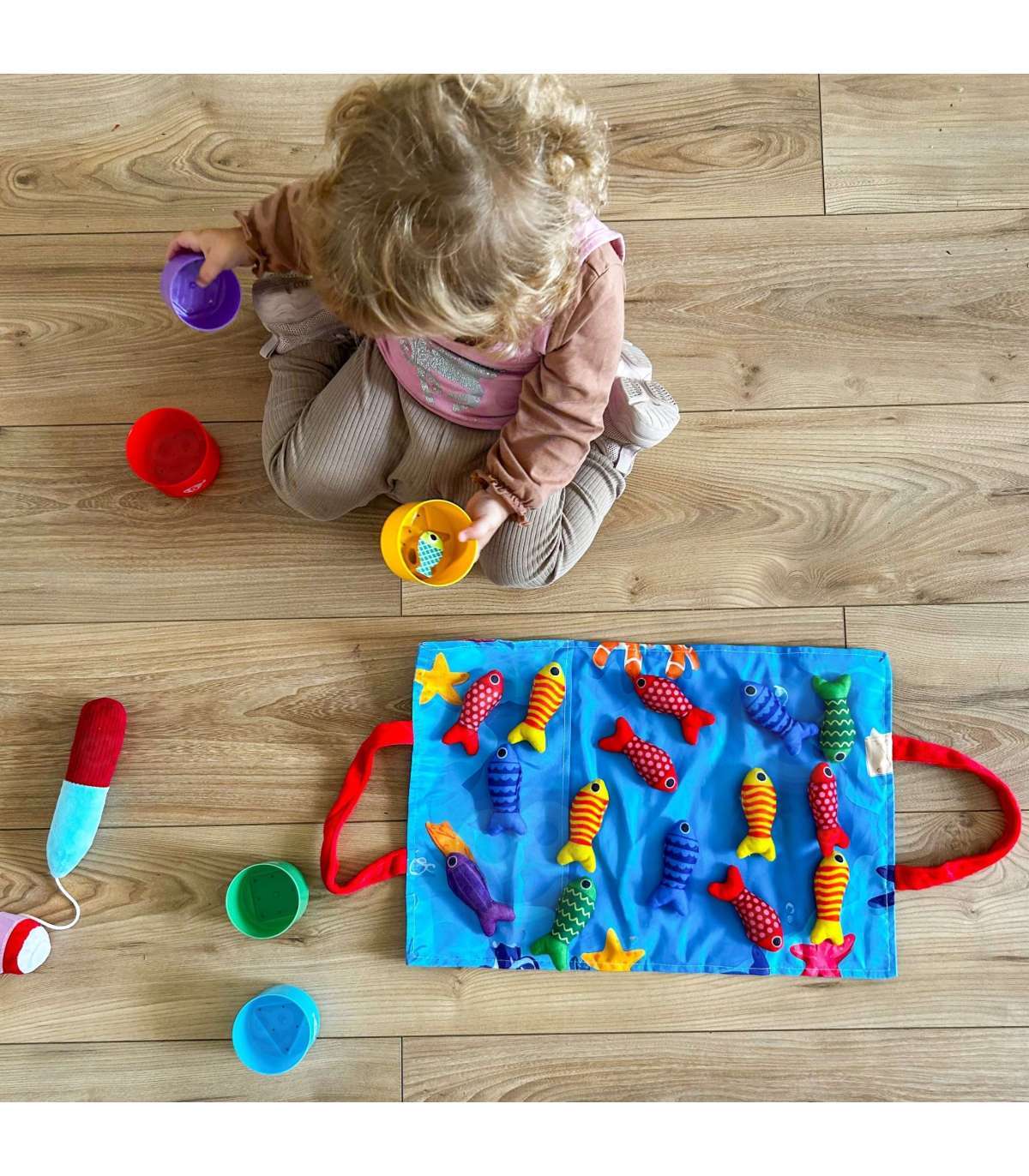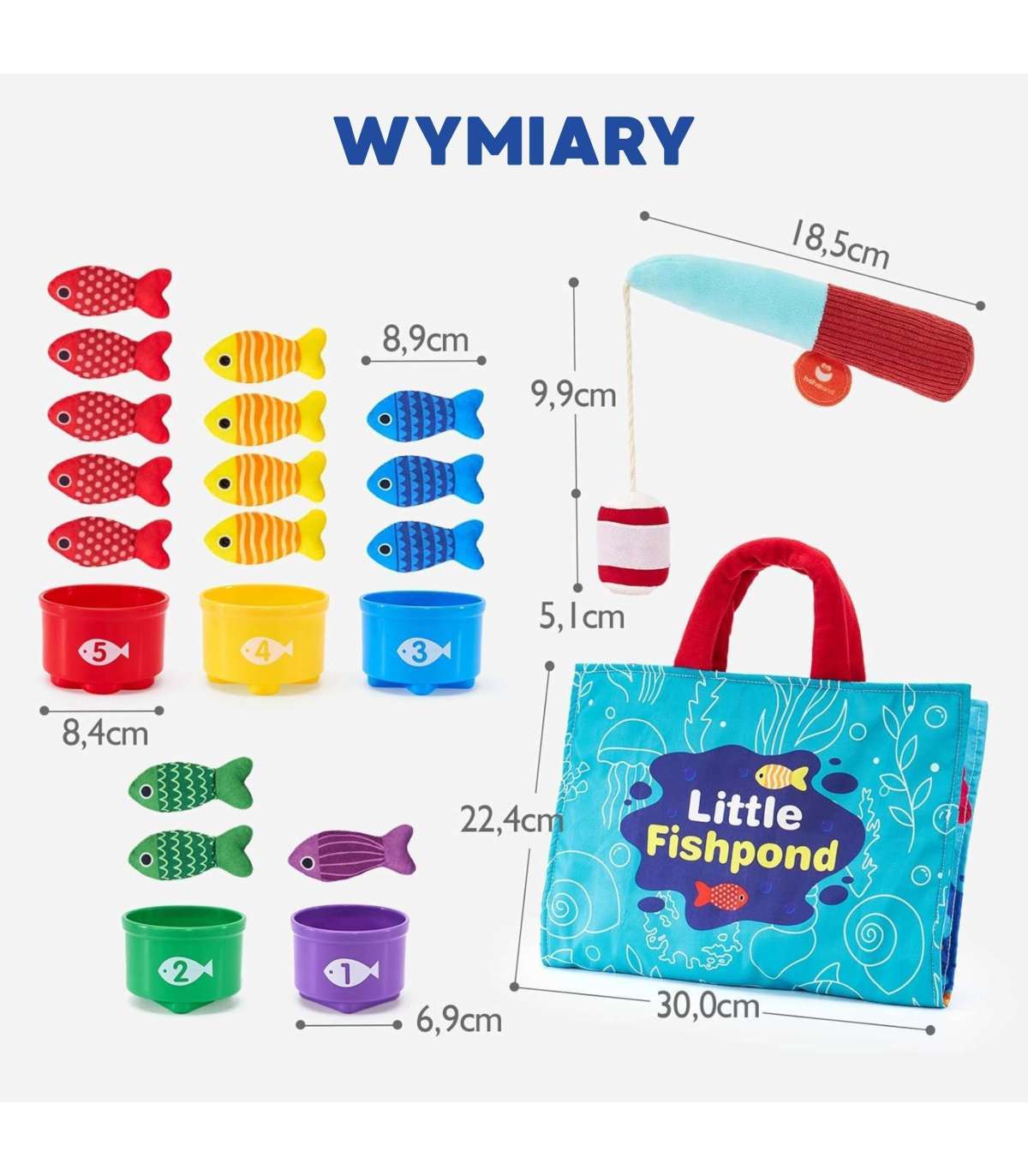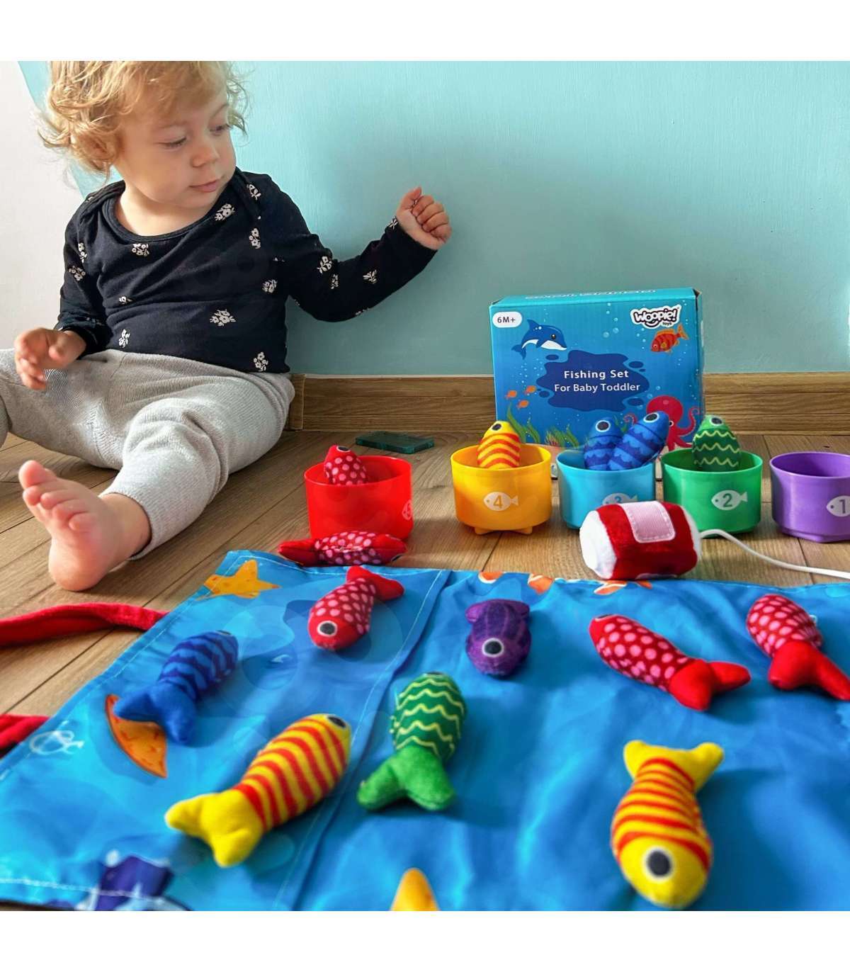 Zestaw Małego Wędkarza marki WOOPIE to miękki, bezpieczny i angażujący zestaw wędkarski dla maluchów od 6. miesiąca życia. Kolorowe pluszowe rybki, lekka wędka z przynętą na rzepy, kubeczki-sortery z numerkami oraz składana torbo-mata zamieniają każdą przestrzeń w mini krainę zabawy. Dziecko łowi rybki, sortuje je do odpowiednich kubeczków i uczy się kolorów, liczenia oraz wzorów, jednocześnie ćwicząc rączki i koordynację.