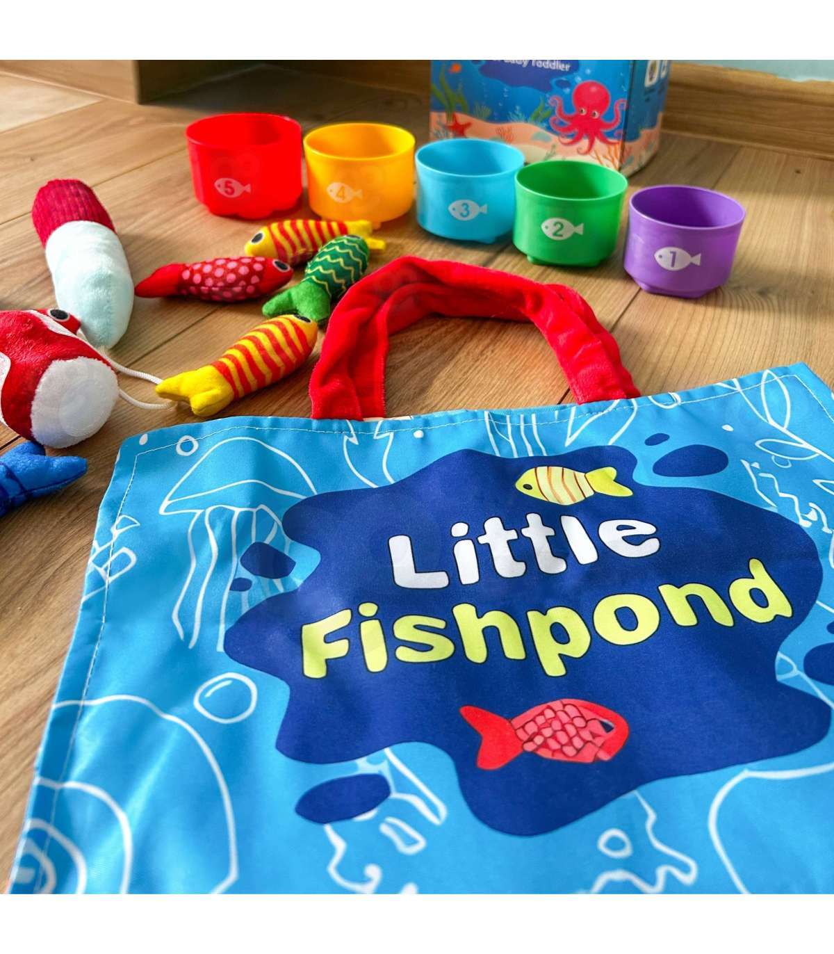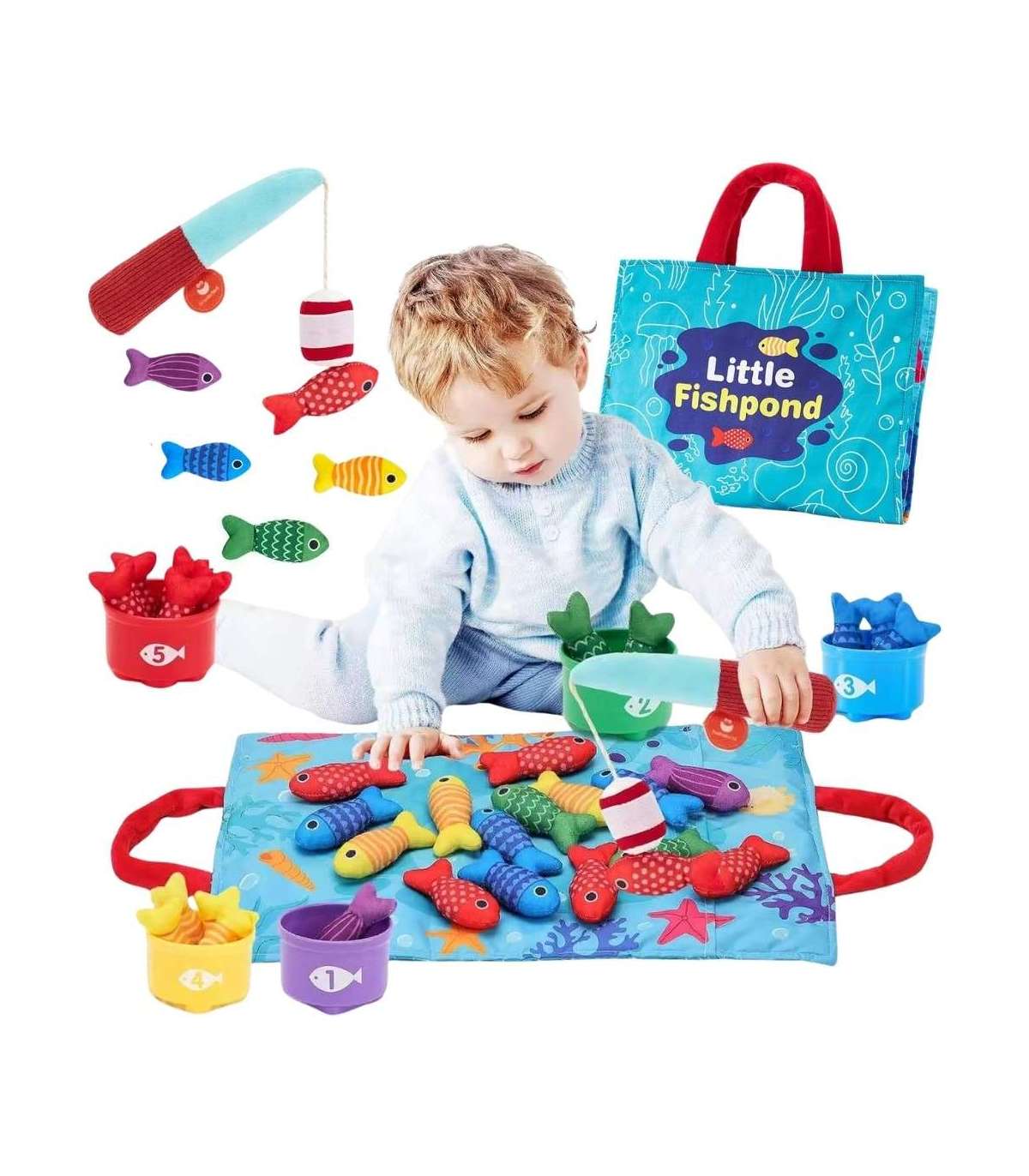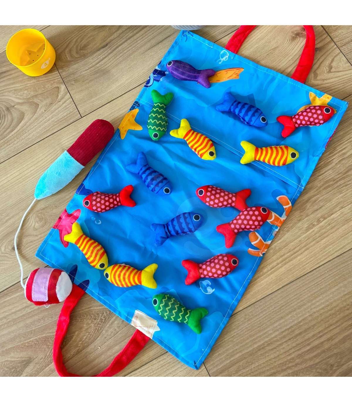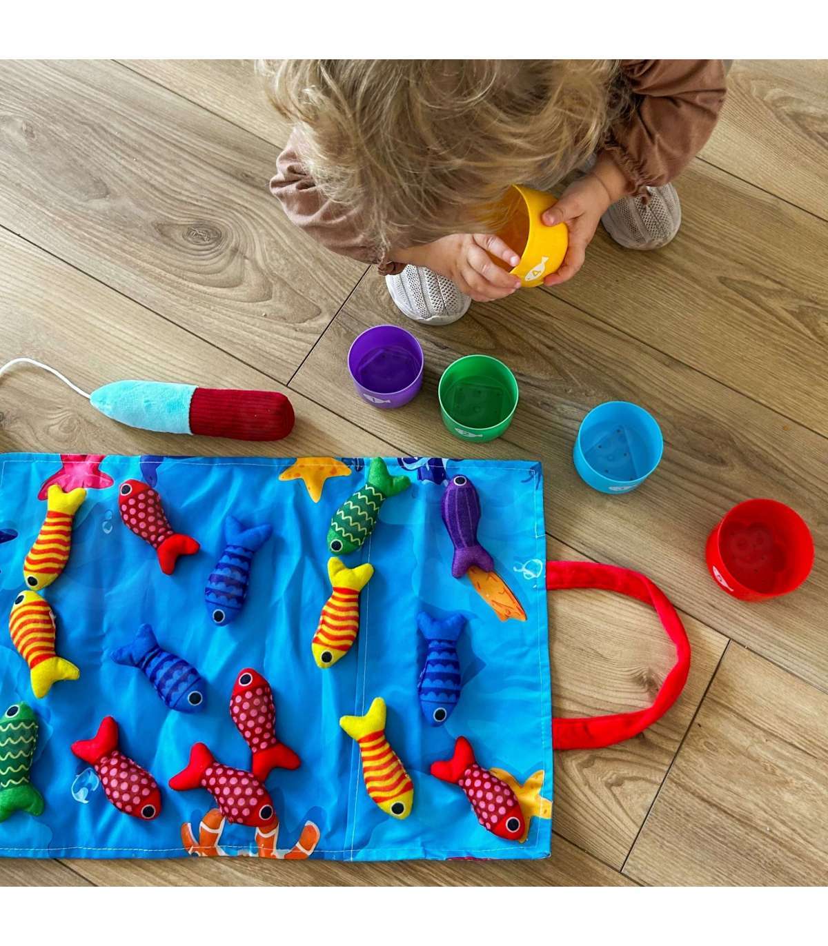Zestaw Małego Wędkarza marki WOOPIE to miękki, bezpieczny i angażujący zestaw wędkarski dla maluchów od 6. miesiąca życia. Kolorowe pluszowe rybki, lekka wędka z przynętą na rzepy, kubeczki-sortery z numerkami oraz składana torbo-mata zamieniają każdą przestrzeń w mini krainę zabawy. Dziecko łowi rybki, sortuje je do odpowiednich kubeczków i uczy się kolorów, liczenia oraz wzorów, jednocześnie ćwicząc rączki i koordynację.