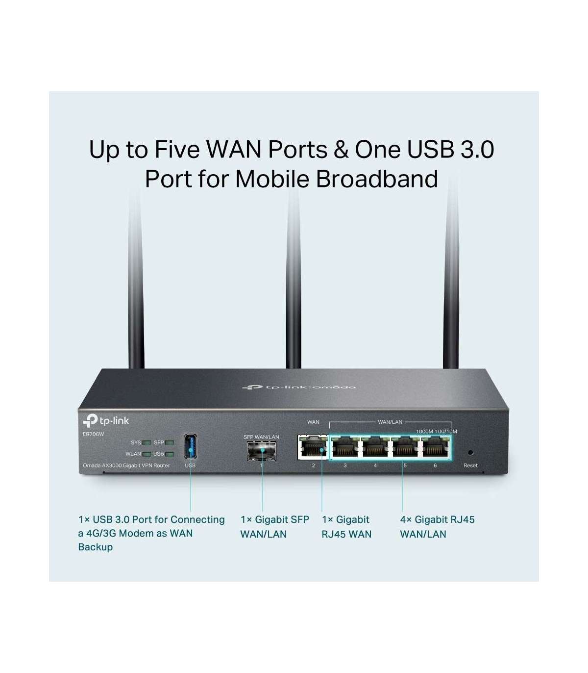 SafeStream Gigabit Multi-WAN VPN Router ER706W 802.1q Ethernet LAN (RJ-45) ports 1× Gigabit SFP WAN Port, 1×