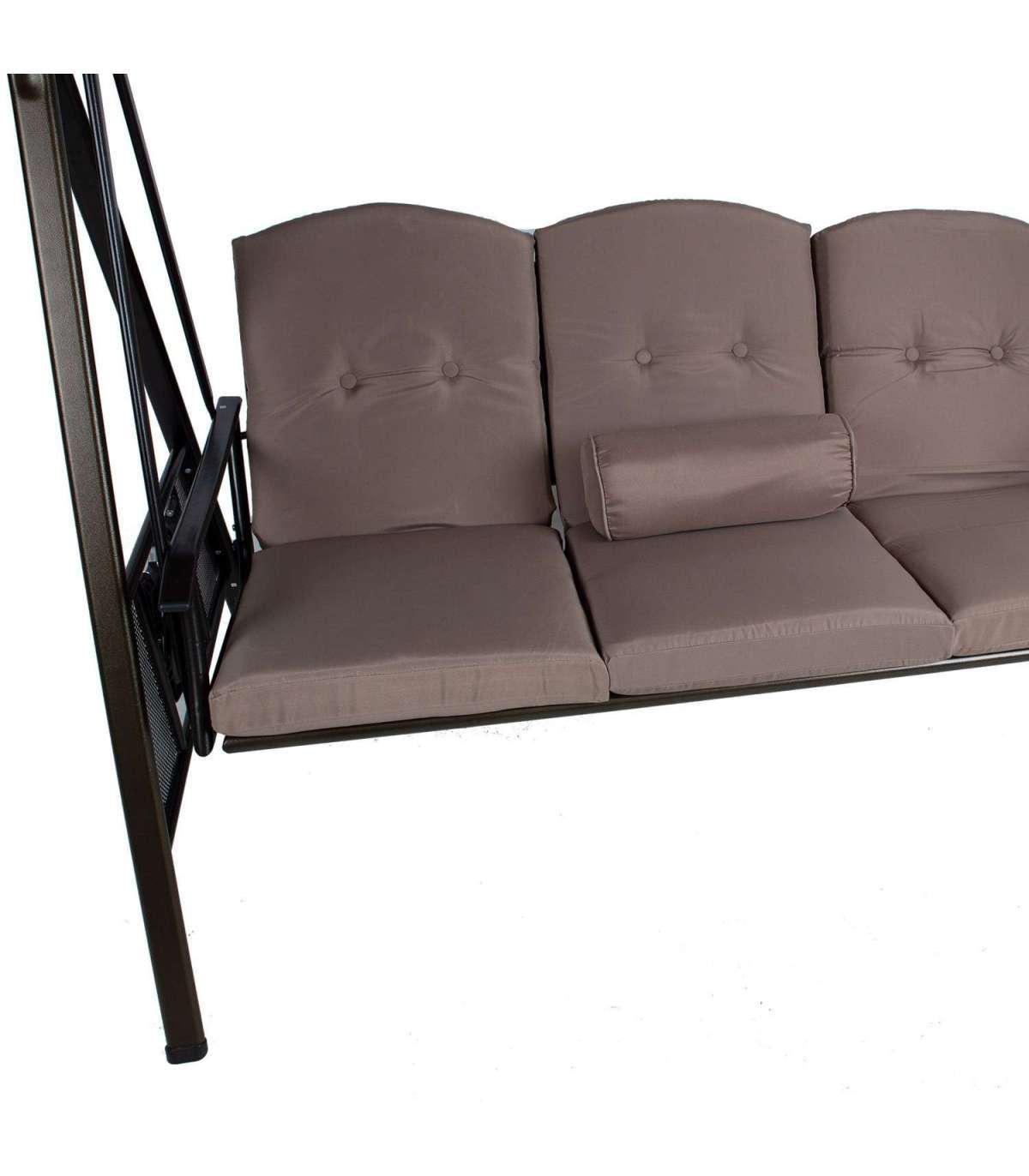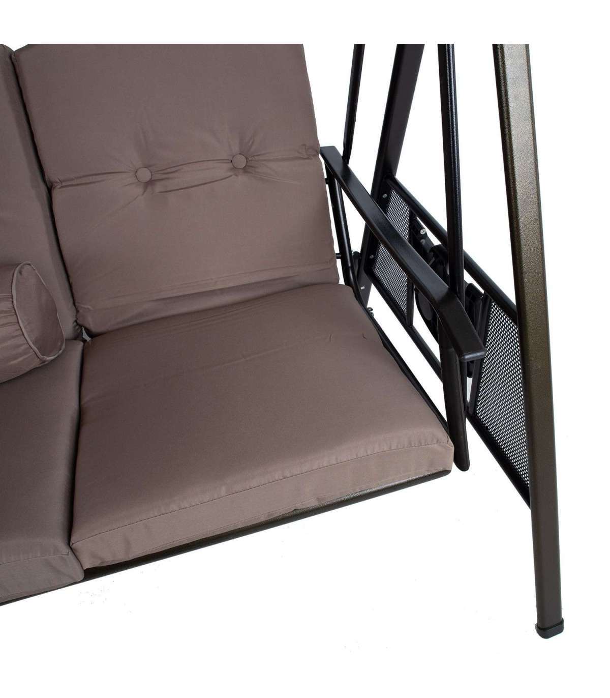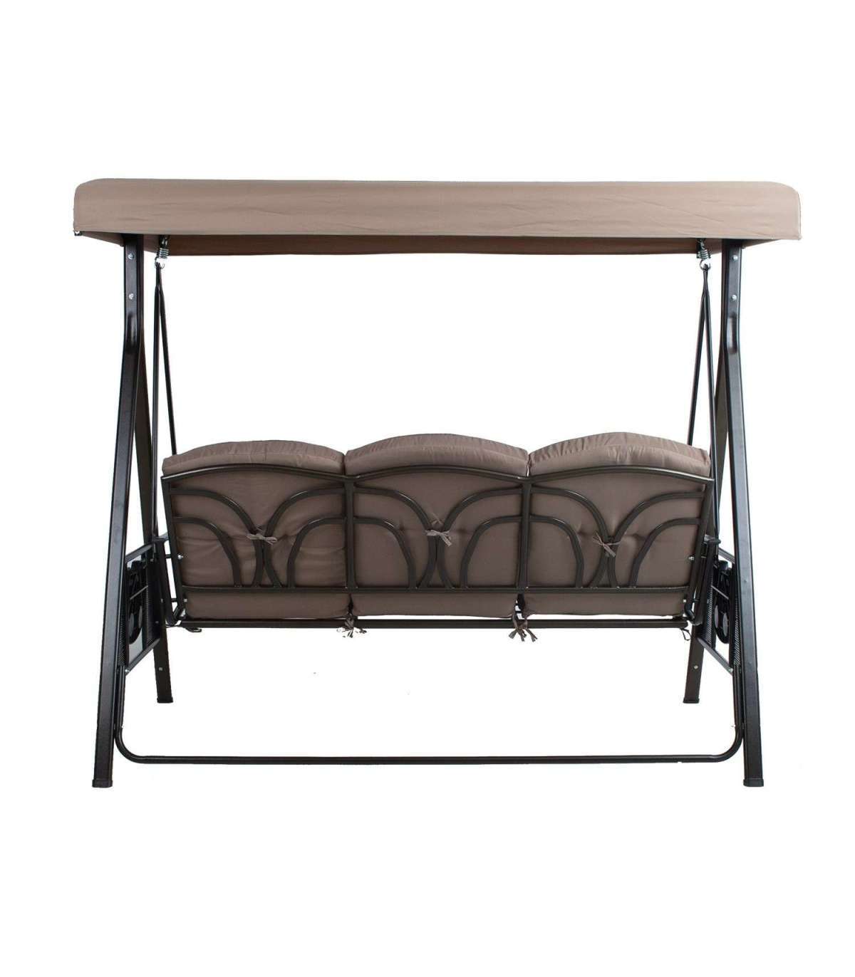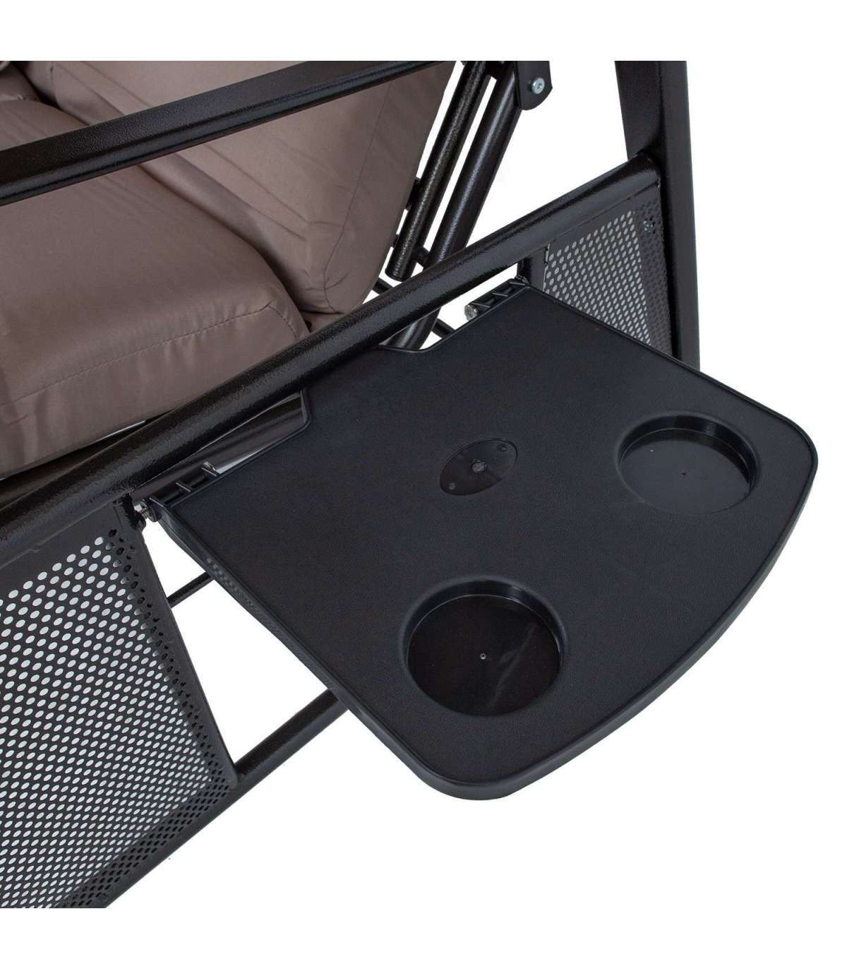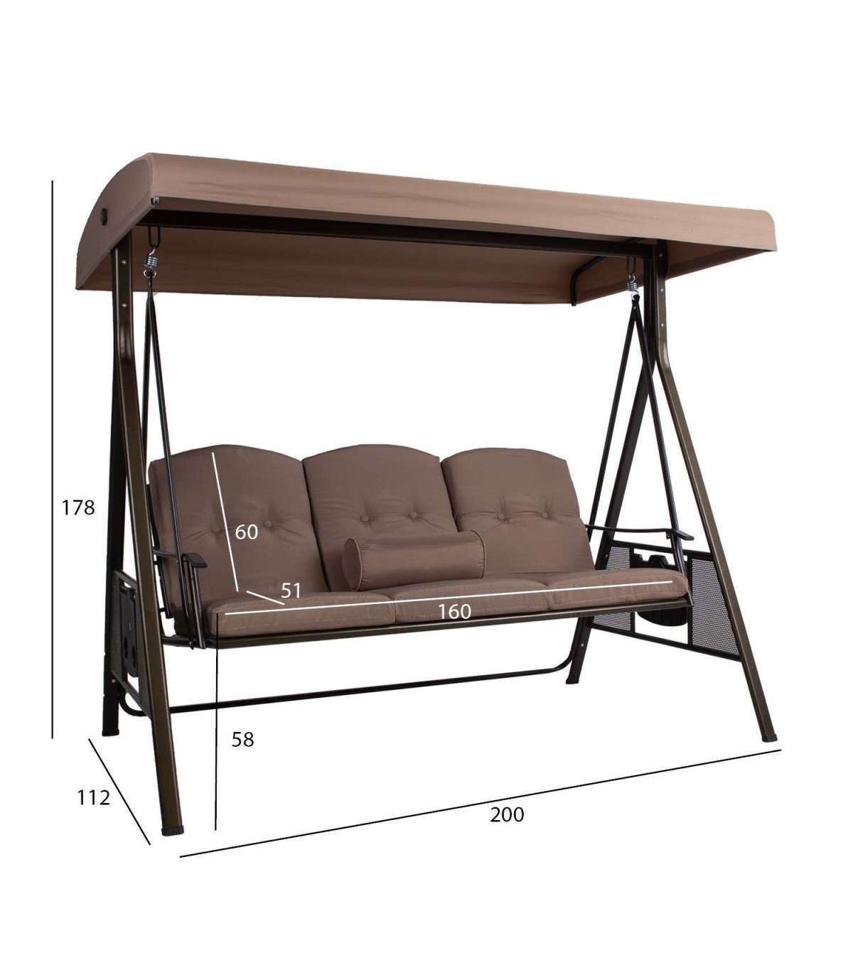 Стальная рама с порошковым покрытием коричневого цвета. Мягкие подушки сидений обиты бежевой полиэфирной тканью. Подушка толщиной 8см. Подушки съемные. Крыша: бежевая полиэфирная ткань. Размеры сиденья 160xS51xH60см. Высота от земли 57см. Складной пластиковый столик с подстаканниками по бокам. Максимальный вес 250 кг.
