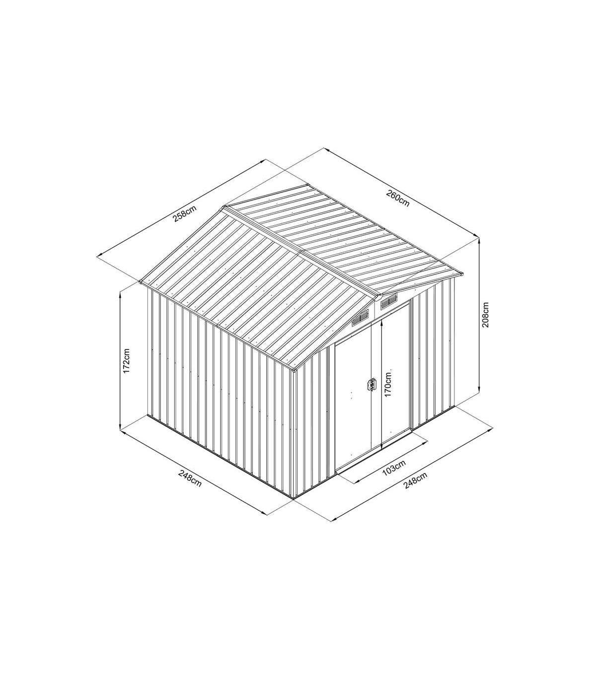 Размеры, включая свесы крыши (Д х Ш х В): 260 x 258 x 208 см.