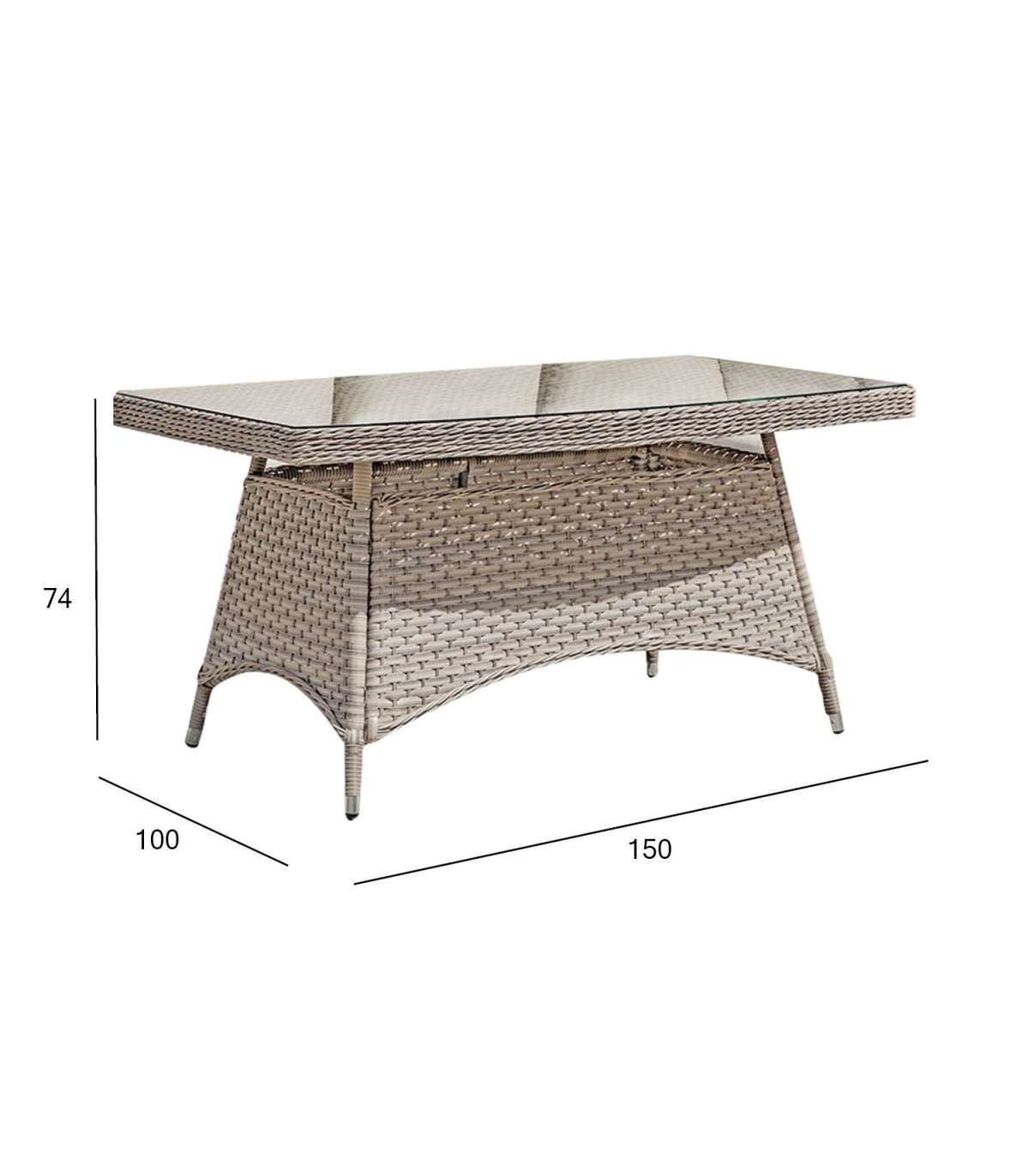 Стол EDEN 150x100xH74см. Каркас стола изготовлен из алюминия и обтянут пластиковым плетением. Столешница: закаленное прозрачное стекло толщиной 5 мм. Продукт долговечен в изменяющихся погодных условиях и очень прост в уходе. Чтобы продлить срок службы уличной мебели, мы рекомендуем использовать чехлы для уличной мебели. ХРАНЕНИЕ: в конце летнего сезона рекомендуем хранить садовую мебель в помещении. Очистите и высушите мебель перед хранением. Используйте для хранения прохладное, сухое, хорошо проветриваемое помещение.
