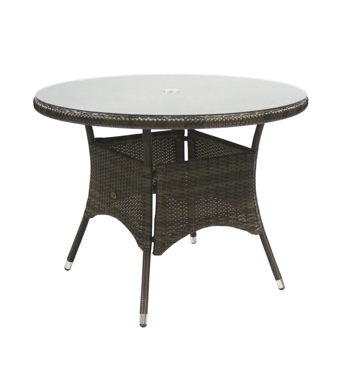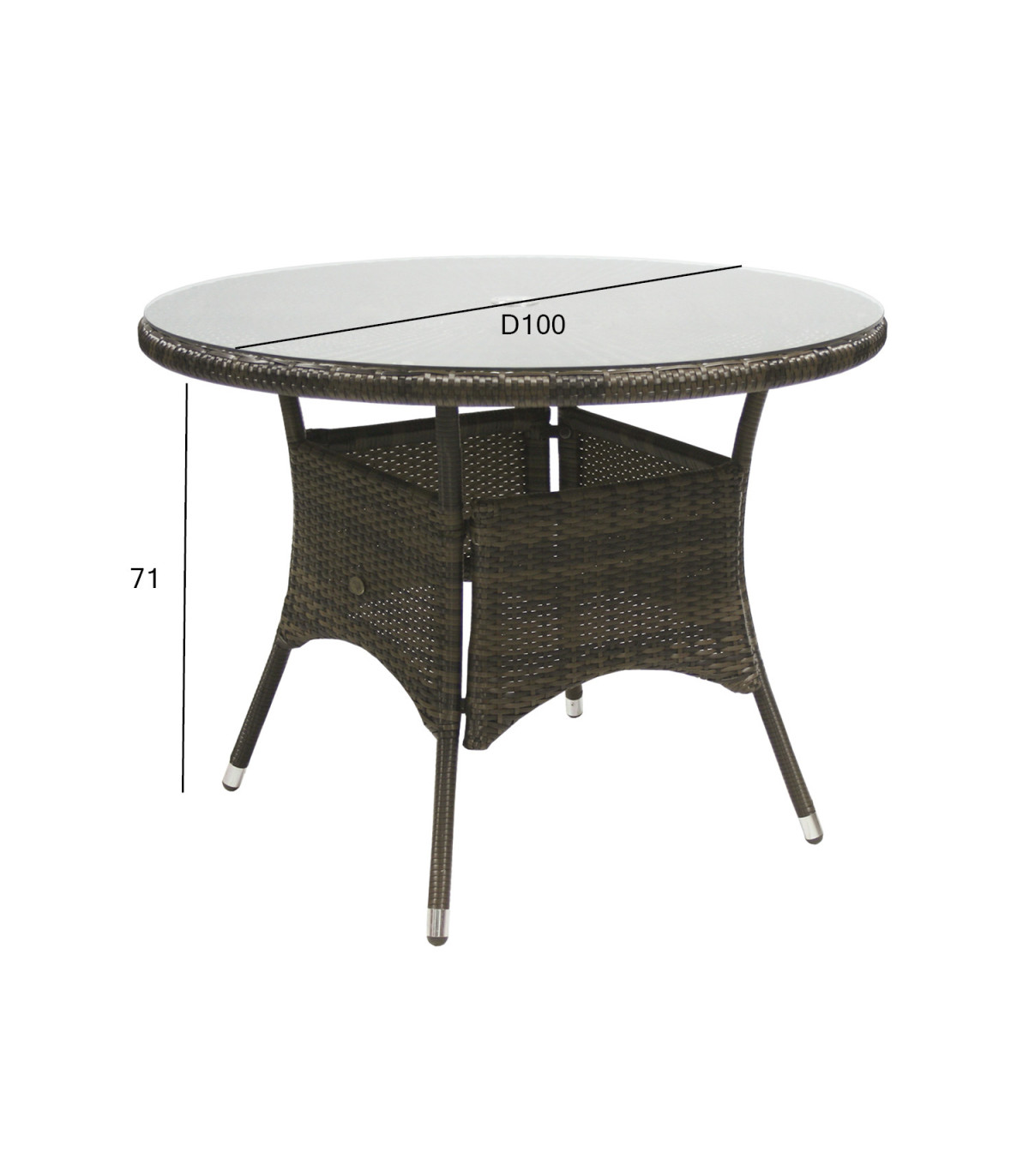 Стол WICKER D100xH71см. Столешница: прозрачное стекло, алюминиевая рама с пластиковым плетением, цвет: темно-коричневый. Продукт устойчив к погодным условиям. Рекомендация HoReCa. Цветовой код пластикового плетения: JY78098.