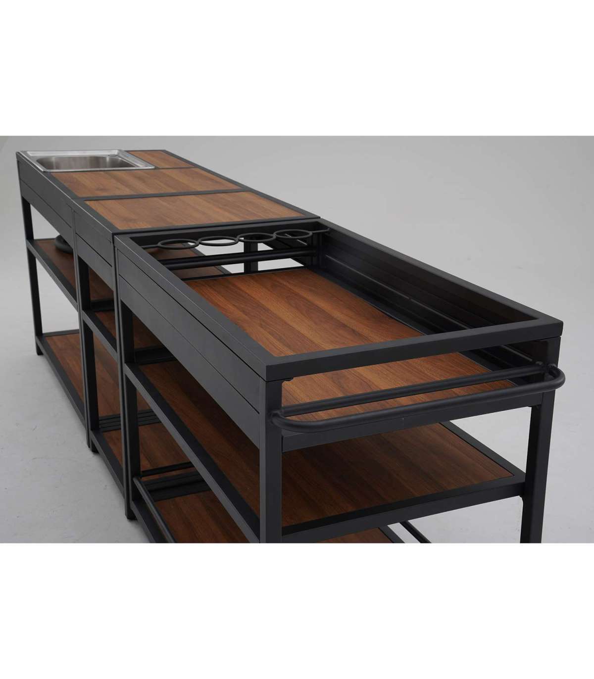 Mitmekülgne ja funktsionaalne väliköök sobib ideaalselt koduaeda, terrassile või toitlustusettevõtete välialal kasutamiseks. Piiretega riiulid, pudelite ja pokaalide hoidikud pakuvad piisavalt ruumi toiduainete, nõude ja köögitarvete turvaliseks paigutamiseks. Tänu kraanikausile on kööginurga kasutamine ja puhtana hoidmine lihtne ja mugav.