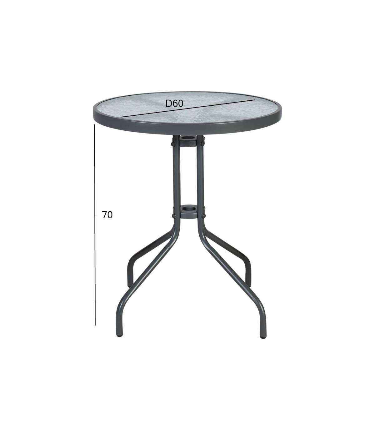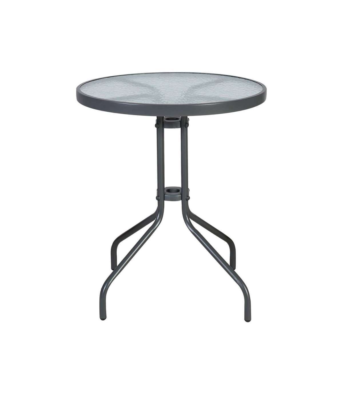 Стол BISTRO D60xH70см. Вы можете создать уютную зону отдыха на балконе или в саду по своему вкусу, добавив подходящие стулья. Столешница изготовлена из прозрачного волнистого закаленного стекла. Металлический каркас стола серый. Продукт устойчив к изменяющимся погодным условиям. Размеры стола D60xH70см.