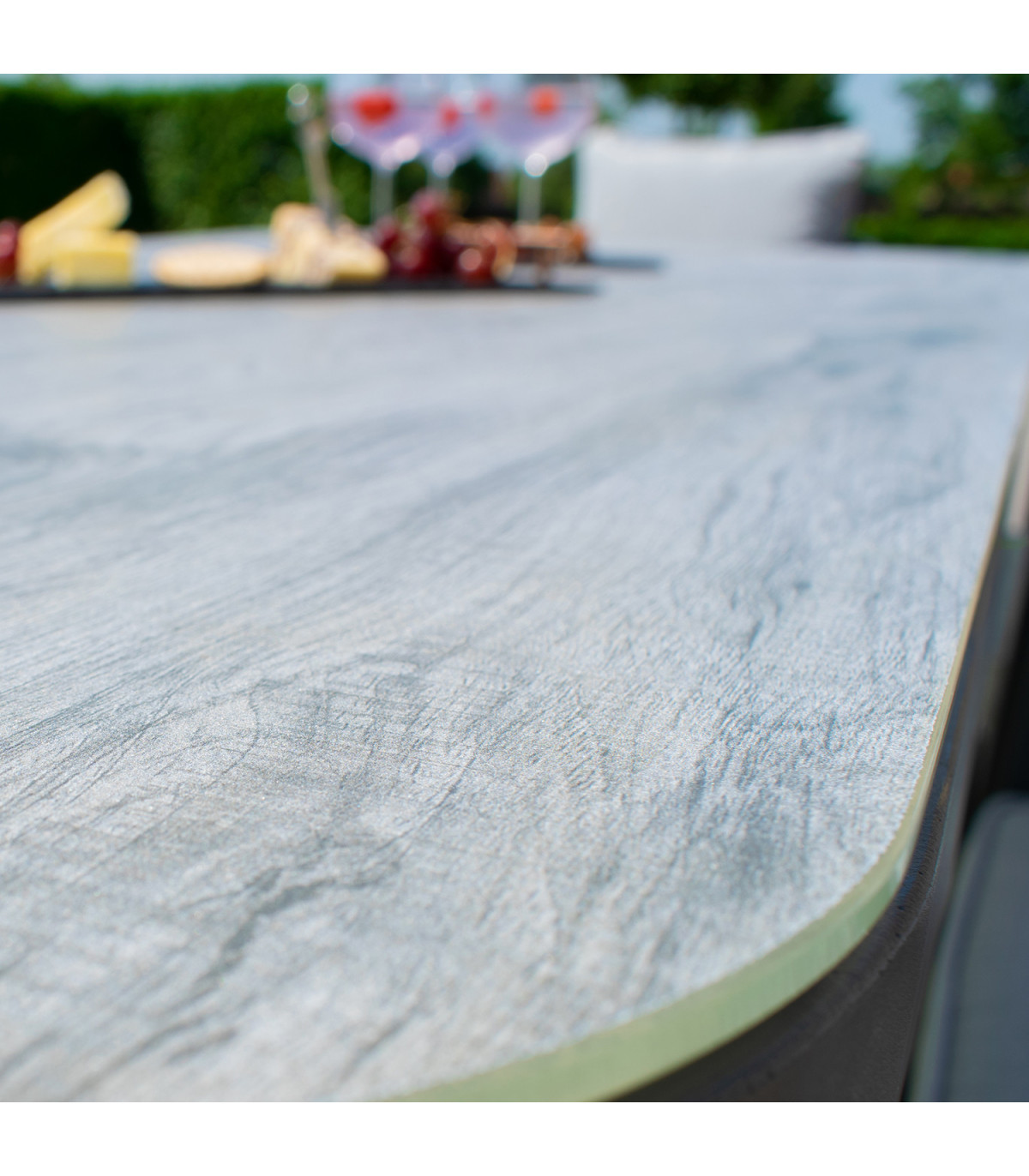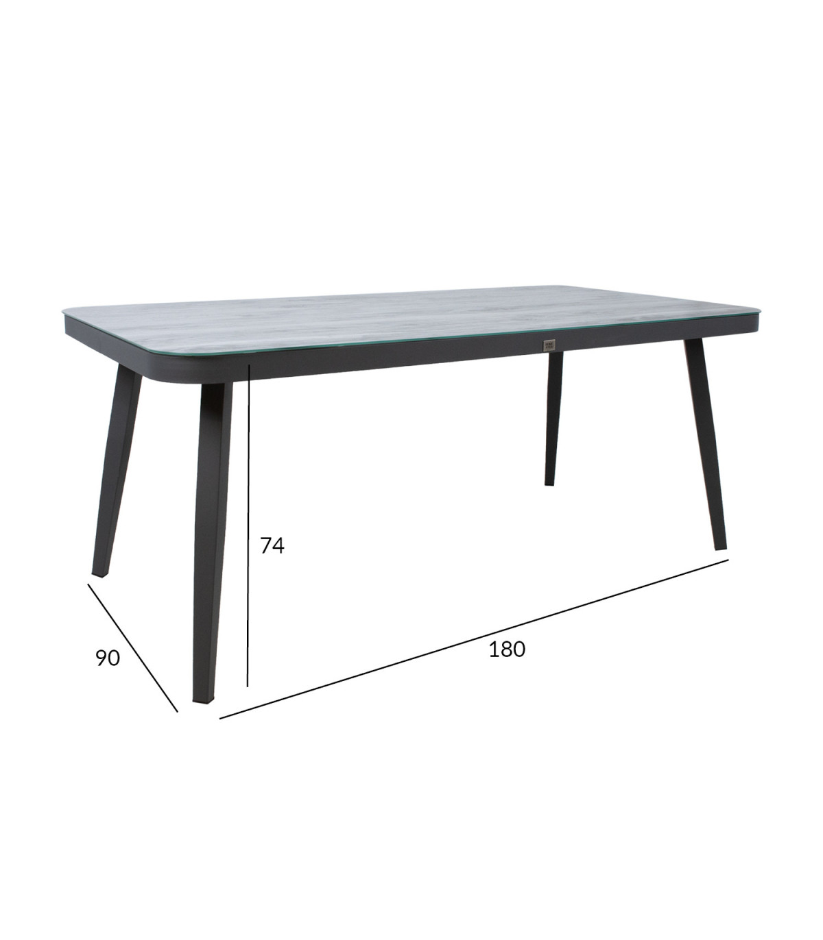 Садовый стол MARIE 180x90xH74см, серый. Столешница: серое декоративное стекло толщиной 5 мм. Ножки и рама изготовлены из алюминия и окрашены порошковой краской серого цвета. Продукт долговечен в меняющихся погодных условиях и очень прост в уходе. ХРАНЕНИЕ: в конце летнего сезона рекомендуем хранить садовую мебель в помещении. Очистите и высушите мебель перед хранением. Используйте для хранения прохладное, сухое, хорошо проветриваемое помещение.