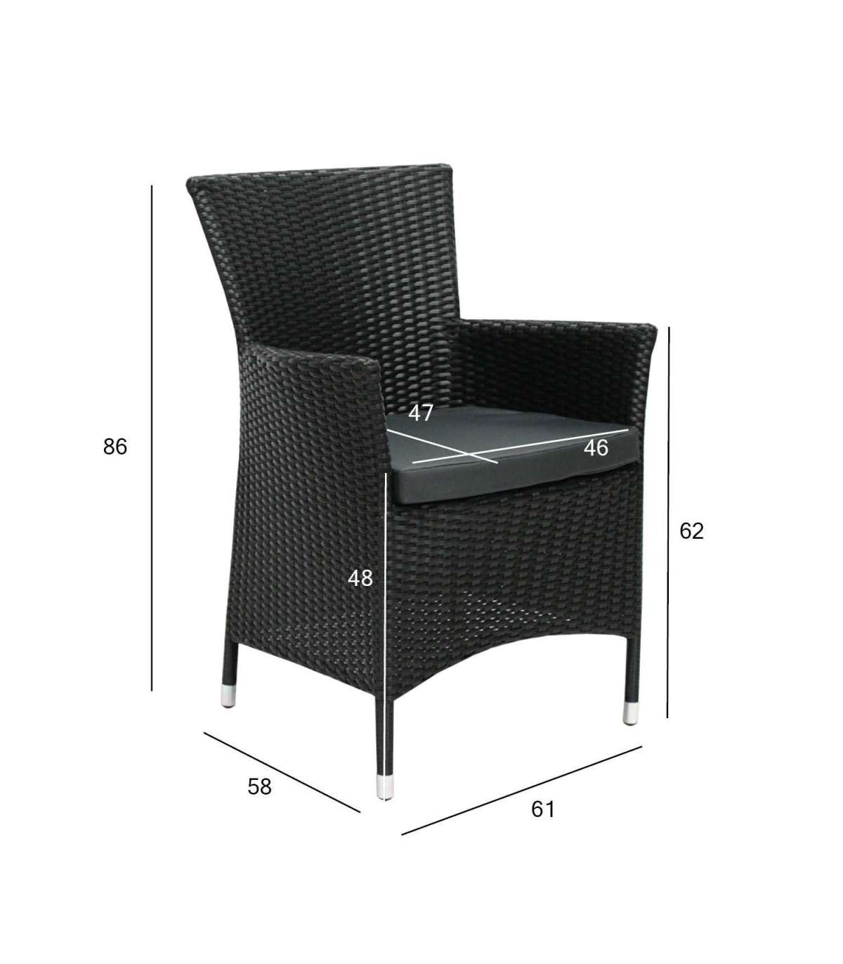 Стул WICKER-1 с подушкой, 61x58xH86cм, чёрный. Классический плетеный садовый стул удобен, прочен и устойчив к атмосферным воздействиям, он хорошо подходит как для приусадебных участков, так и для кафе. Кресло можно комбинировать с другими продуктами серии WICKER MIX & MATCH. Прочный и устойчивый стальной каркас стула обтянут пластиковым плетением. Габаритные размеры кресла 61x58xH86см. Ширина сиденья 46см, глубина сиденья 47см, высота сиденья 48см. Высота подлокотника от земли 62см. Размеры подушки сиденья 46х47х4,5см. Наволочка изготовлена ??из полиэфирной ткани. Максимальный вес 120кг. ХРАНЕНИЕ: в конце летнего сезона рекомендуем хранить садовую мебель в помещении. Очистите и высушите мебель перед хранением. Используйте для хранения прохладное, сухое, хорошо проветриваемое помещение.