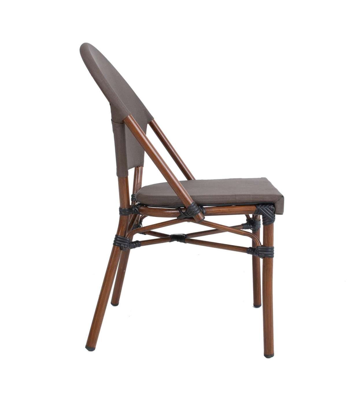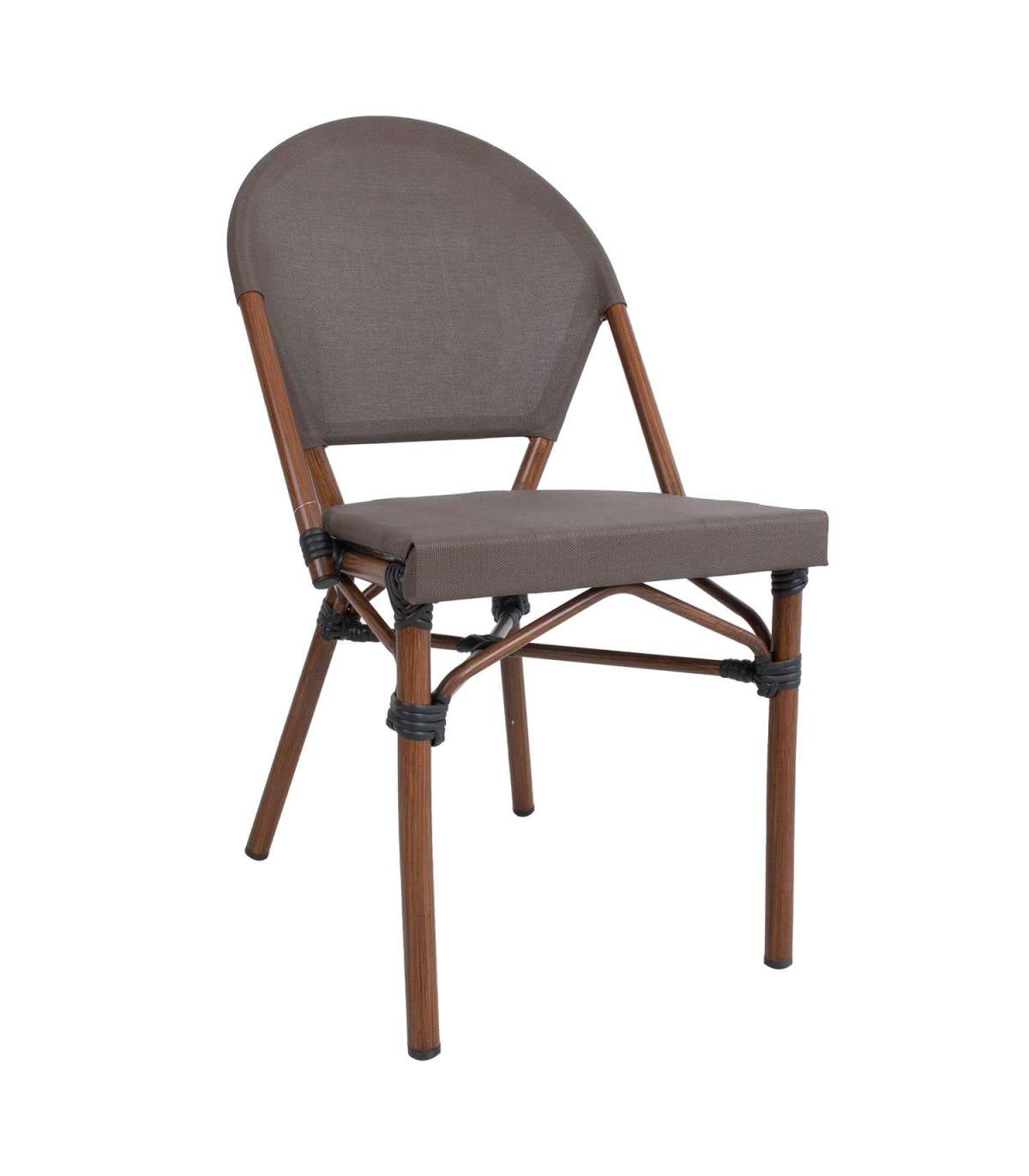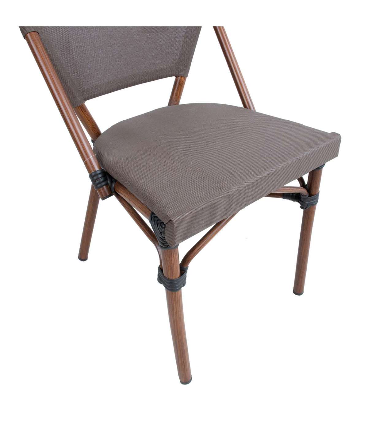 Сиденье и спинка: коричневый текстиль. Алюминиевая рамка, имитирующая коричневый цвет бамбука (D2,8x1,5 мм). Изделие можно штабелировать. Изделие устойчиво к погодным условиям и УФ-лучам. Рекомендуется для сектора HoReCa. Максимальный вес 120 кг.