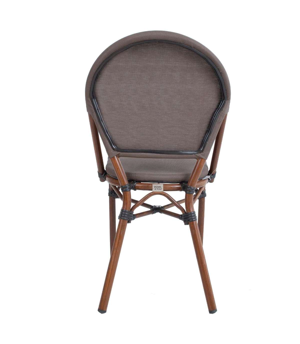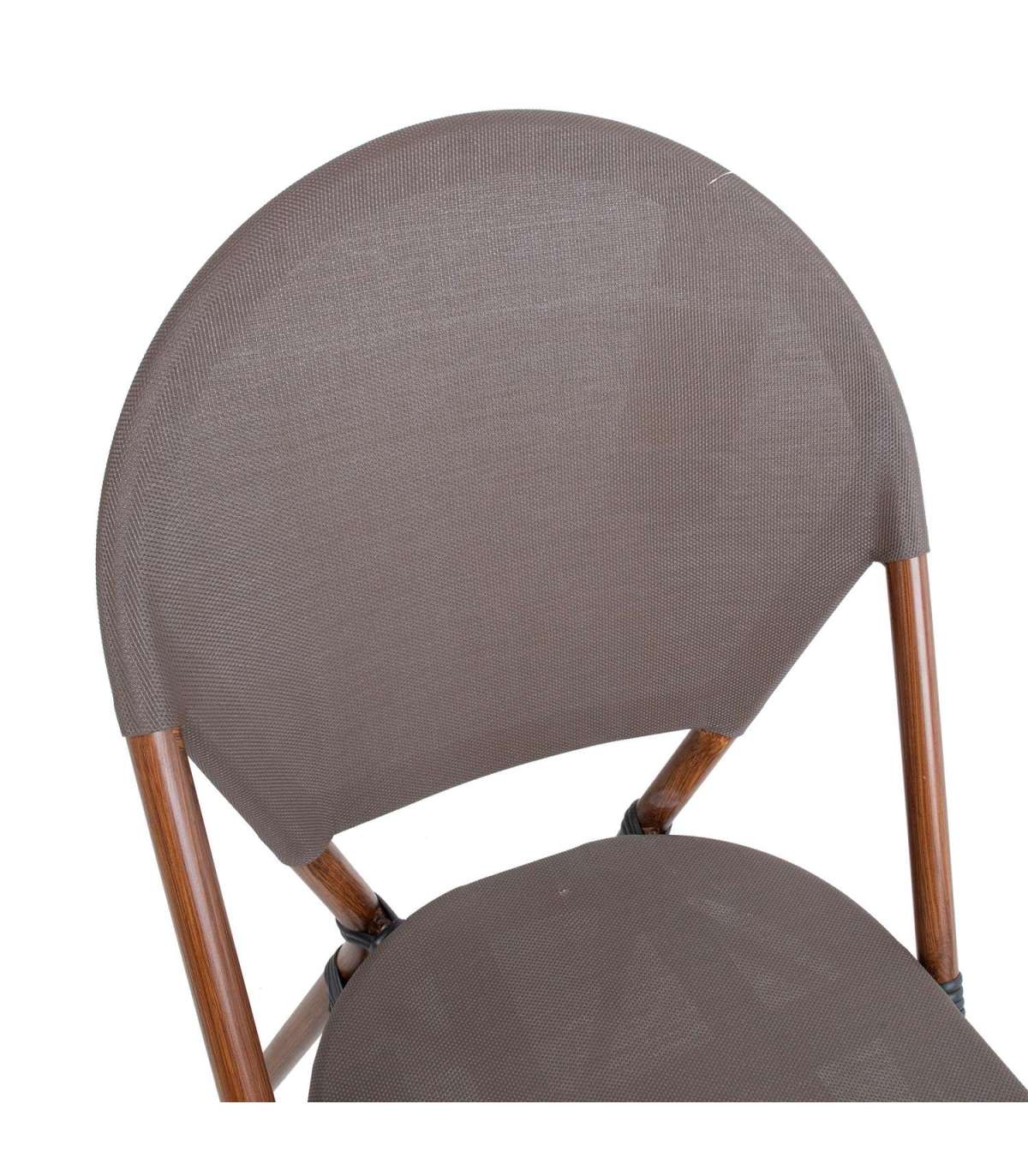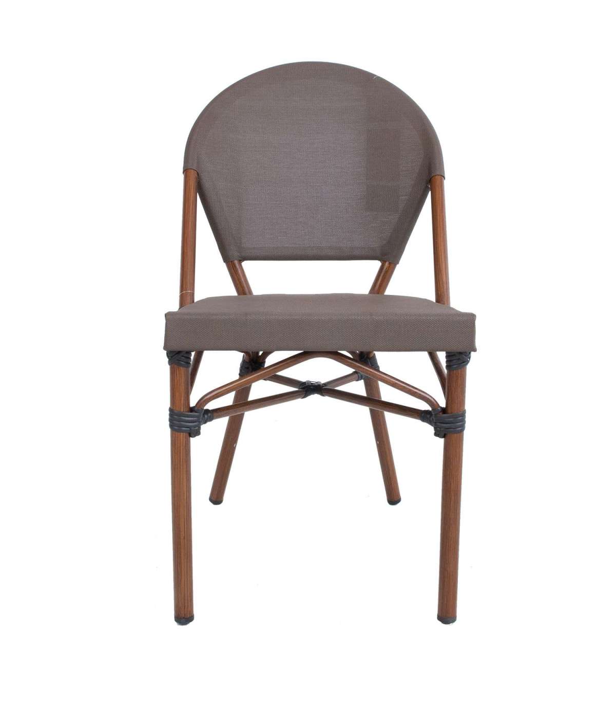 Сиденье и спинка: коричневый текстиль. Алюминиевая рамка, имитирующая коричневый цвет бамбука (D2,8x1,5 мм). Изделие можно штабелировать. Изделие устойчиво к погодным условиям и УФ-лучам. Рекомендуется для сектора HoReCa. Максимальный вес 120 кг.