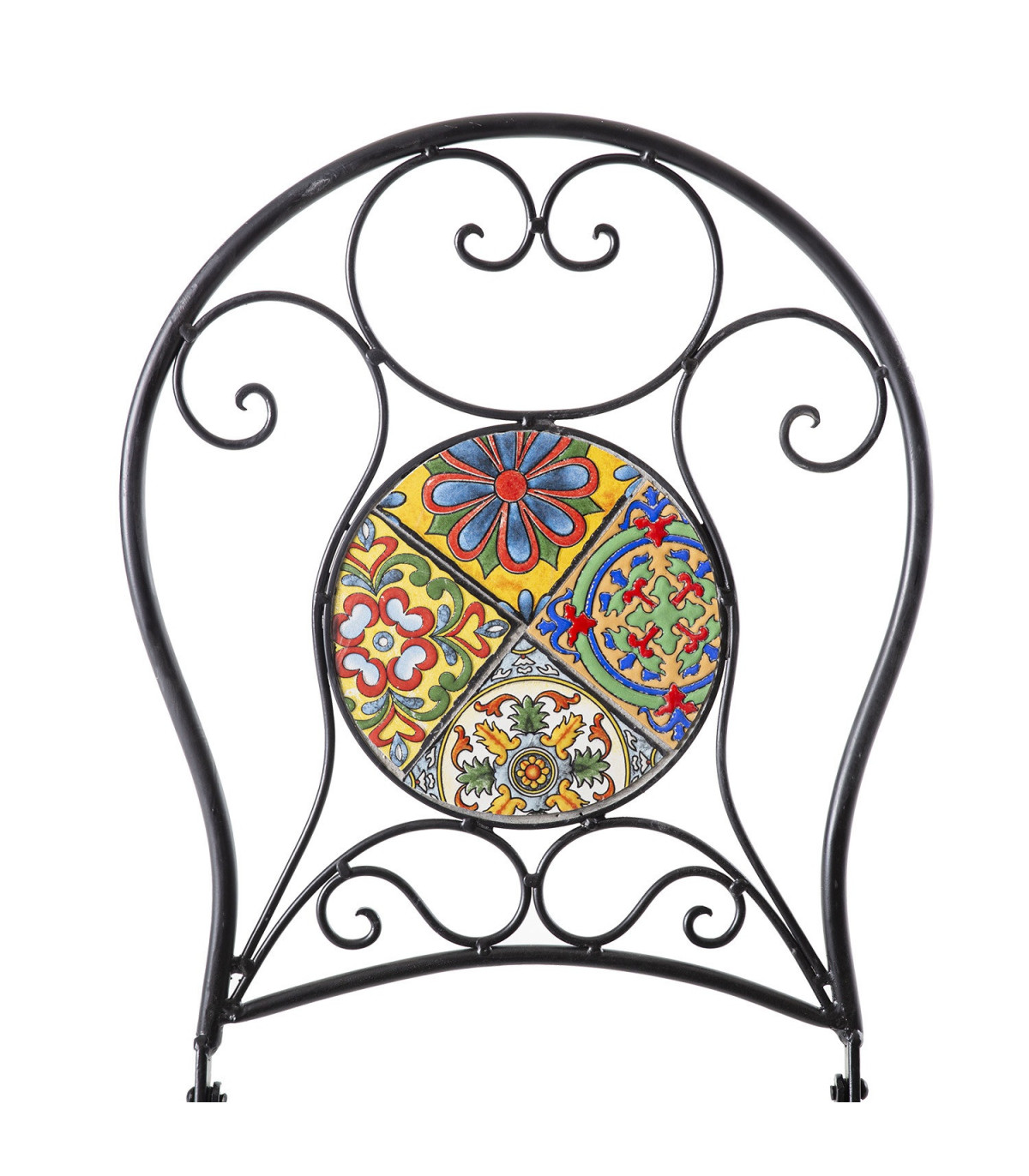 Садовый стул MOROCCO. Посередине спинки стула находится мозаичное украшение, черная металлическая рама. Стул складной. Габаритные размеры стула 40x51xH90см. Ширина сиденья 38см, глубина сиденья 38см, высота сиденья 46см. Предельный вес 90кг. Размеры стула в собранном виде 40х103х11см.