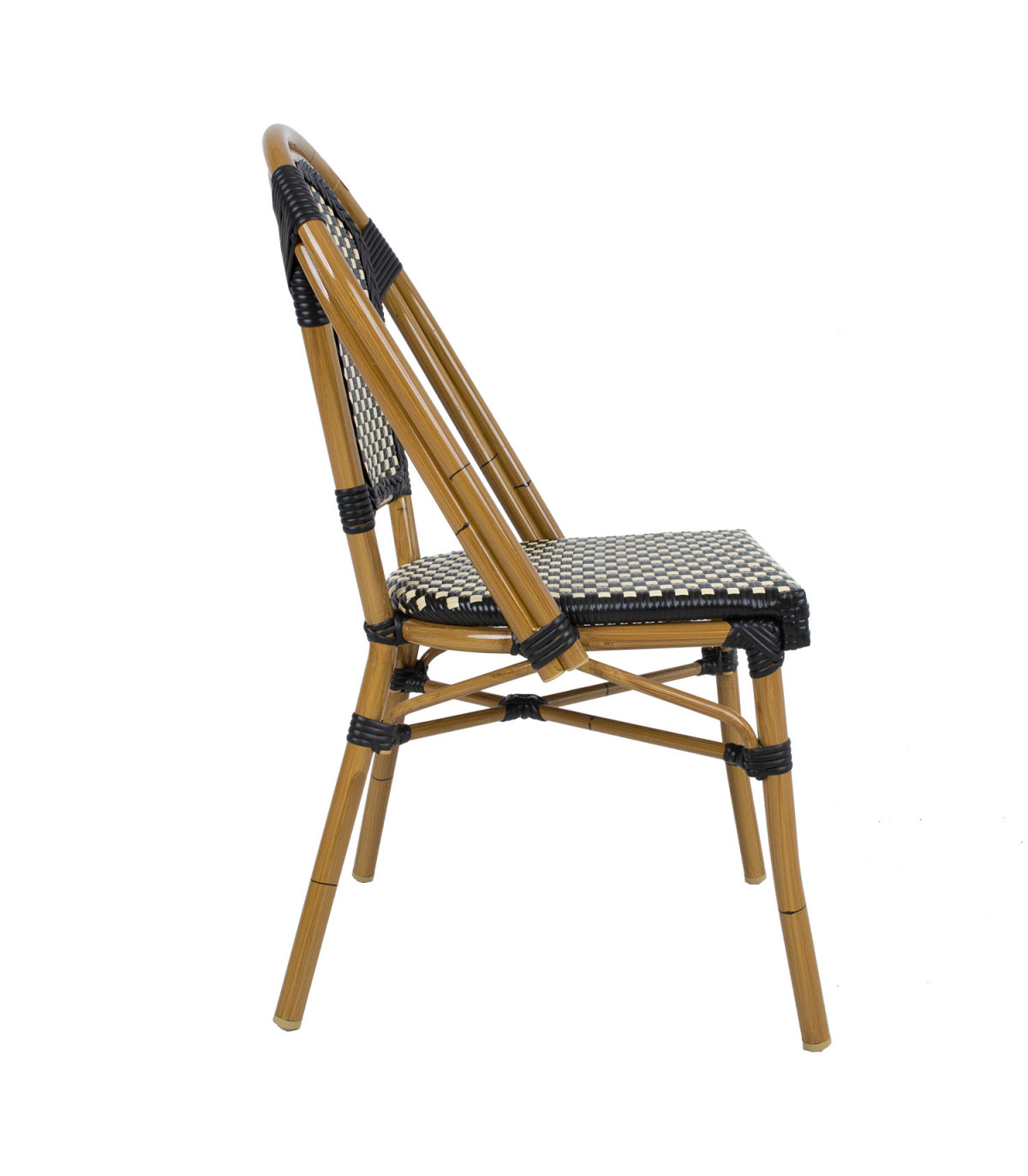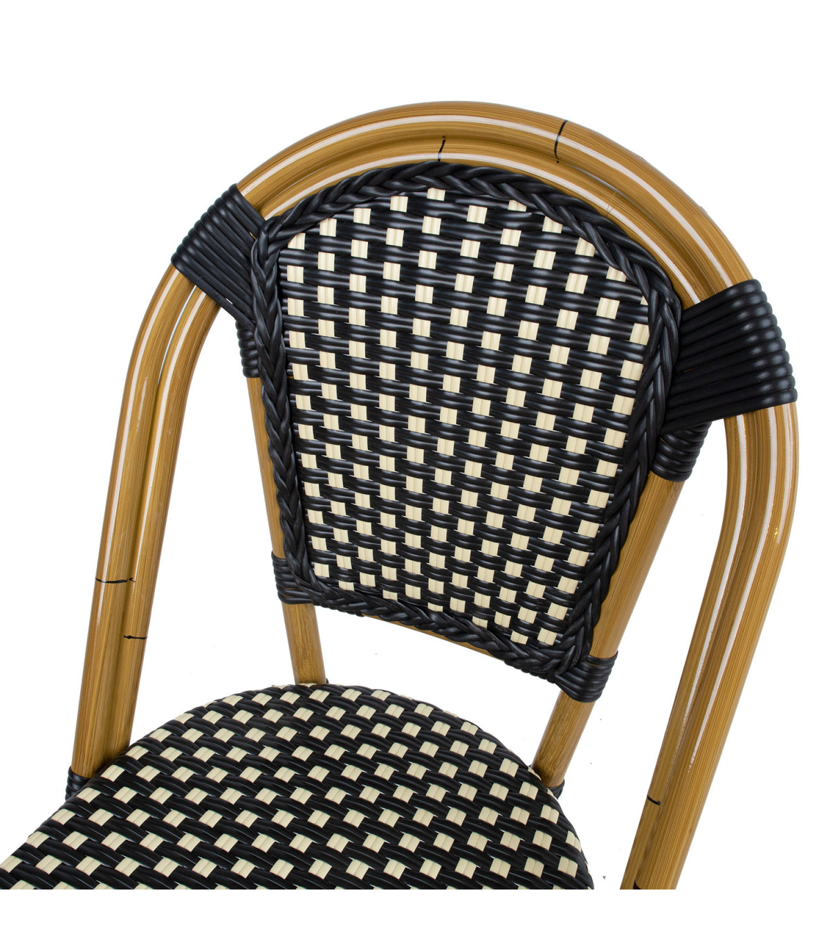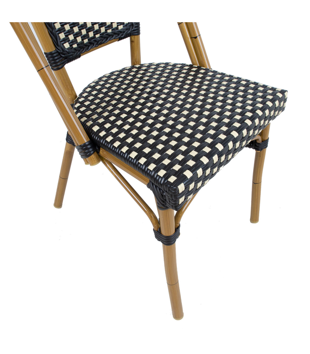 Сиденье и спинка: бежево-черный пластиковый ротанг. Алюминиевая рамка имитация бамбука бежевая (D2,8x1,5 мм). Изделие можно штабелировать. Изделие устойчиво к погодным условиям и УФ-лучам. Рекомендуется для сектора HoReCa. Максимальный вес 120 кг.