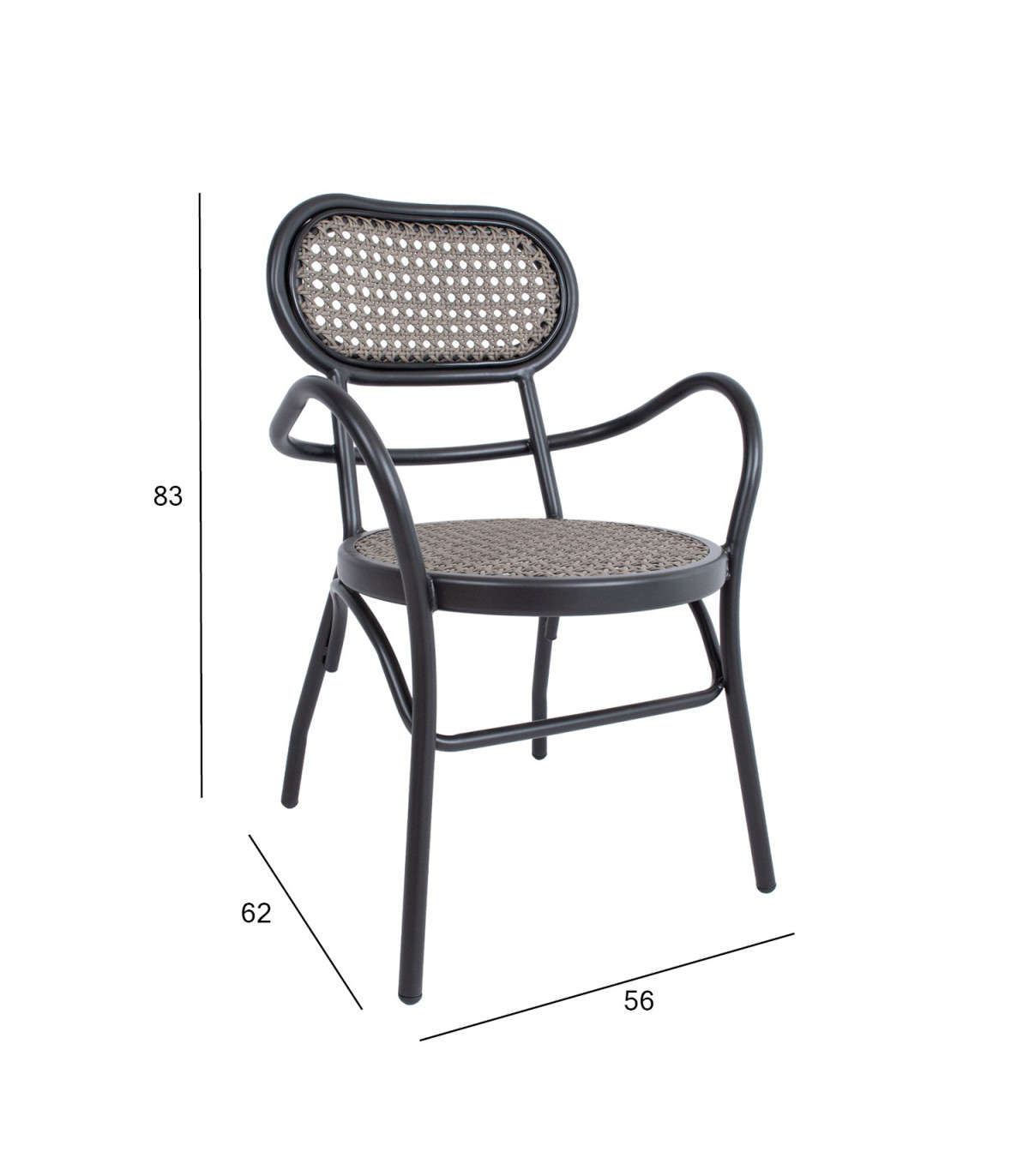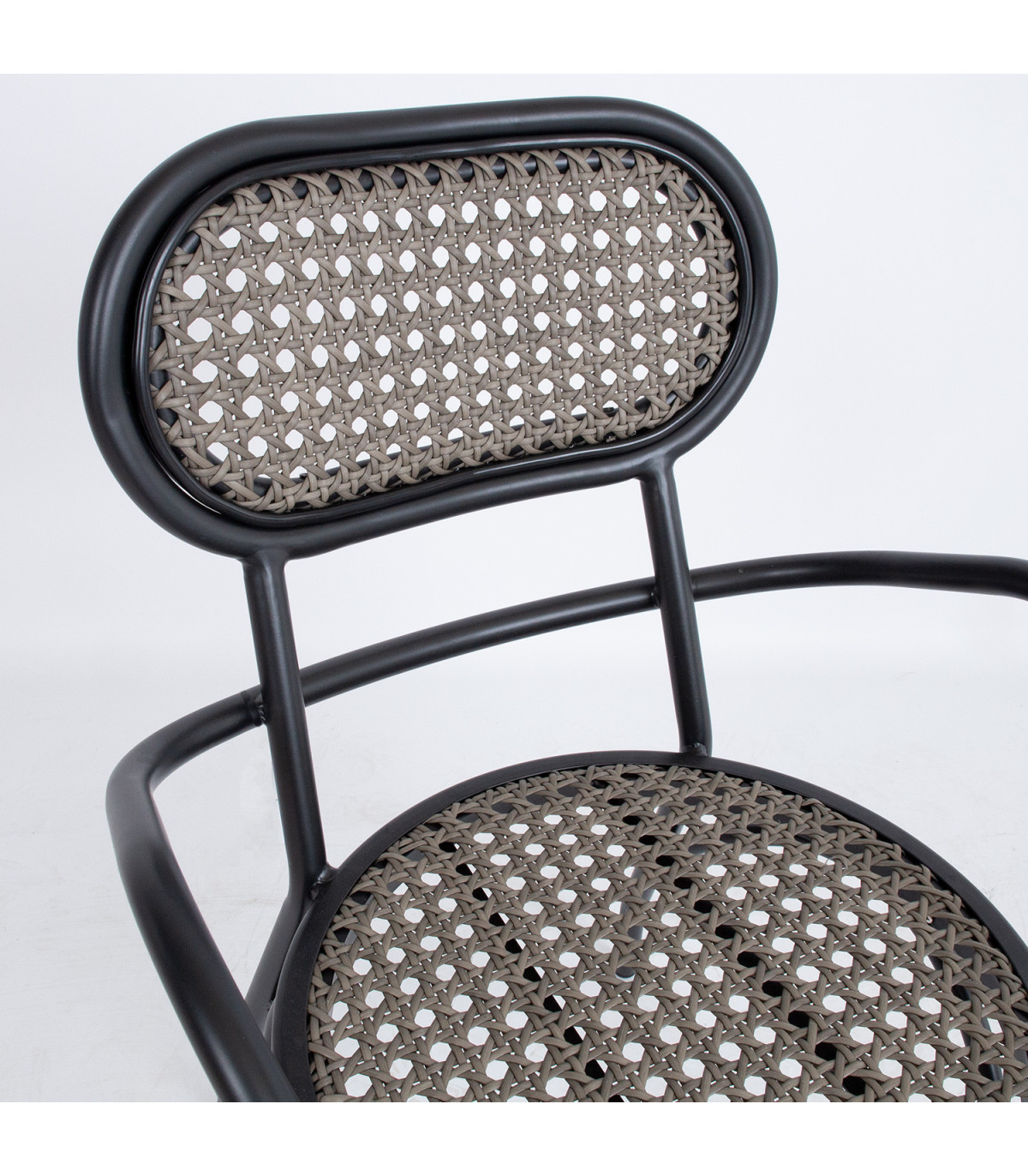 Сиденье и спинка: коричневый пластиковый ротанг. Рама из алюминия, покрытого черной порошковой краской (труба D25x1,8 мм). Стул штабелируемый.