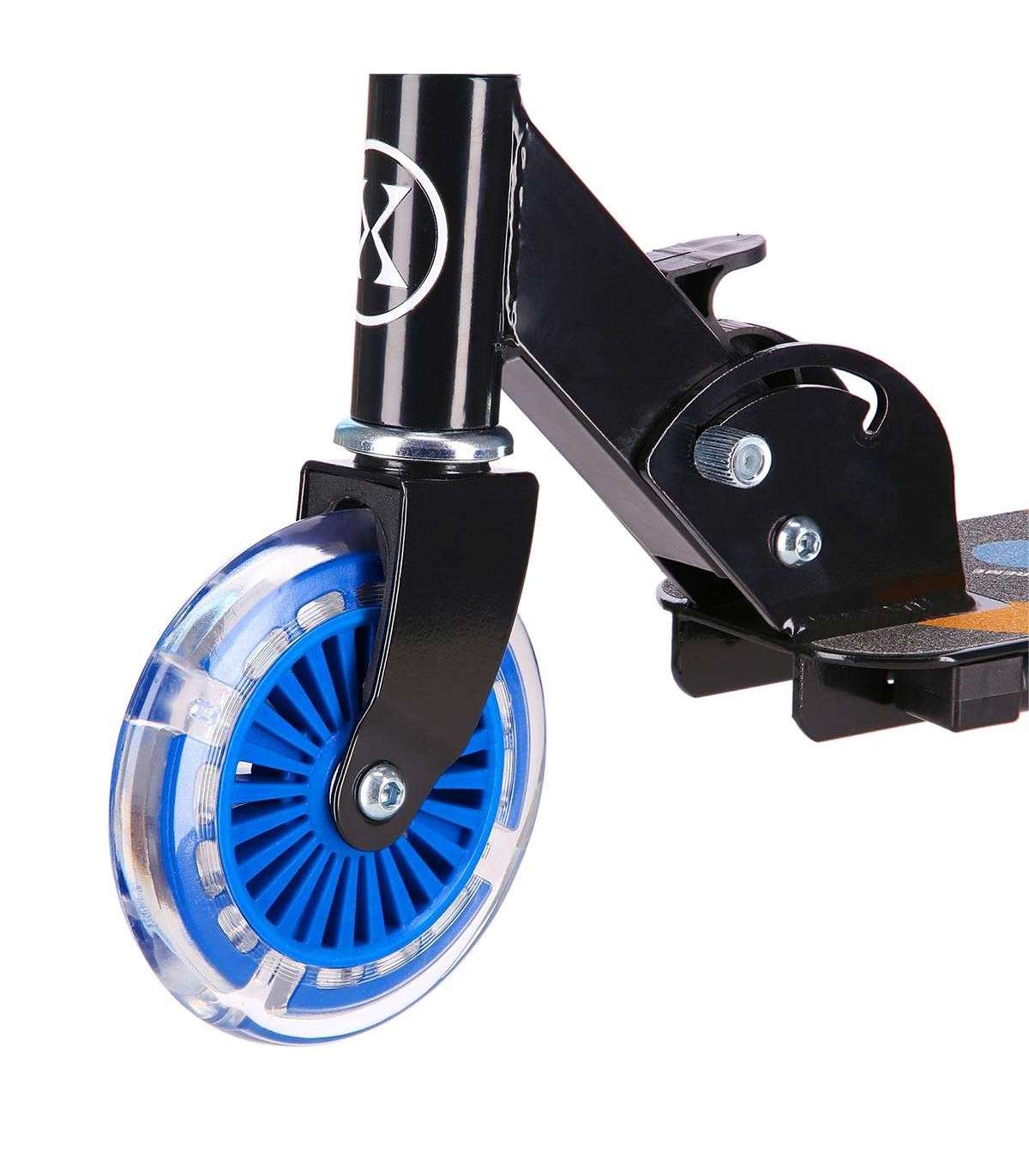 Самокат оснащён функцией быстрой и простой складываемости. Достаточно потянуть один рычаг — и самокат сложен. Также складываются ручки на руле, что очень удобно при транспортировке.