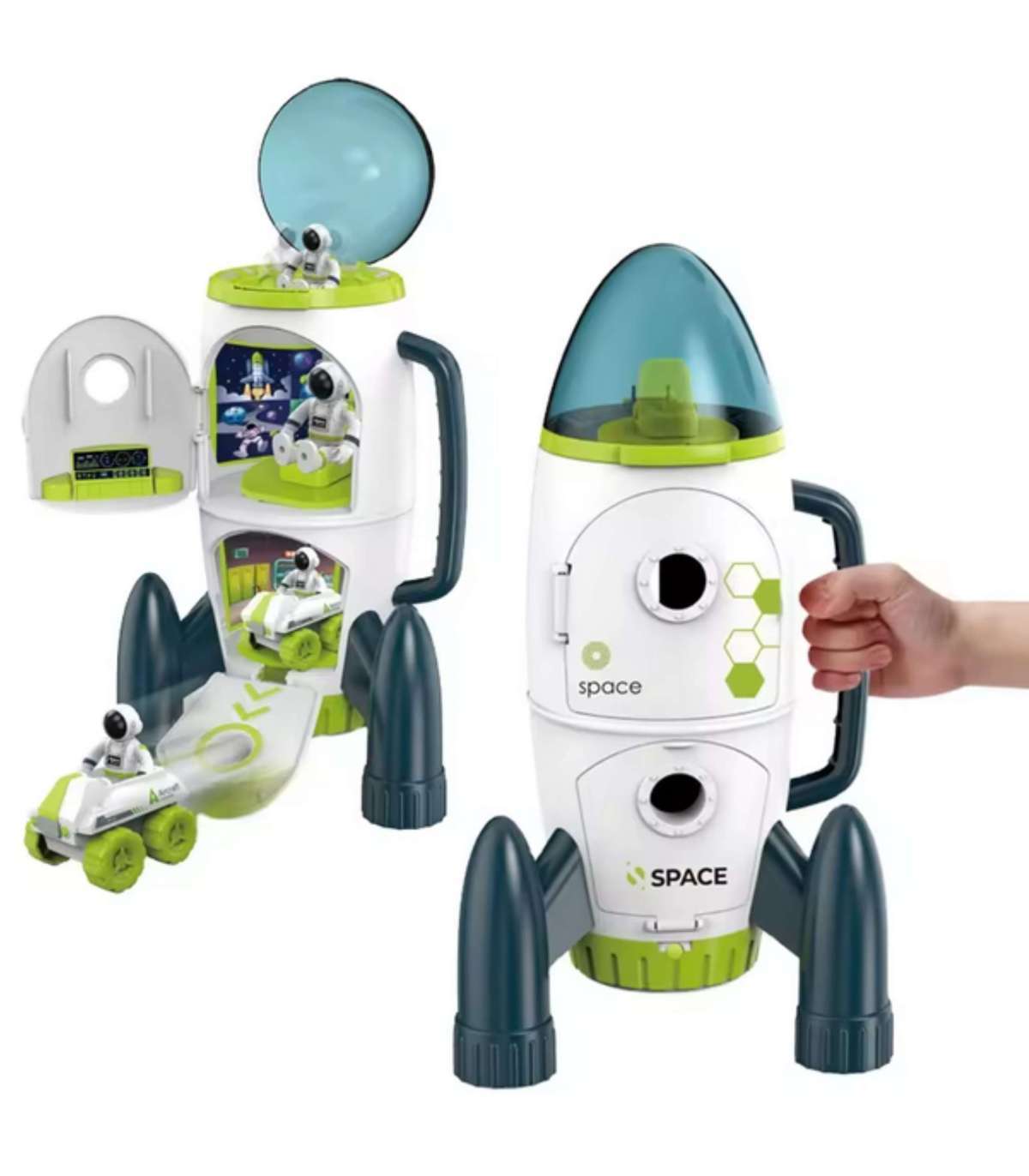 Przenieś swoje dziecko w fascynujący świat kosmosu z Interaktywną rakietą kosmiczną od Woopie! Ten niezwykle kreatywny zestaw zabawkowy to idealne połączenie nauki i zabawy dla małych odkrywców. To nie jest zwykła zabawka – to zestaw do eksploracji galaktyki, który zapewni godziny twórczej i edukacyjnej zabawy. Dzięki licznym funkcjom i realistycznym szczegółom dziecko może wcielić się w rolę astronauty, dowódcy misji czy operatora łazika. Rakieta została stworzona tak, by stymulować wyobraźnię i rozwijać umiejętności poprzez zabawę. Produkt składa się z kilku interaktywnych elementów, z których każdy ma inne funkcje. Figurkę astronauty można umieścić w obrotowym fotelu w górnej kapsule, a następnie opuścić do dolnej części rakiety, gdzie czeka gotowy do jazdy łazik kosmiczny. Całość uzupełnia efekt dźwięku odliczania do startu oraz świecąca podstawka, co czyni zabawę jeszcze bardziej realistyczną i ekscytującą. Idealna do zabawy w domu, w przedszkolu, a także w ogrodzie czy na plaży. Dzięki poręcznemu uchwytowi dzieci mogą z łatwością przenosić rakietę i kontynuować kosmiczne misje wszędzie tam, gdzie tylko poniesie ich wyobraźnia. To również świetna opcja na rodzinne pikniki – dziecko może zabrać swoją rakietę w plener, dzielić się zabawą z rodzeństwem czy rówieśnikami i przeżywać przygody w każdym miejscu! Każdy element zestawu został zaprojektowany z myślą o bezpieczeństwie, jakości i rozwoju dziecka. Zabawka nie tylko zapewnia mnóstwo rozrywki, ale także wspiera rozwój logicznego myślenia, motoryki i kreatywności. Idealny prezent dla każdego fana kosmosu!