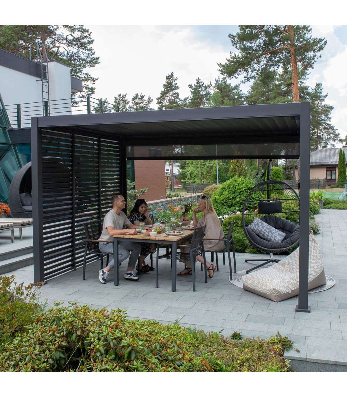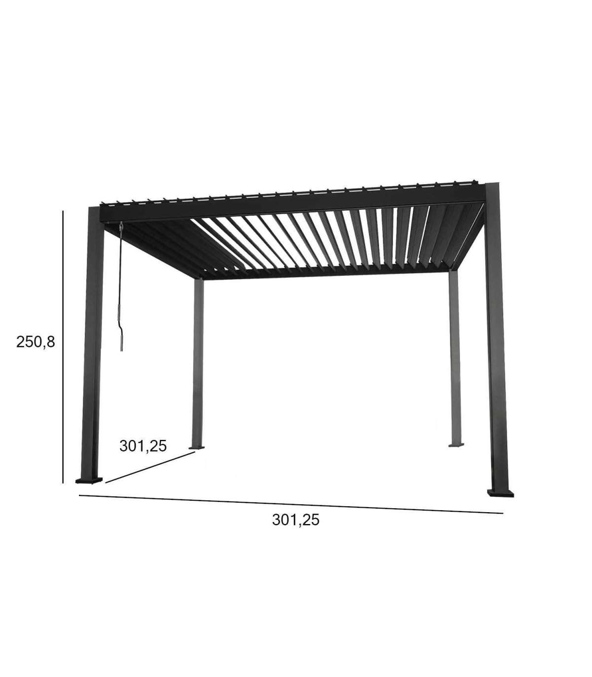 Шатёр MIRADOR 3x3xH2,5м, тёмно-серая. Современный, элегантный и функциональный навес/садовый павильон уместится везде - в саду, на террасе, у бассейна или в качестве навеса для машины и может использоваться круглый год. Инновационная крыша с жалюзи открывается и закрывается с помощью рычага, обеспечивая защиту и тень от небольшого дождя и палящего солнца. С закрытыми ламелями крыша полностью водонепроницаема. Благодаря встроенной водосточной системе вода безопасно сливается с крыши. Как вариант, можно выбрать подходящий тип стены или штор, придав навесу другой вид и функциональность. В стоимость не входят боковые стенки и шторы, их необходимо заказывать отдельно. Каркас навеса изготовлен из алюминия и окрашен порошковой краской темно-серого цвета. 4 опорные стойки 111x111 мм, горизонтальная балка 140x75 мм, жалюзи из оцинкованной стали 173x30 мм. Установите навес на устойчивую и ровную поверхность и надежно закрепите его. Если вы используете навес круглый год, убедитесь, что на крыше не слишком много снега. Как можно скорее уберите скопившийся снег. Убедитесь, что отверстия для слива воды чистые. Перед началом зимнего сезона убедитесь, что в боковых стойках/опорах нет воды. Если вода замерзнет, ??она может повредить стойки/столбы.