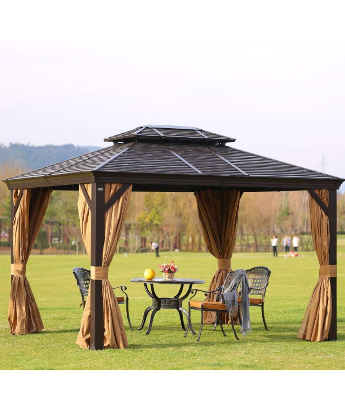 Алюминиевая рама с порошковым покрытием. Боковая столба 120х120мм, поперечина 130x100мм, ребра крыши 52,2x40мм. Гальванизированная металлическая крыша, толщина 4мм. Стенки : полиэстер 180г/м2, противомоскитные сетки из textiline. ВНИМАНИЕ: шатёр должен быть фиксирован на поверхность. Шатёр не предназначен для использования при сильном ветре и дожде.Продавец не несет ответственности за повреждения, вызванные погодными условиями.