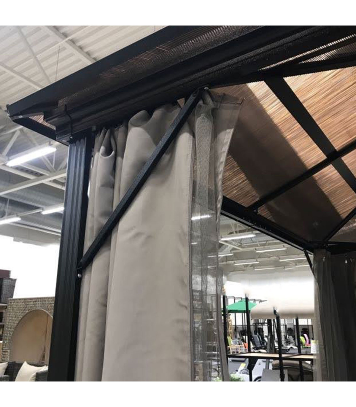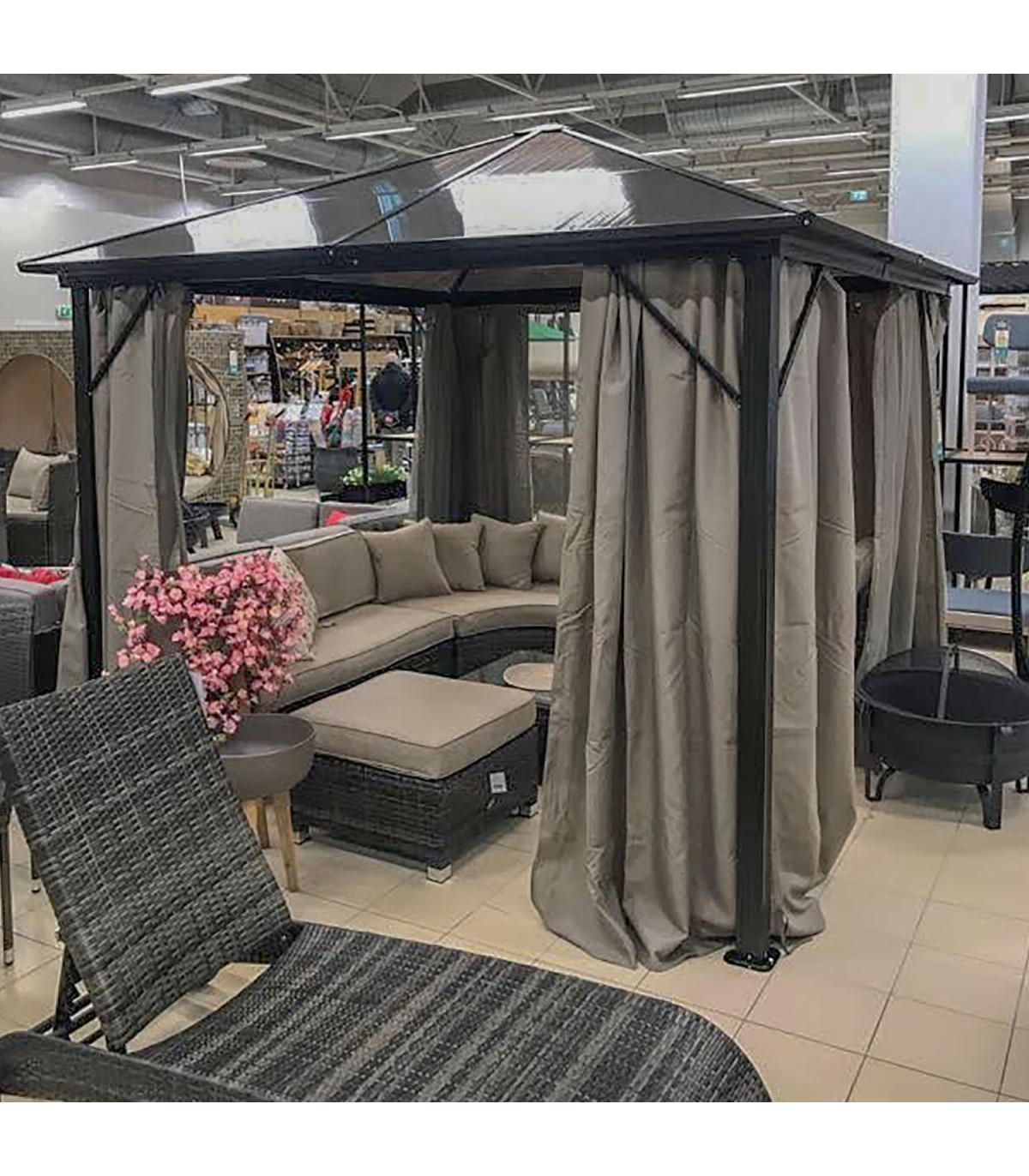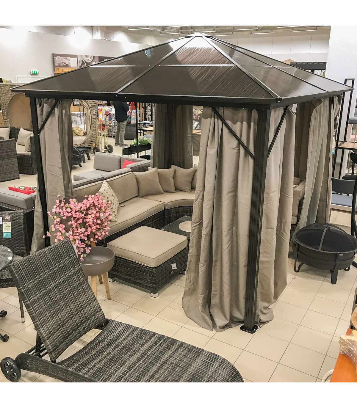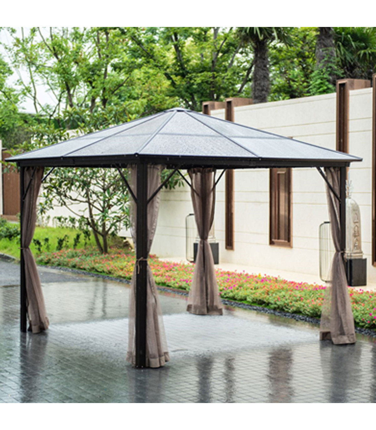 Шатёр ZURICH 3x3xH2,63м с крышей из поликарбоната, коричневый. Элегантный и функциональный шатёр/садовый павильон обеспечивает защиту и тень как от небольшого дождя, так и от палящего солнца и позволяет наслаждаться отдыхом на свежем воздухе независимо от погоды и времени. Со всех сторон шатрa бежевые шторы из полиэстера и нейлоновые москитные сетки. Основная конструкция шатрa выполнена из алюминия. Все детали рамы окрашены порошковой краской. Панели крыши: поликарбонат 6 мм. Это атмосферостойкий, экологически чистый материал, который предлагает уникальное сочетание долговечности и превосходной ударопрочности. Материал также обладает хорошей светопроницаемостью и стойкостью к высоким температурам. Размеры боковых стоек 76х76мм, балок крыши 109х50мм, нервюр 41х38мм. ВНИМАНИЕ: в случае экстремальных погодных условий или штормового предупреждения нельзя оставлять шатёр без присмотра. Сильный ветер, дождь или снег могут повредить шатёр. ХРАНЕНИЕ: для продления срока службы шатрa рекомендуем в конце летнего сезона разобрать ее и хранить в сухом, хорошо проветриваемом помещении. Если шатёр остается на зиму, следите, чтобы на крыше не скапливался снег. Как можно скорее уберите лишний снег. По окончании летнего сезона снимите москитные сетки и шторы. Очистите и высушите шторы перед хранением.