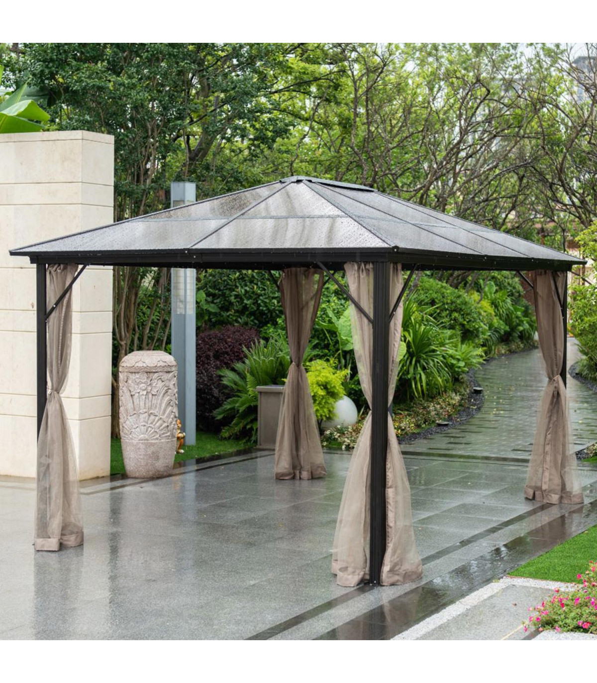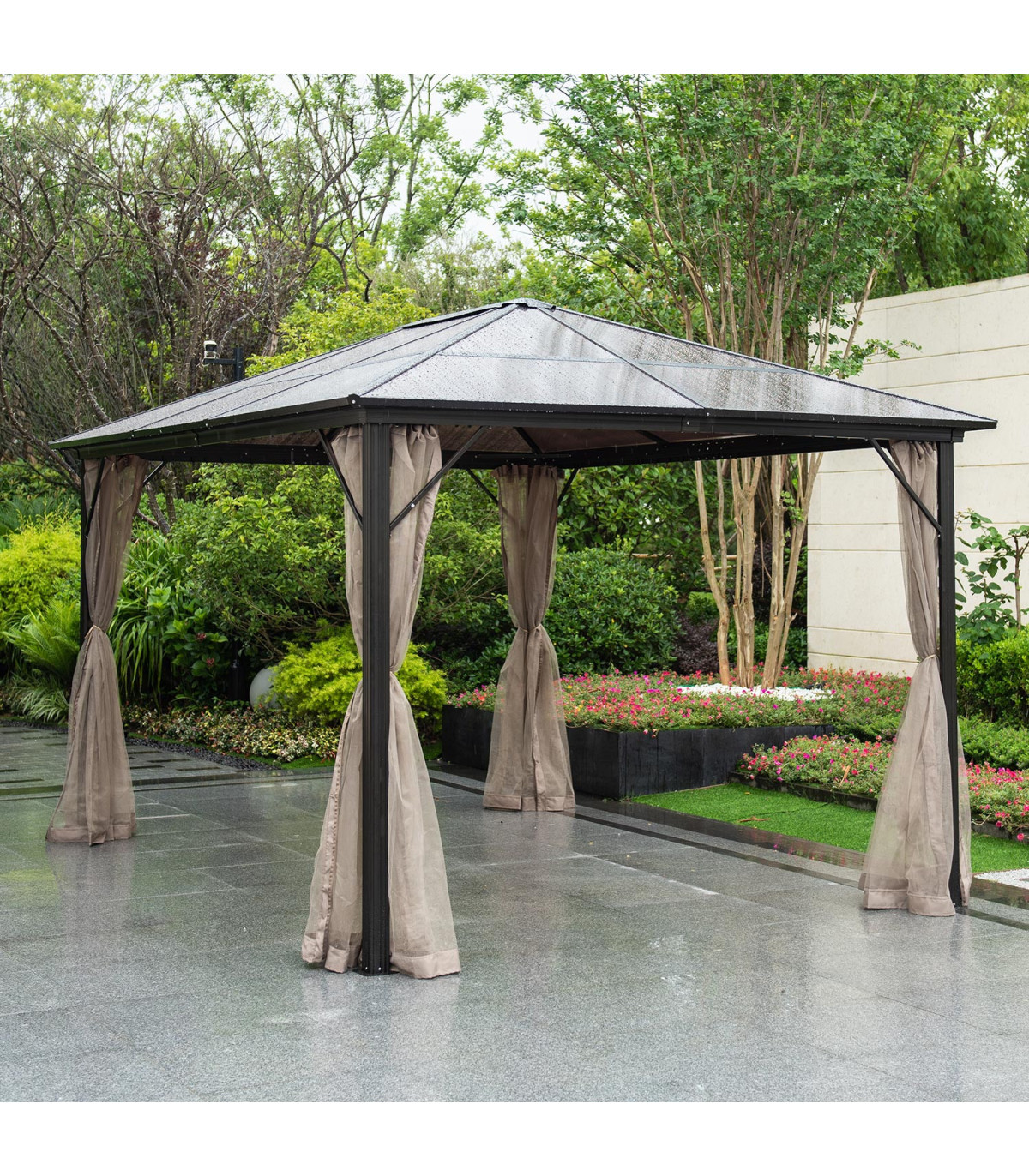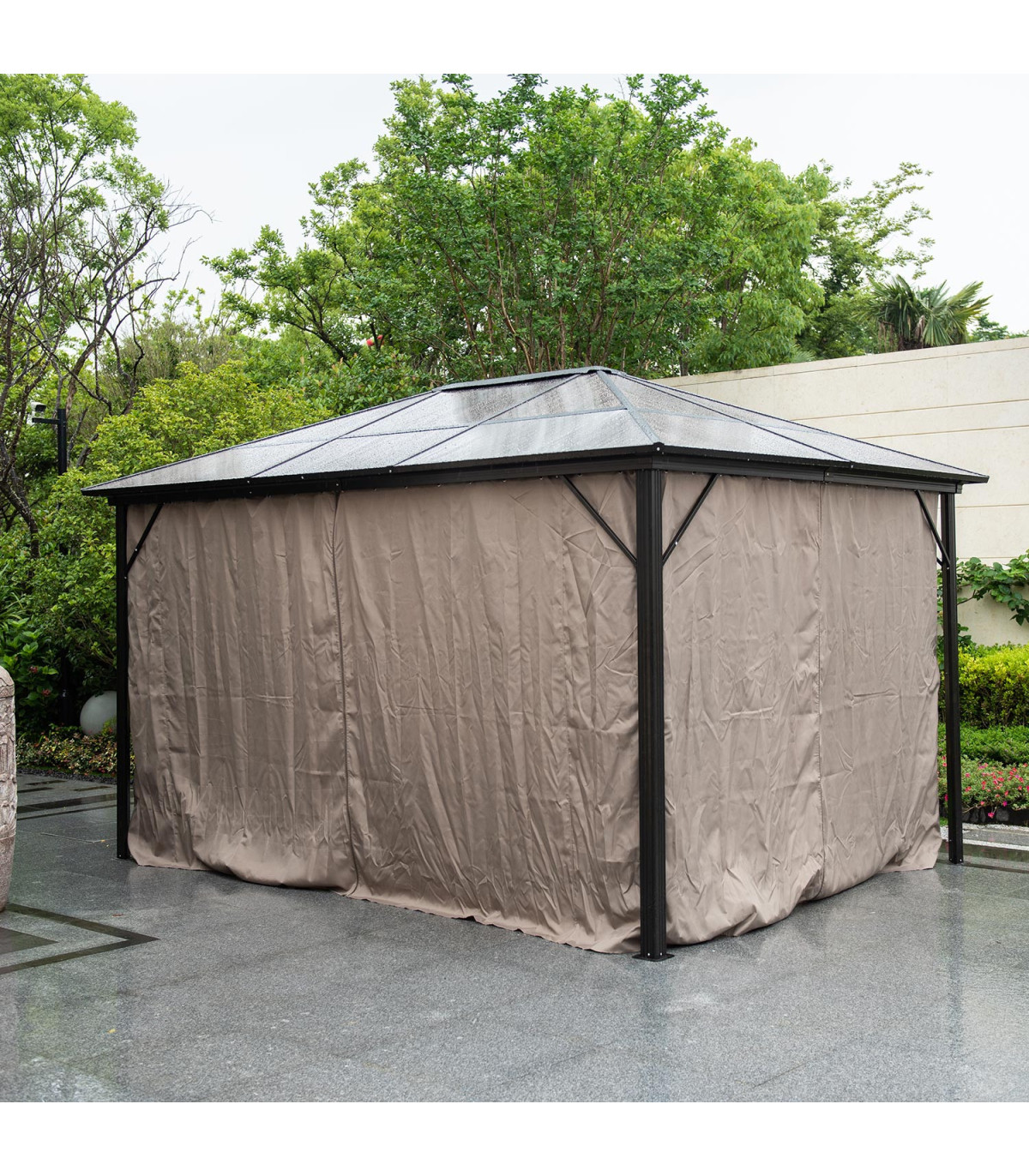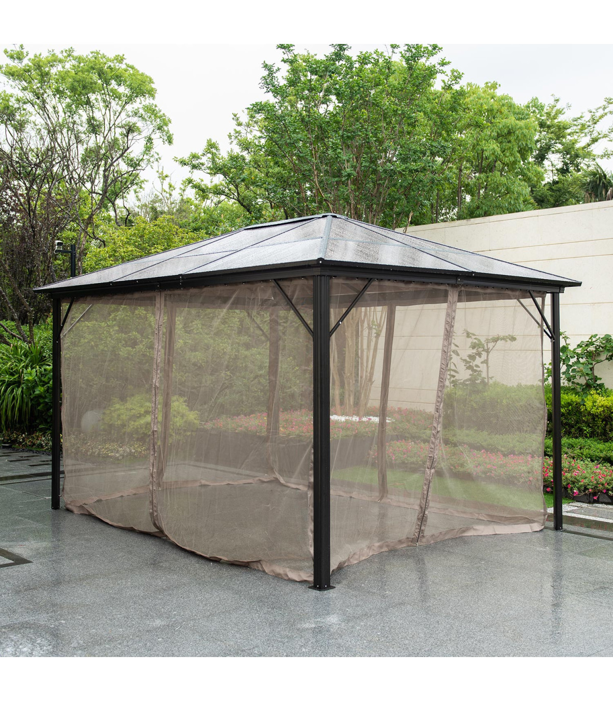 Шатёр ZURICH 3x4xH2,63м с крышей из поликарбоната, коричневый. Элегантный и функциональный шатёр/садовый павильон обеспечивает защиту и тень как от небольшого дождя, так и от палящего солнца и позволяет наслаждаться отдыхом на свежем воздухе независимо от погоды и времени. Со всех сторон шатрa бежевые шторы из полиэстера и нейлоновые москитные сетки. Основная конструкция шатрa выполнена из алюминия. Все детали рамы окрашены порошковой краской. Панели крыши: поликарбонат 6 мм. Это атмосферостойкий, экологически чистый материал, который предлагает уникальное сочетание долговечности и превосходной ударопрочности. Материал также обладает хорошей светопроницаемостью и стойкостью к высоким температурам. Размеры боковых стоек 76х76мм, балок крыши 109х50мм, нервюр 41х38мм. ВНИМАНИЕ: в случае экстремальных погодных условий или штормового предупреждения нельзя оставлять шатёр без присмотра. Сильный ветер, дождь или снег могут повредить шатёр. ХРАНЕНИЕ: для продления срока службы шатрa рекомендуем в конце летнего сезона разобрать ее и хранить в сухом, хорошо проветриваемом помещении. Если шатёр остается на зиму, следите, чтобы на крыше не скапливался снег. Как можно скорее уберите лишний снег. По окончании летнего сезона снимите москитные сетки и шторы. Очистите и высушите шторы перед хранением.