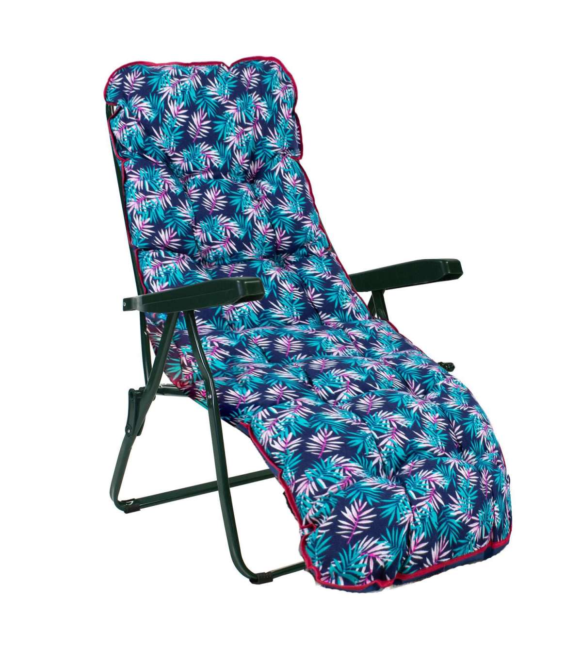 Lamamistool BADEN-BADEN istmekattega. Tooli raam on valmistatud metallist ja viimistletud rohelise pulbervärviga. Istme ja seljatoe toestuseks on siksak vedrud. Lamamistooli selja- ja jalatugi on reguleeritav. Jalatugi liigub seljatoega sünkroonis. Seljatoe reguleerimiseks tõstke käetoed üles, valige sobiv asend ja fikseerige käetoed. Võimalik on valida viie erineva positsiooni vahel. Kokkupanduna on tooli lihtne kaasa võtta või hoiustada. Toolikate BADEN-SUMMER 48x165cm, lehemotiivid sinisel taustal. Kattematerjal: 20% polüester, 80% puuvill. Täidis: purustatud poroloon. Tooli üldmõõdud on 57x86xH100cm. Istme laius 47cm, istme sügavus 50cm, istme kõrgus 43cm. Kaalupiirang 100kg. Tooli mõõdud kokkupanduna 57x88x14cm. HOOLDUS: toolikatte masinpesu ei ole soovitatav.