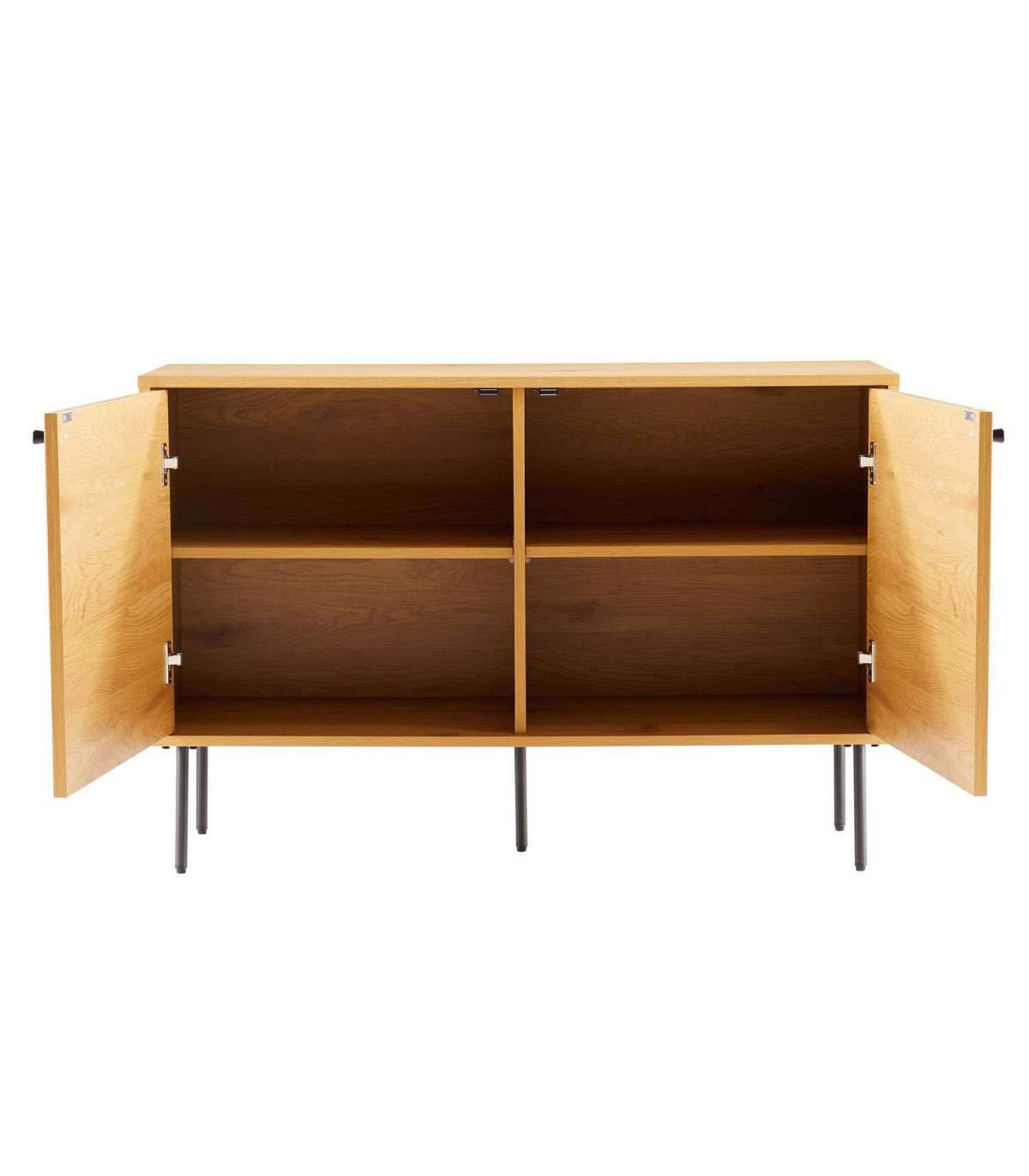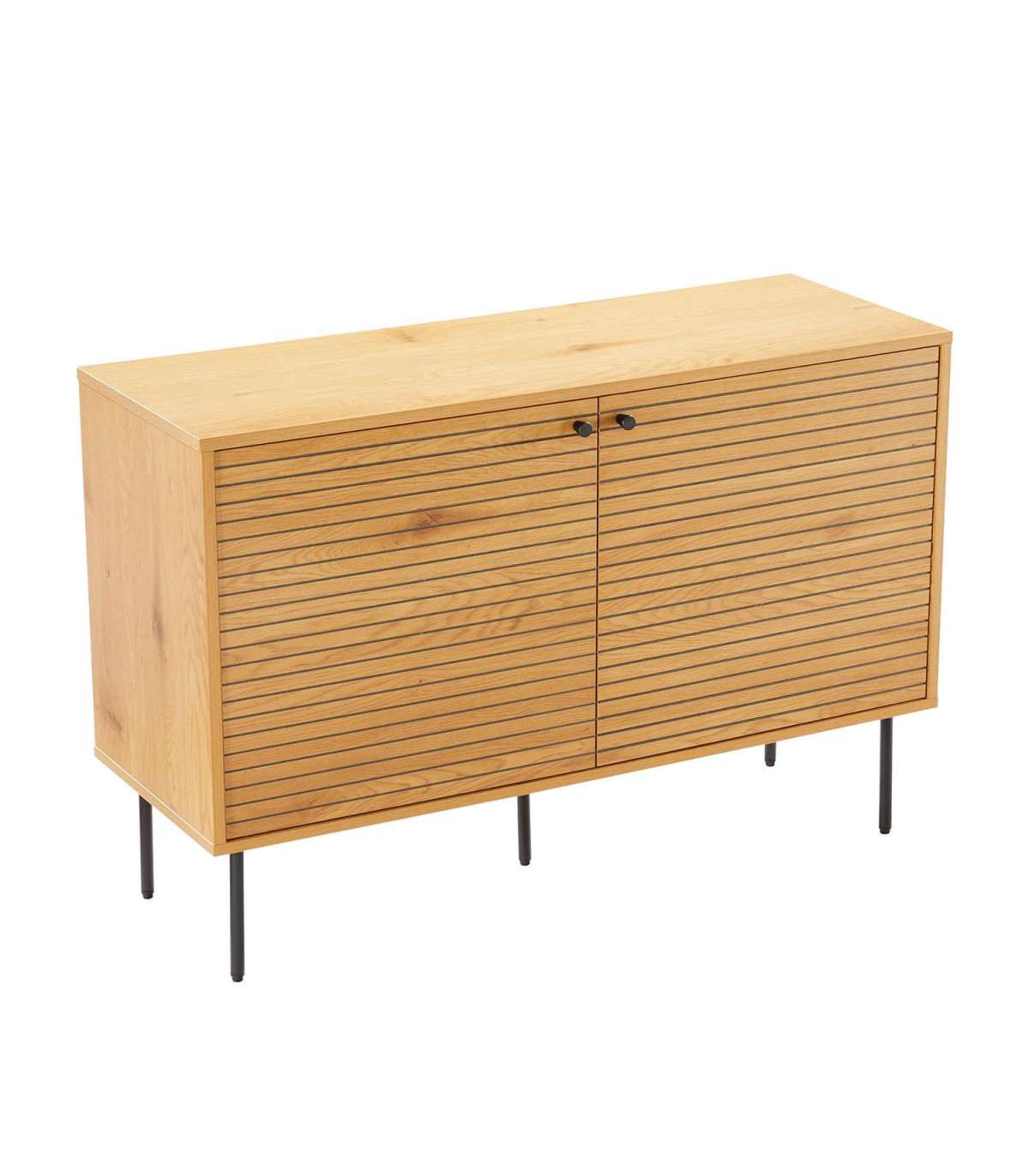 Kummut LINE 2-uksega 110x40xH74cm. Kummut on valmistatud tammedekooriga melamiinplaadist. Efektsed reljeefse pinnaga triibulised uksed on valmistatud mustast MDF plaadist, mida kaunistavad tammevärvi kitsad liistud. Kummuti metallist jalad on viimistletud musta pulbervärviga.