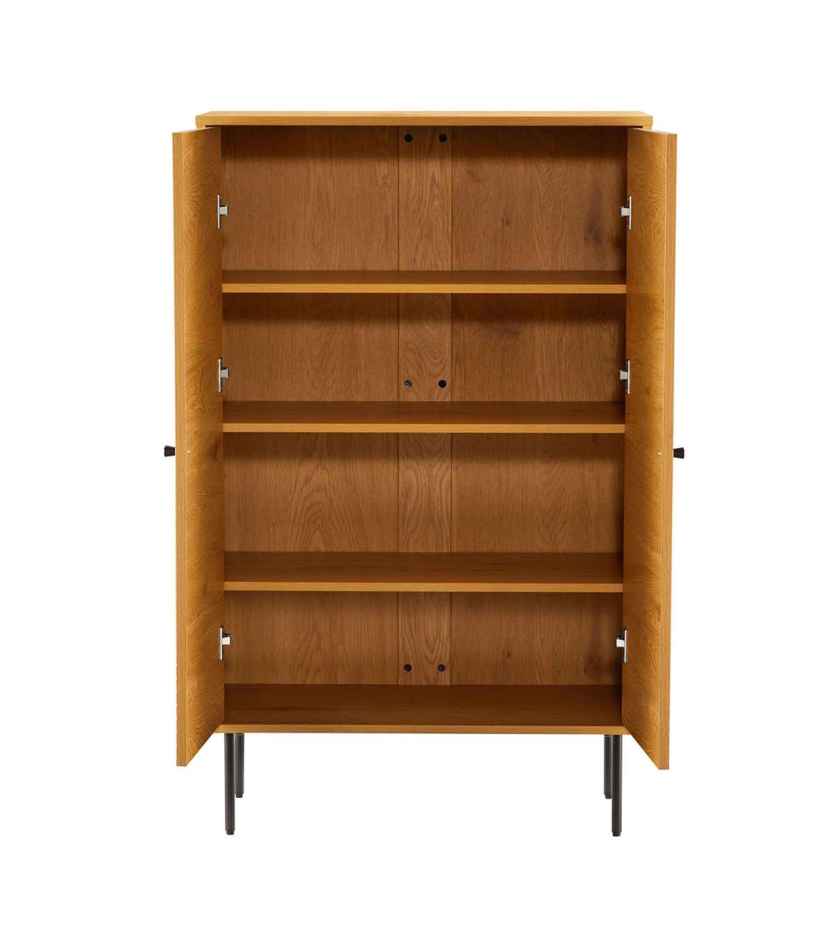 Kapp LINE 80x40xH130cm. Kapp on valmistatud tammedekooriga melamiinplaadist. Efektsed reljeefse pinnaga triibulised uksed on valmistatud mustast MDF plaadist, mida kaunistavad tammevärvi kitsad liistud. Kapi metallist jalad on viimistletud musta pulbervärviga.