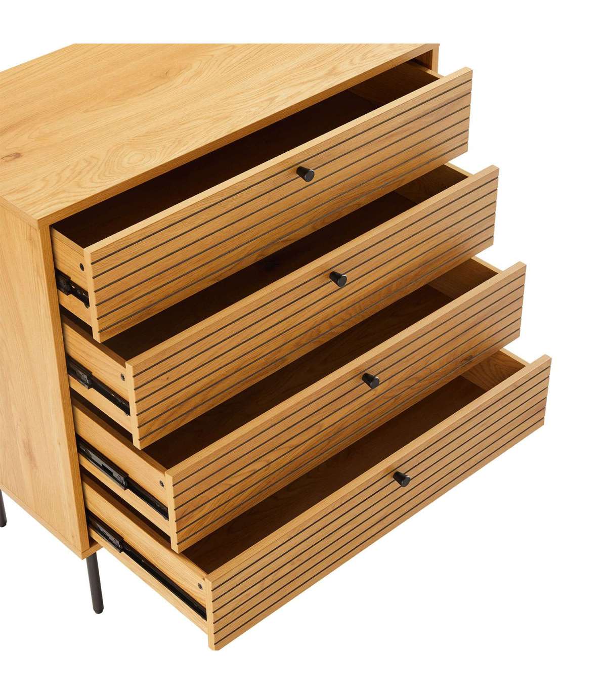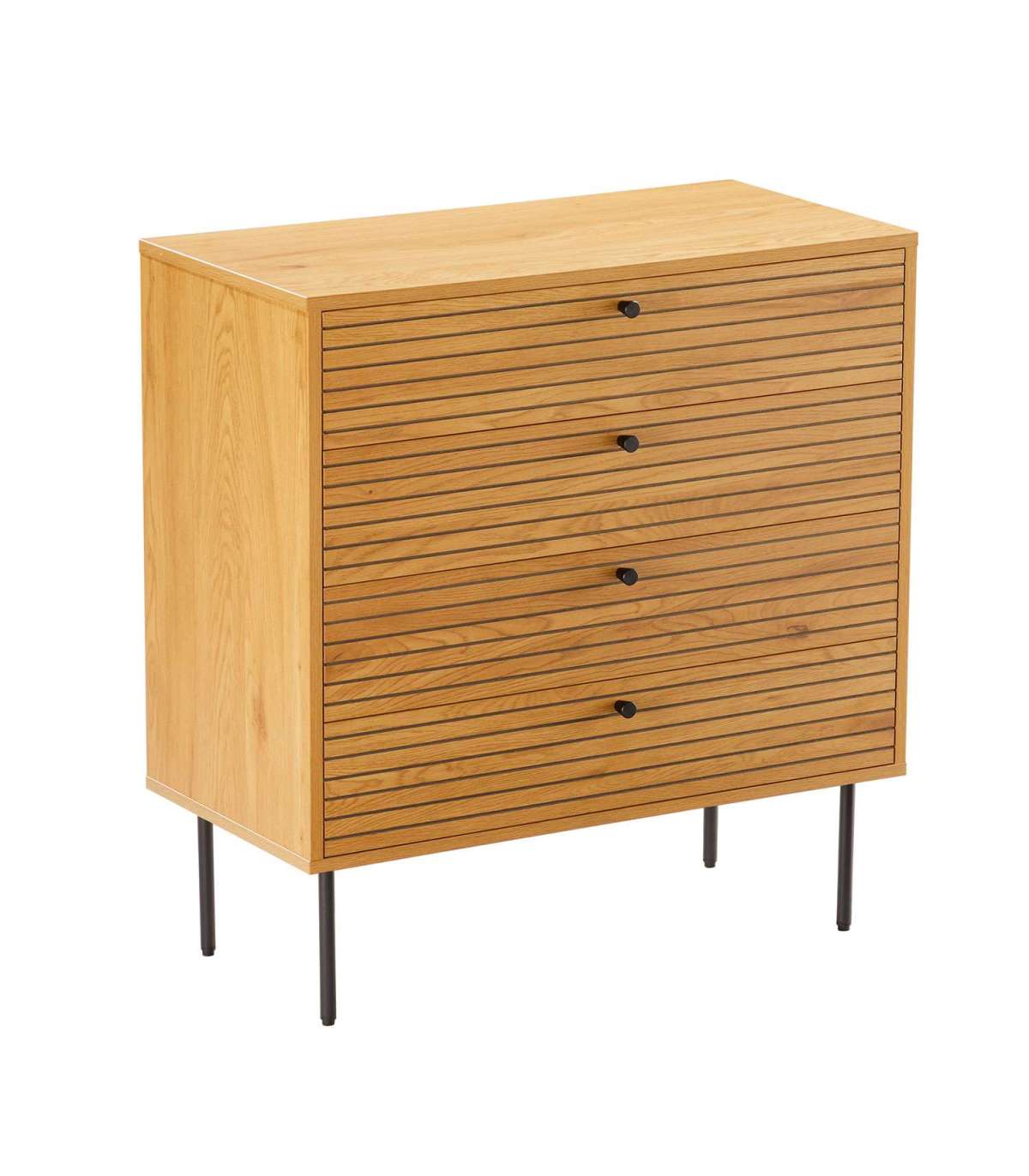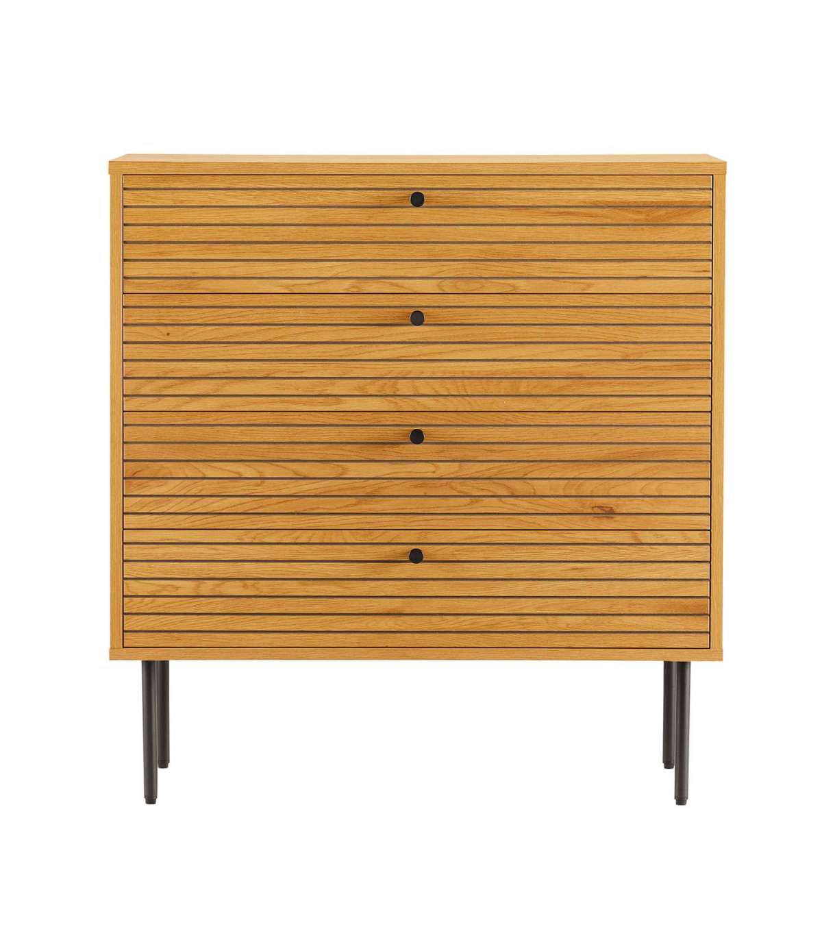 Kummut LINE 4-sahtliga 80x40xH85cm. Kummut on valmistatud tammedekooriga melamiinplaadist. Efektsed reljeefse pinnaga triibulised sahtlite esipaneelid on valmistatud mustast MDF plaadist, mida kaunistavad tammevärvi kitsad liistud. Kummuti metallist jalad on viimistletud musta pulbervärviga.