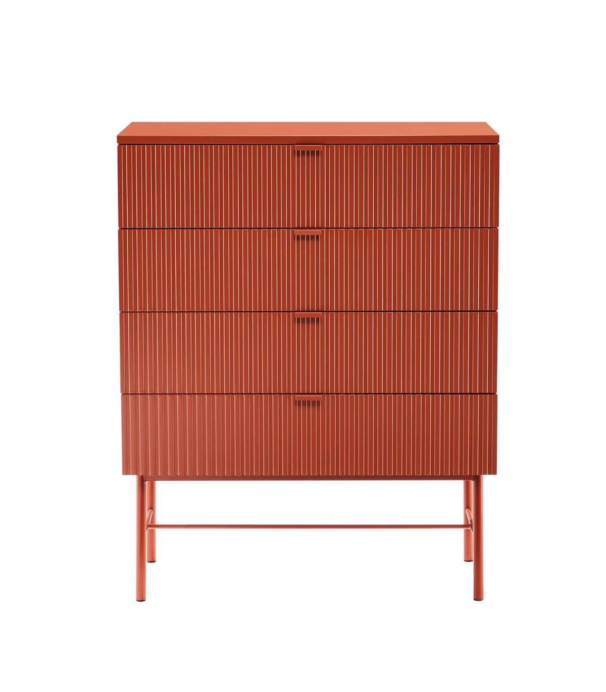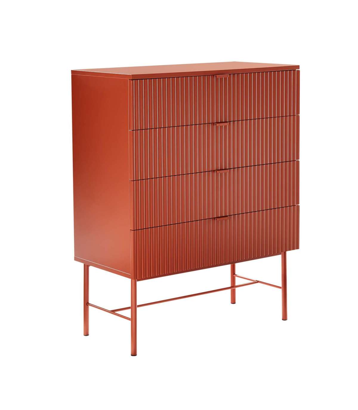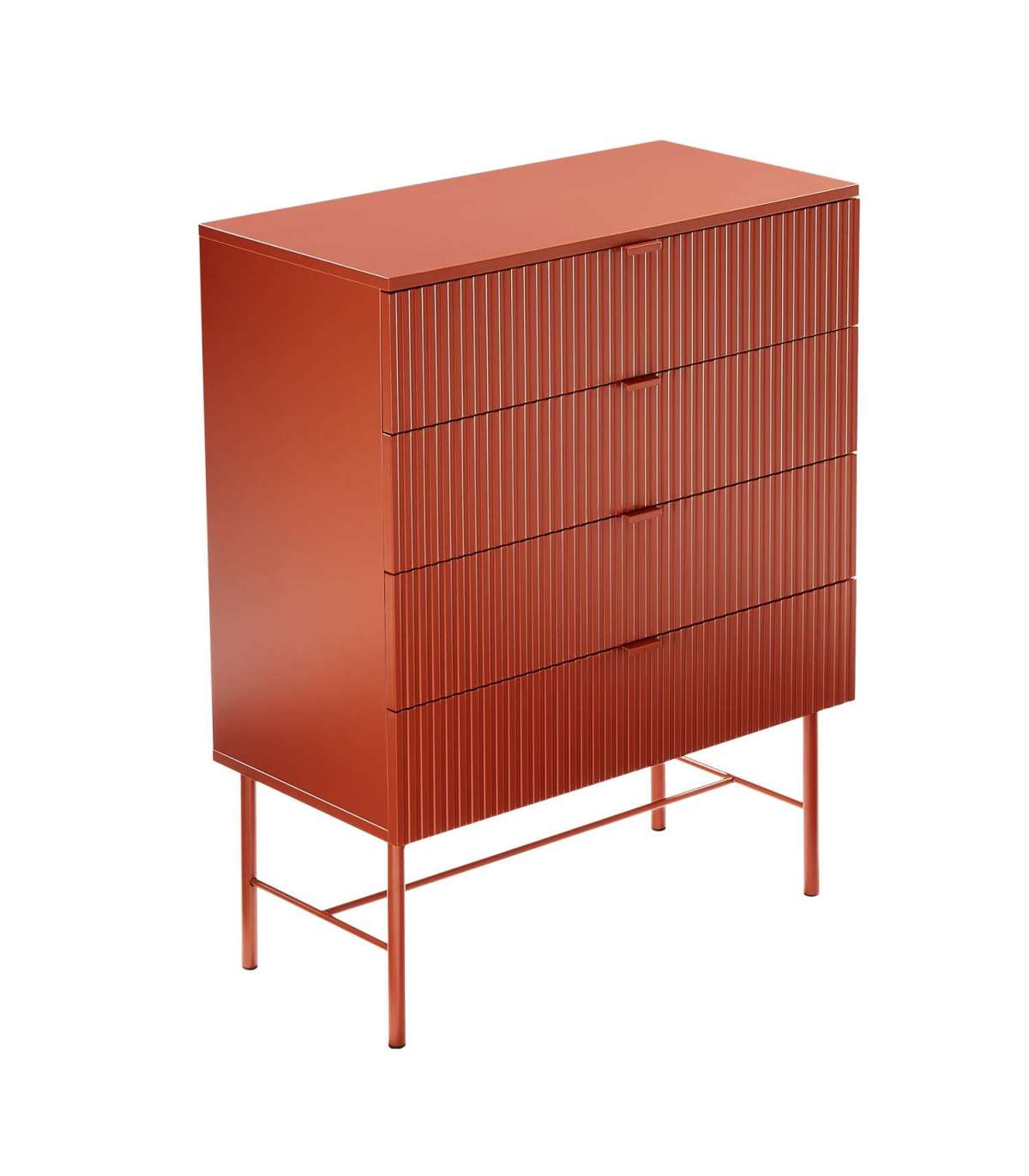 Kummut SEQUENCE 4-sahtliga 79x40xH100cm, sügispruun. Kummuti korpus on valmistatud MDF plaadist. Reljeefse pinnaga triibulised sahtlite esipaneelid annavad tootele omanäolise ja trendika välimuse. Sahtlid liiguvad metallsiinidel. Kummut on viimistletud vastupidava polüuretaanvärviga. Metallist alusraam ja jalad on viimistletud pulbervärviga.