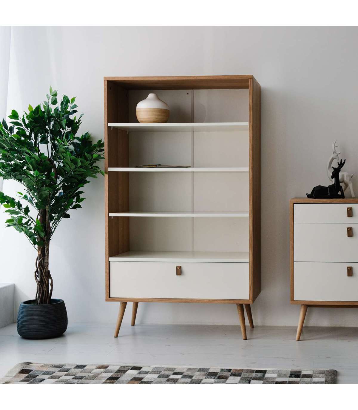 Полка HELENA WHITE с ящиком 80x40xH140см, материал: МДФ, цвет: натуральный/белый. Материал: 18мм МДФ-пластины, покрытой шпоном дуба. Фасадные панели ящиков и полки: МДФ, окрашенный в белый цвет. Ручка из кожзаменителя. Дубовые ножки.