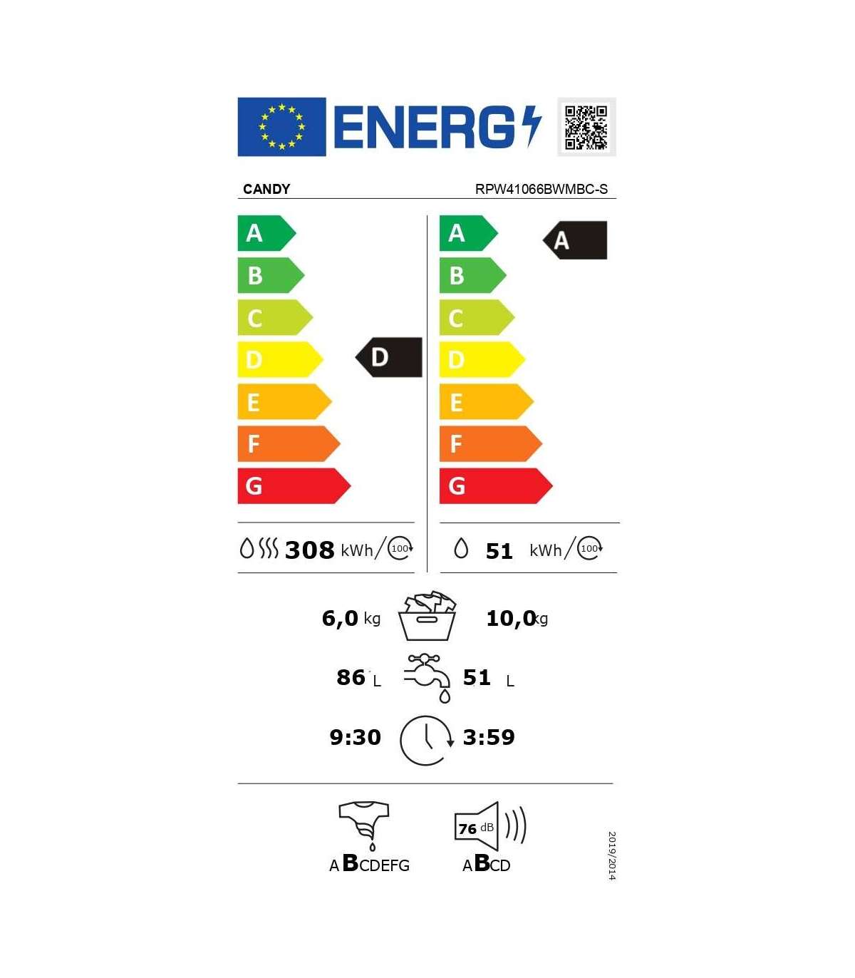Candy | Washing Machine with Dryer | RPW41066BWMBC-S | Energy efficiency class D | Front loading | Washing capacity 10 kg | 1400 RPM | Depth 58 cm | Width 60 cm | TFT | Drying system | Drying capacity 6 kg | Steam function | White