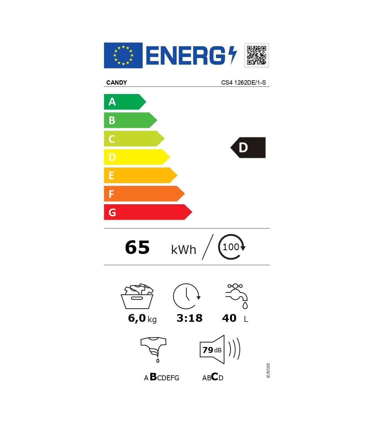 Candy Washing Machine CS4 1262DE/1-S Energy efficiency class D Front loading Washing capacity 6 kg 1200 RPM |