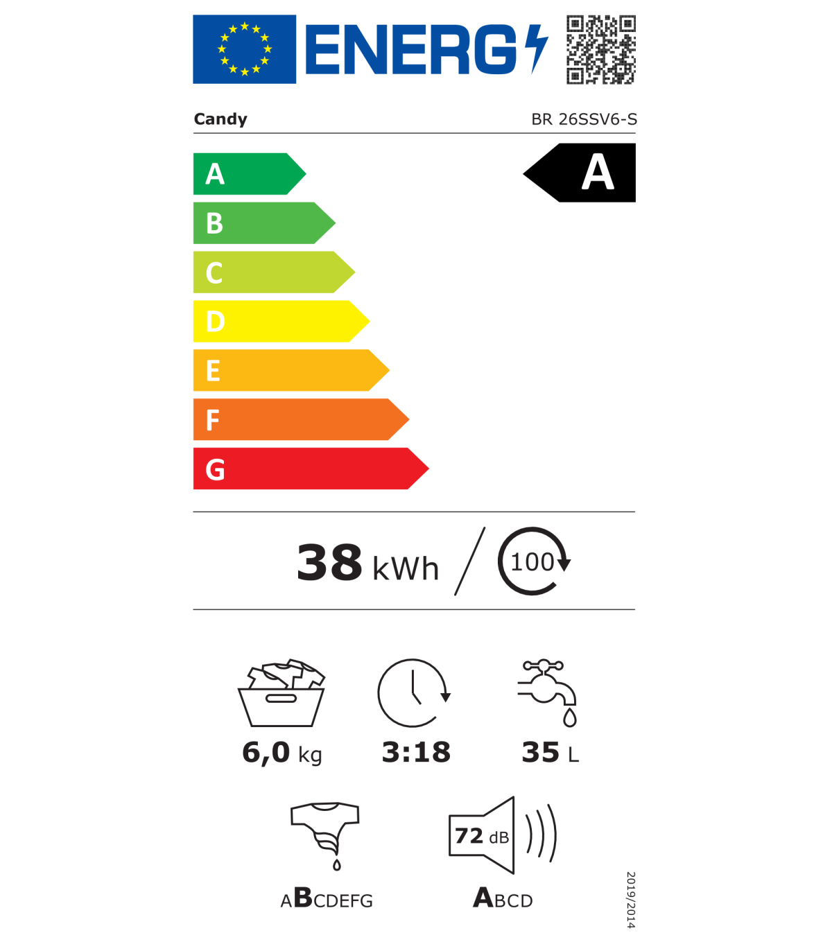 Candy BR 26SSV6-S Washing Machine, A, Front loading, Depth 42 cm, 6 kg, White