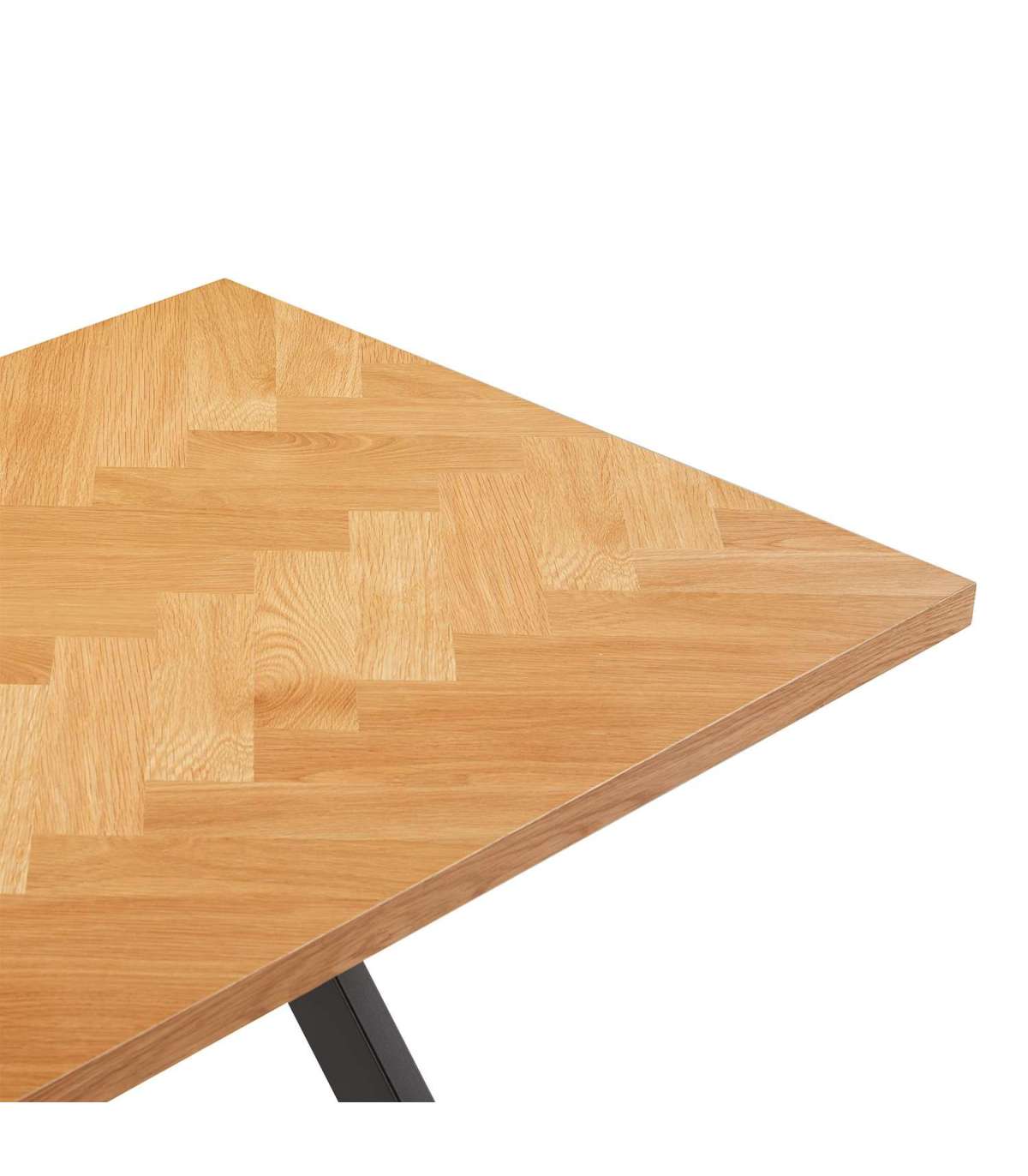 Söögilaud ROWAN 200x90xH75cm, kalasaba tamm. Lauaplaat: kalasaba mustrisse laotud naturaalse tammespooniga mööbliplaat. Lauaplaat on viimistletud heleda lakiga. Laua ristjalad on valmistatud metallist ja viimistletud musta pulbervärviga.